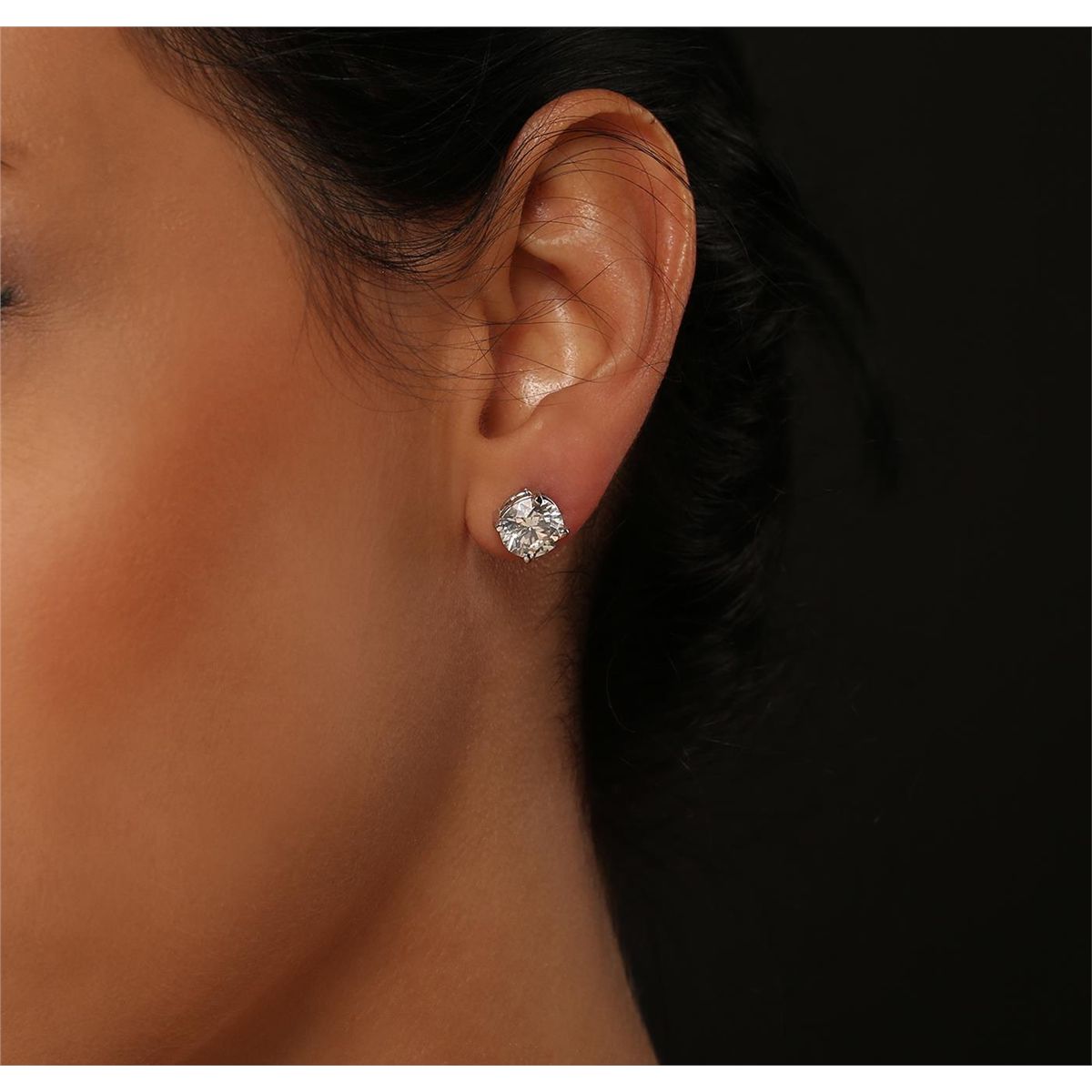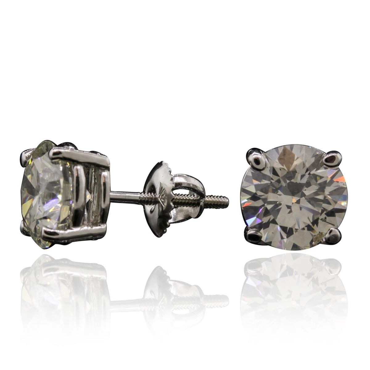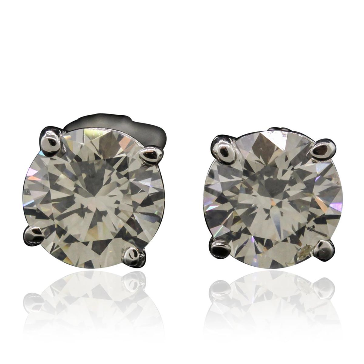 One pair electronically tested 14KT white gold Ladies cast stud earrings with screw backs with a bright polish finish. Condition is new. Identified with markings of "14K". Containing: One prong set round brilliant cut diamond, measuring 8.27 - 8.34 x 5.05mm (depth est.) approximate weight of 2.16ct. Clarity: SI-2. Color: H, Cut is Good. One prong set round brilliant cut diamond, measuring 8.40 - 8.33 x 5.02mm (depth est.) approximate weight of 2.17ct. Clarity: SI-2. Color: I, Cut is Good. EGL USA GEM ID# US 911348441D. All diamonds are graded in the mounting, unless otherwise stated. Total Weight of Diamonds 4.33ct. Total Weight of Earrings 3.10 grams. GGLAppraised at $103,735.00.