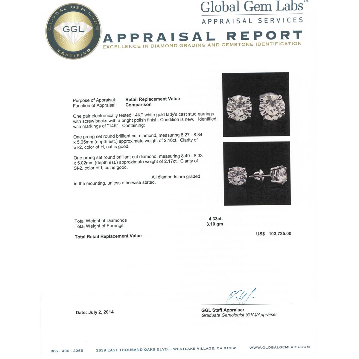 One pair electronically tested 14KT white gold Ladies cast stud earrings with screw backs with a bright polish finish. Condition is new. Identified with markings of "14K". Containing: One prong set round brilliant cut diamond, measuring 8.27 - 8.34 x 5.05mm (depth est.) approximate weight of 2.16ct. Clarity: SI-2. Color: H, Cut is Good. One prong set round brilliant cut diamond, measuring 8.40 - 8.33 x 5.02mm (depth est.) approximate weight of 2.17ct. Clarity: SI-2. Color: I, Cut is Good. EGL USA GEM ID# US 911348441D. All diamonds are graded in the mounting, unless otherwise stated. Total Weight of Diamonds 4.33ct. Total Weight of Earrings 3.10 grams. GGL Appraised at $103,735.00.