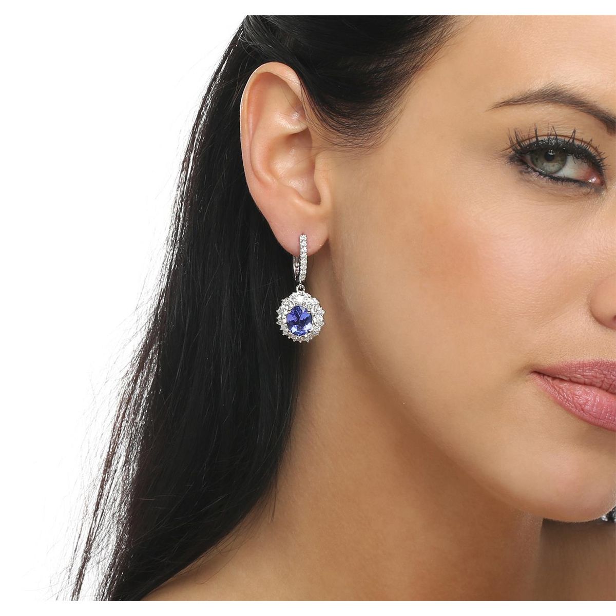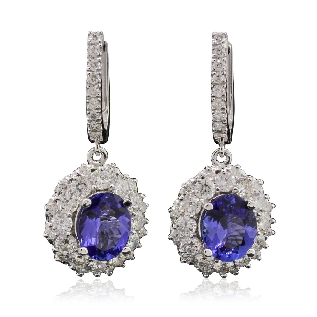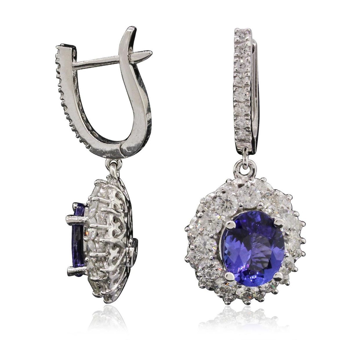 One pair electronically tested 14KT white gold ladies combination cast & assembled dangle earrings with hinged clip backs with a bright polish finish. Condition is new. Identified with markings of "14K". Containing: Two prong set oval modified brilliant cut natural tanzanites, measuring 9.85 x 7.71 x 4.23mm, approximate. Total Weight of 4.36ct., clarity is eye clean, type I, medium light, moderately strong, bluish violet color, (GIA bV 4/4), cut is good. Twenty-Four prong set round brilliant cut diamonds, measuring 3.00 - 3.00 x 1.80mm (depth est.) approximate. Total Weight of 24 Stones = 2.37ct. Clarity: SI-2 to I-2. Color: I - K, Cut is Good. Forty prong set round brilliant cut diamonds, measuring 1.40 - 1.40 x 0.84mm (depth est.) approximate. Total Weight of 40 Stones = 0.40ct. Clarity: SI-2 to I-1. Color: I - J, Cut is Good. All colored gemstones are graded in the mounting, unless otherwise stated. All diamonds and colored gemstones are graded in the mounting, unless otherwise stated. Total Weight of Colored Stones 4.36ct. Total Weight of Diamonds 2.77ct. Total Weight of Earrings 10.40 grams. GGL Appraised at $15,070.00.