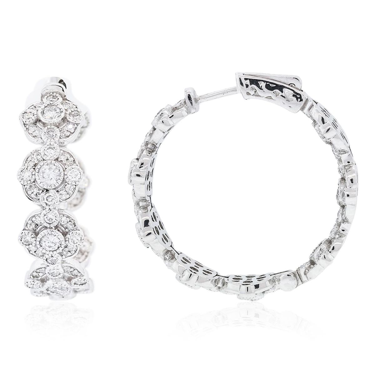 One pair electronically tested 14KT white gold ladies cast hoop earrings with hinged clip backs with a bright polish finish. Identified with markings of "K14". Condition is new. Containing: Sixteen gypsy set round brilliant cut diamonds, measuring 3.00 - 3.00 x 3.00mm (depth est.) approximate total weight of 16 Stones = 2.64ct. Clarity: SI-1 to SI-2. Color: I - J, Cut is Good. One Hundred Ninety-Two prong set round brilliant cut diamonds, measuring 1.50 - 1.20 x 0.81mm (depth est.) approximate total weight of 192 Stones = 1.73ct. Clarity: I-1 to I-2. Color: H - I, Cut is Good. All diamonds are graded in the mounting, unless otherwise stated. Total Weight of Diamonds 4.36ct. Total Weight of Earrings 12.10 grams. GGL Appraised at $11,135.00.