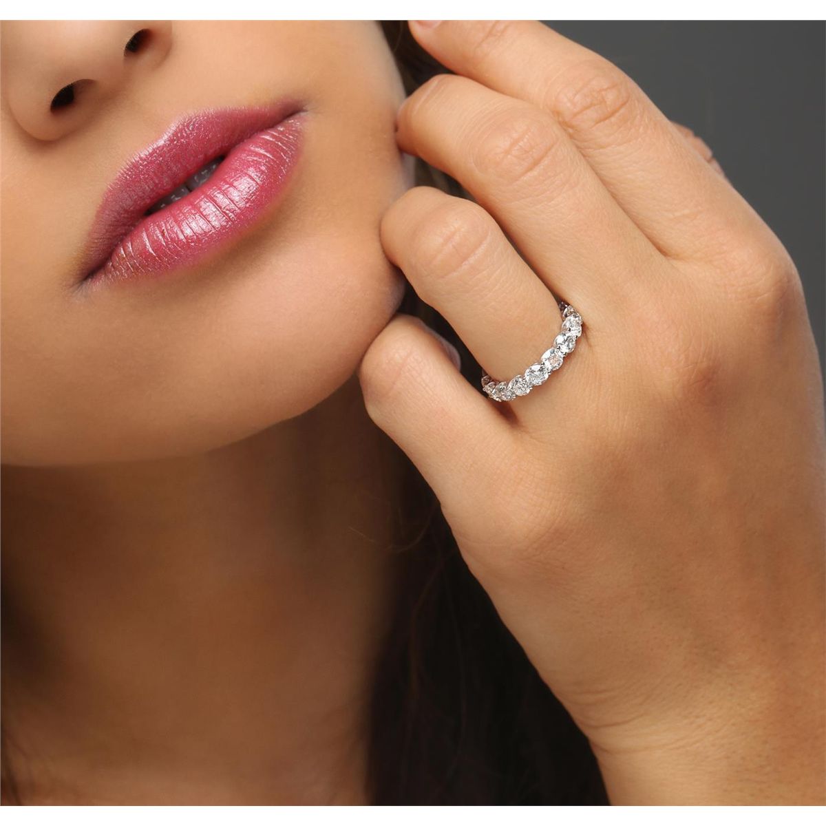 One electronically tested 14KT white gold ladies cast diamond eternity ring with a bright polish finish. The ring features a continuous four millimeter wide diamond ribbon. Ring size 6.25. Condition is new, good workmanship. Containing: Sixteen prong set round brilliant cut diamonds, measuring 4.05 - 4.00 x 2.70mm (depth est.) approximate total weight of 16 Stones = 4.37ct. Graded in the setting. Clarity: I-1 to I-2. Color: H - J. Total Weight of Diamonds 4.37ct. Total Weight of Ring 2.31 grams. AIG Appraised at $12,410.00.