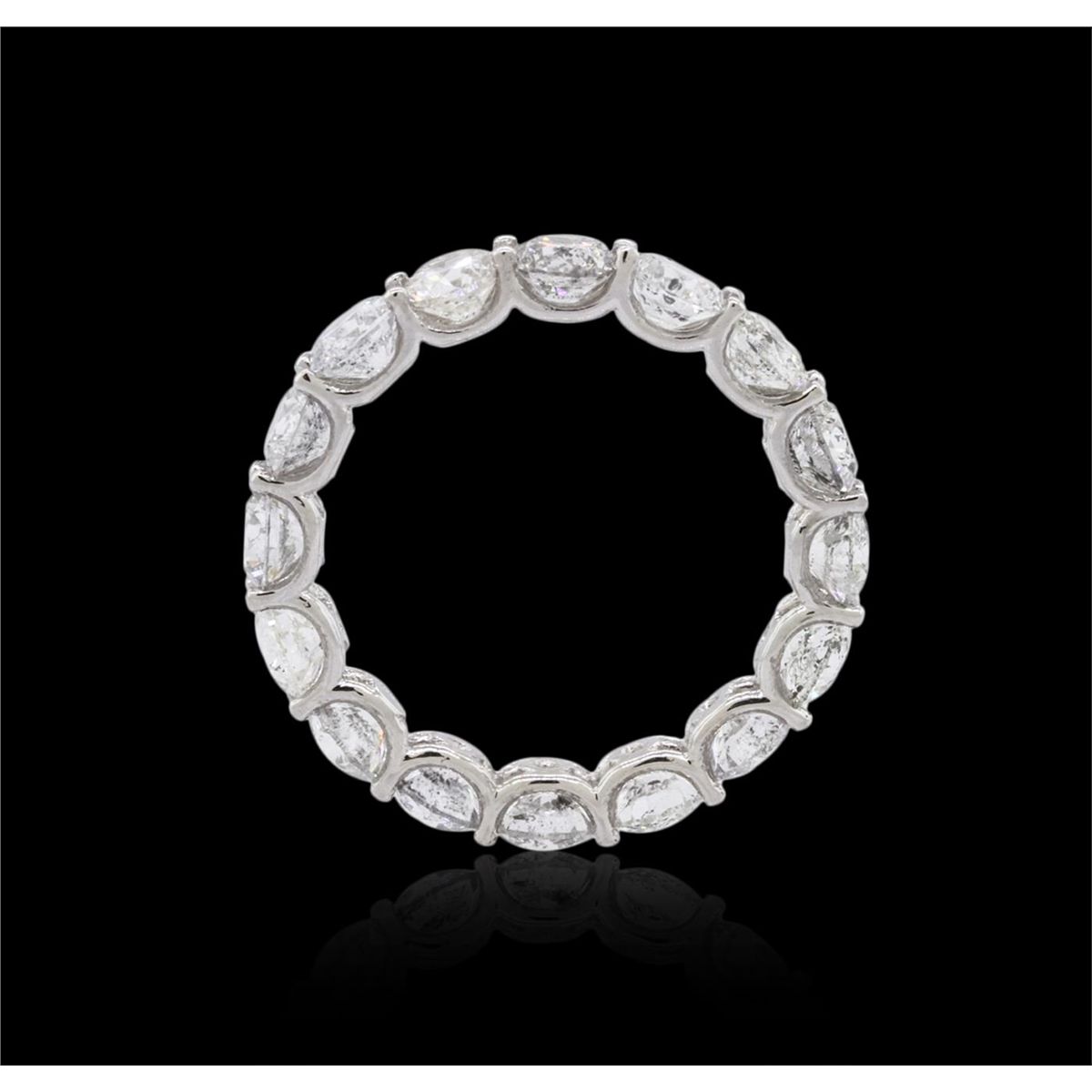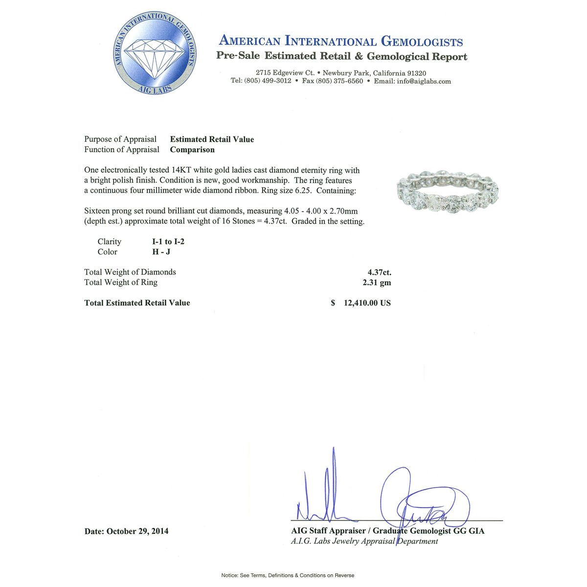 One electronically tested 14KT white gold ladies cast diamond eternity ring with a bright polish finish. The ring features a continuous four millimeter wide diamond ribbon. Ring size 6.25. Condition is new, good workmanship. Containing: Sixteen prong set round brilliant cut diamonds, measuring 4.05 - 4.00 x 2.70mm (depth est.) approximate total weight of 16 Stones = 4.37ct. Graded in the setting. Clarity: I-1 to I-2. Color: H - J. Total Weight of Diamonds 4.37ct. Total Weight of Ring 2.31 grams. AIG Appraised at $12,410.00.