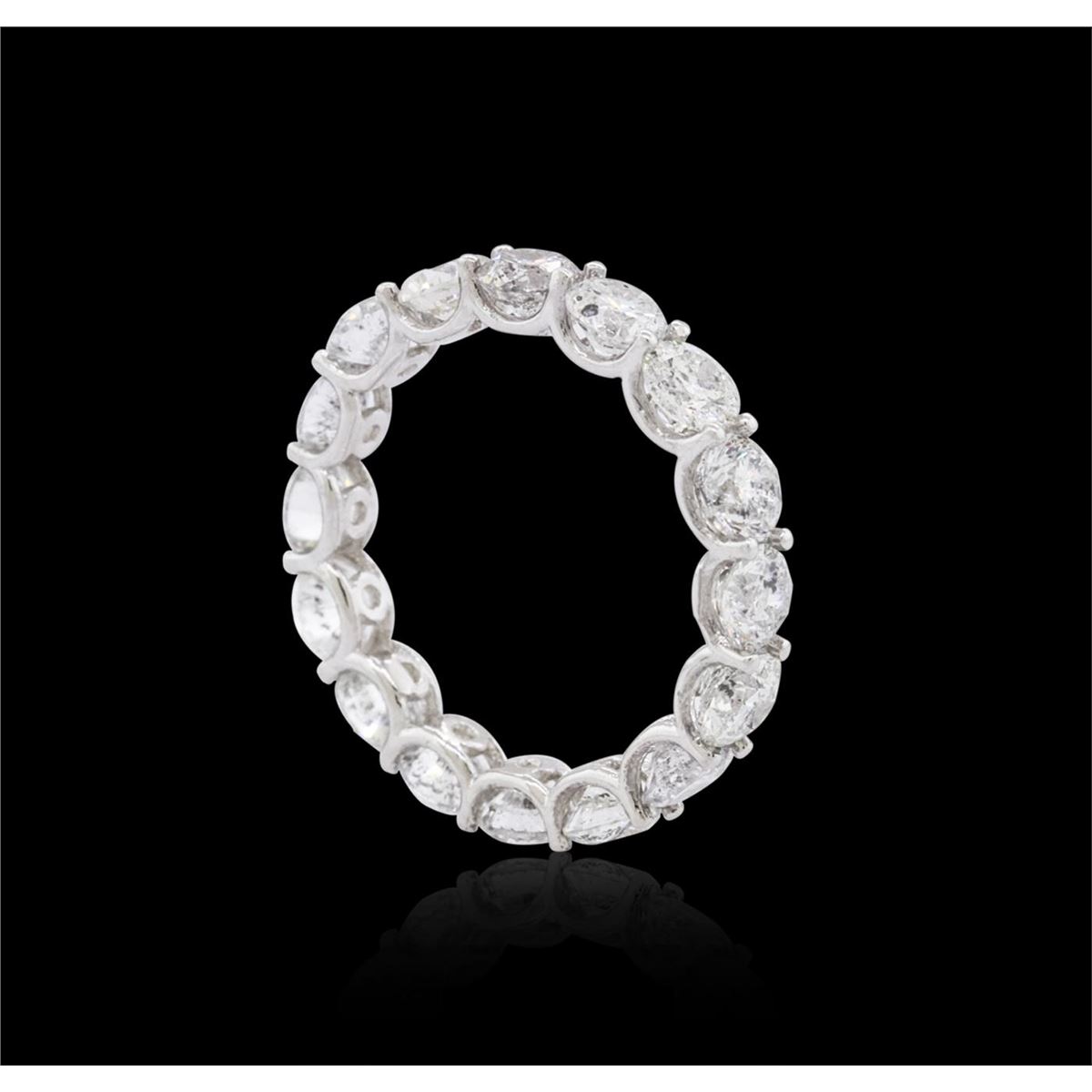 One electronically tested 14KT white gold ladies cast diamond eternity ring with a bright polish finish. The ring features a continuous four millimeter wide diamond ribbon. Ring size 6.25. Condition is new, good workmanship. Containing: Sixteen prong set round brilliant cut diamonds, measuring 4.05 - 4.00 x 2.70mm (depth est.) approximate total weight of 16 Stones = 4.37ct. Graded in the setting. Clarity: I-1 to I-2. Color: H - J. Total Weight of Diamonds 4.37ct. Total Weight of Ring 2.31 grams. AIG Appraised at $12,410.00.