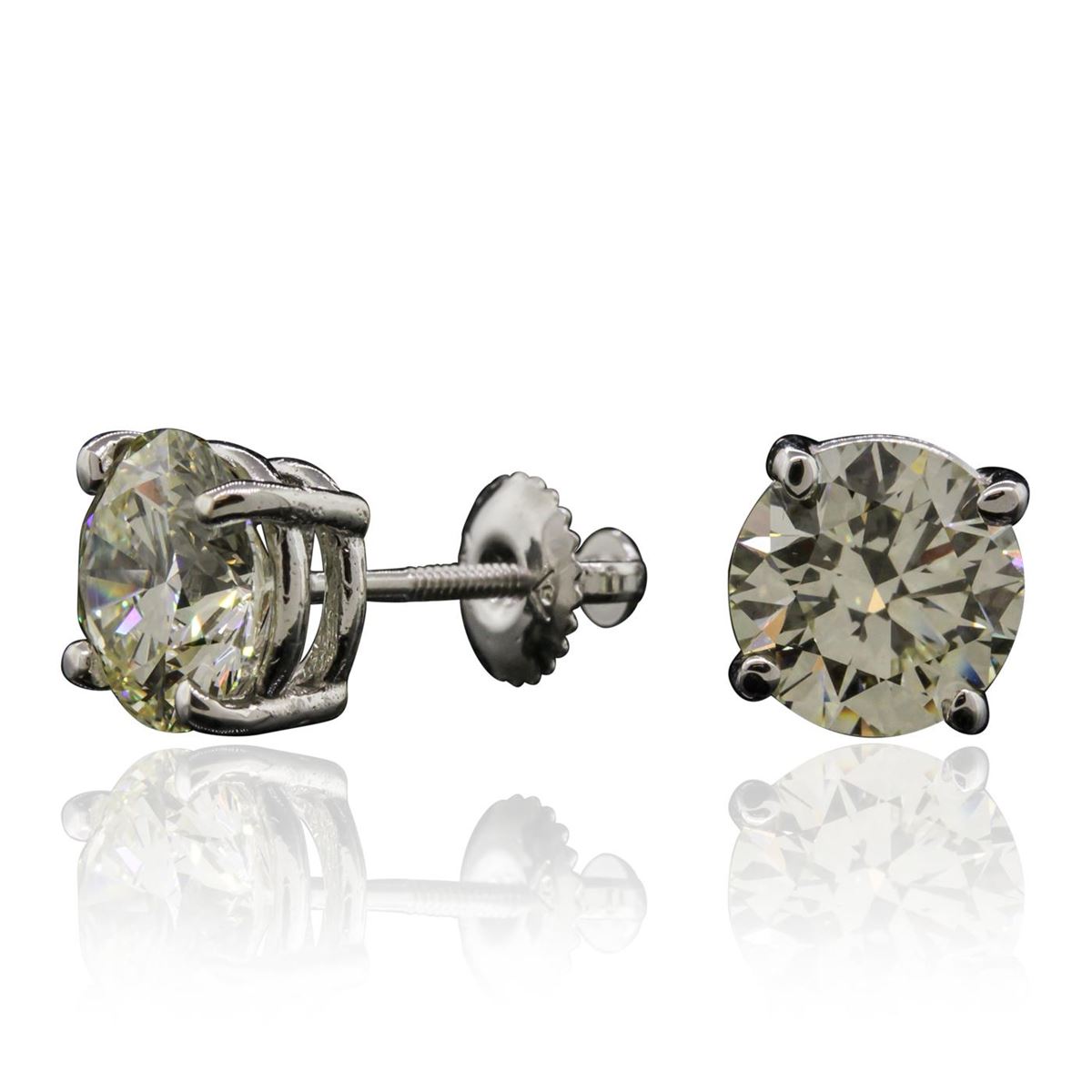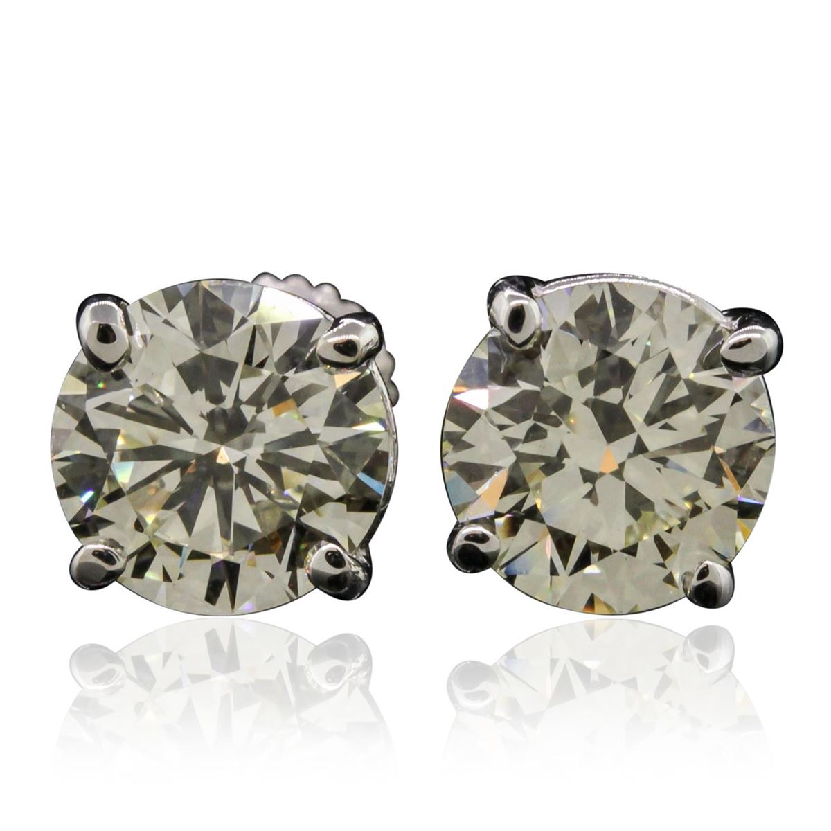One pair electronically tested 14KT white gold Ladies cast stud earrings with screw backs with a bright polish finish. Condition is new. Identified with markings of "14K". Containing: One prong set round brilliant cut diamond, measuring 8.31 - 8.31 x 5.05mm (depth est.) approximate weight of 2.20ct. Clarity: VS-1. Color: J, Cut is Good. One prong set round brilliant cut diamond, measuring 8.27 - 8.27 x 4.96mm (depth est.) approximate weight of 2.17ct. Clarity: VS-1. Color: K, Cut is Good. EGL USA GEM ID# US 911348442D. All diamonds are graded in the mounting, unless otherwise stated. Total Weight of Diamonds 4.37ct. Total Weight of Earrings 3.20 grams. GGL Appraised at $101,625.00.
