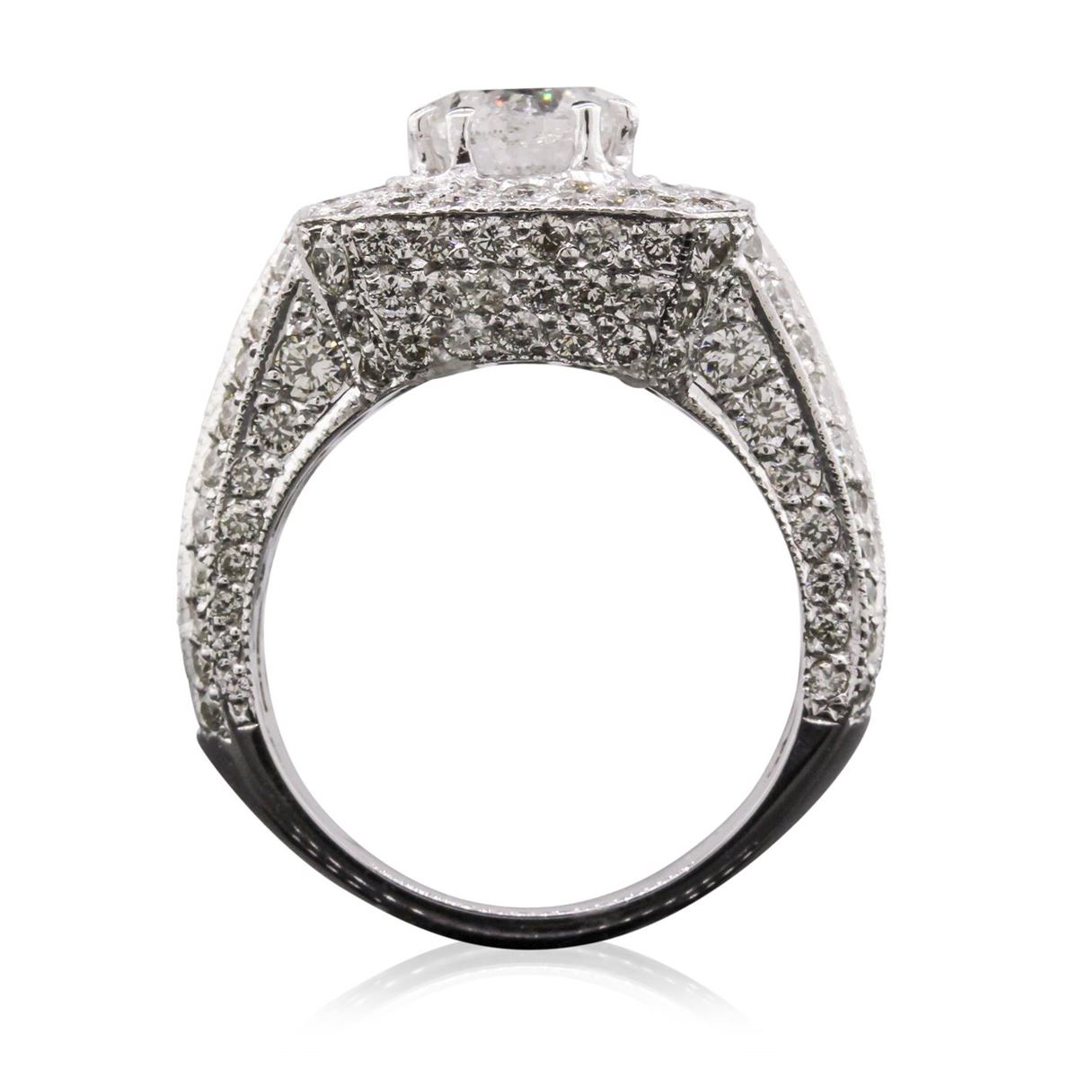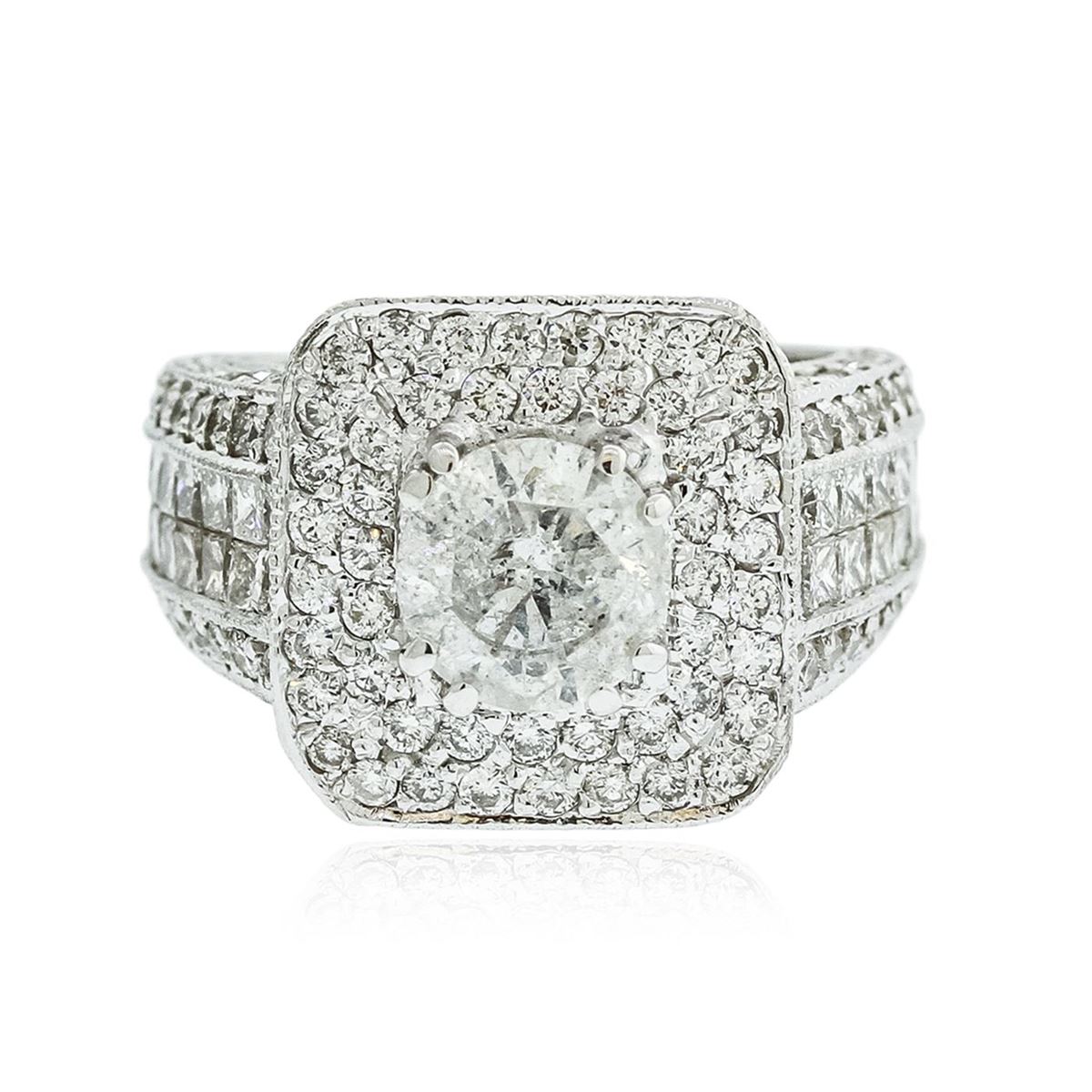 One electronically tested 14KT white gold Ladies combination cast & assembled engagement ring with a bright polish finish. Condition is new. Identified with markings of "14K". Containing: One prong set round brilliant cut diamond, measuring 7.20 - 7.20 x 4.66mm (depth est.) approximate weight of 1.47ct. Clarity: I-3. Color: G, Cut is Good. One Hundred Sixty-Nine bead set round brilliant cut diamonds, measuring 2.10 - 1.30 x 1.02mm (depth est.) approximate. Total Weight of 169 Stones = 1.55ct. Clarity: SI-1 to I-1. Color: H, Cut is Good. Thirty-Two invisible set princess cut diamonds, measuring 1.90 x 1.90 x 1.43mm (depth est.) approximate. Total Weight of 32 Stones = 1.35ct. Clarity: SI-1 to SI-2. Color: I - K, Cut is Good. Total Weight of Diamonds 4.38ct. Total Weight of Ring 9.80 grams. GGL Appraised at $19,020.00.