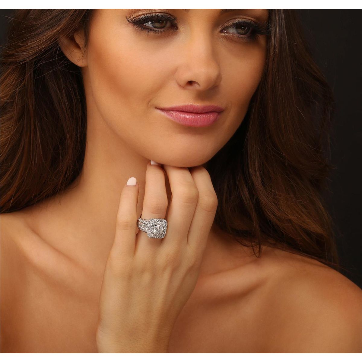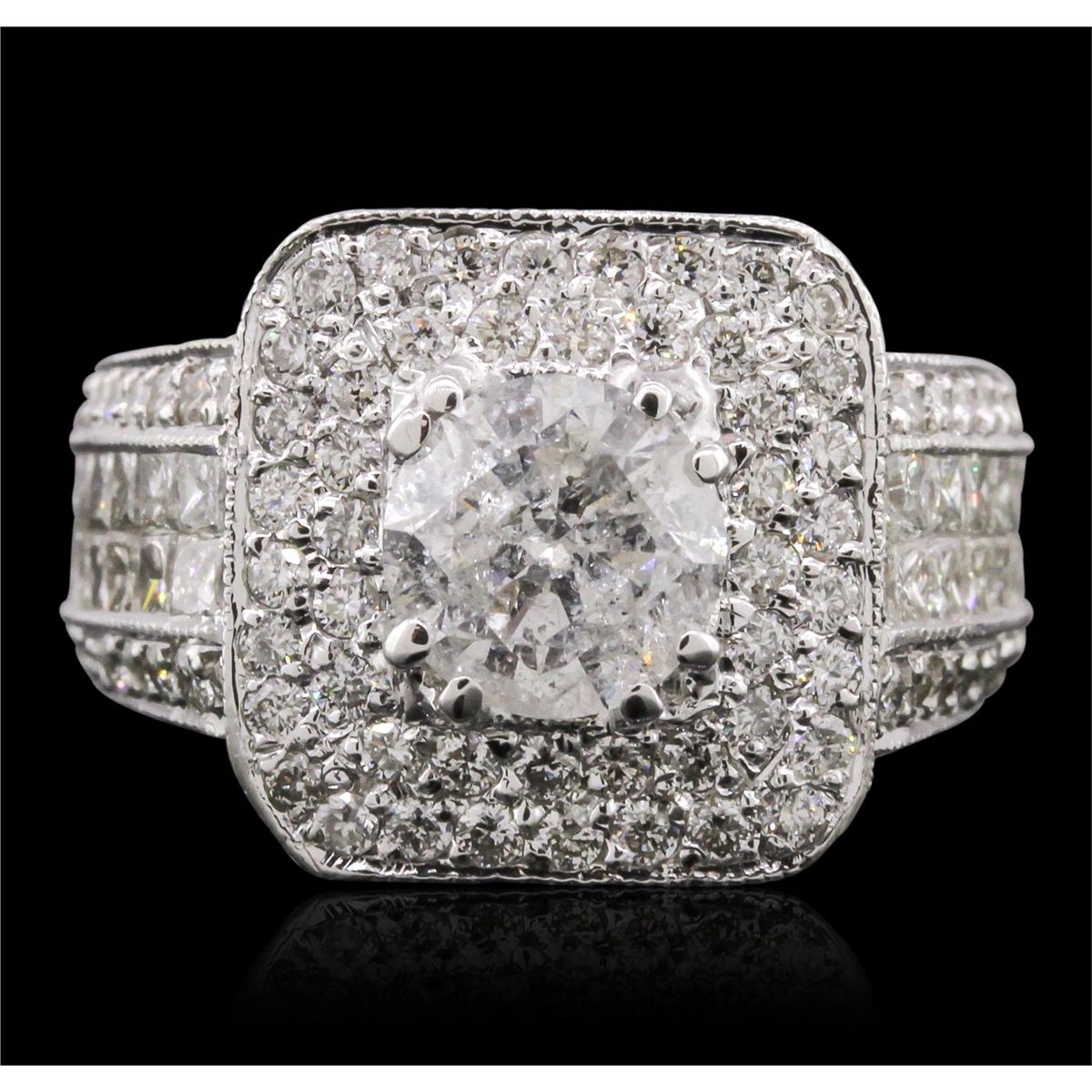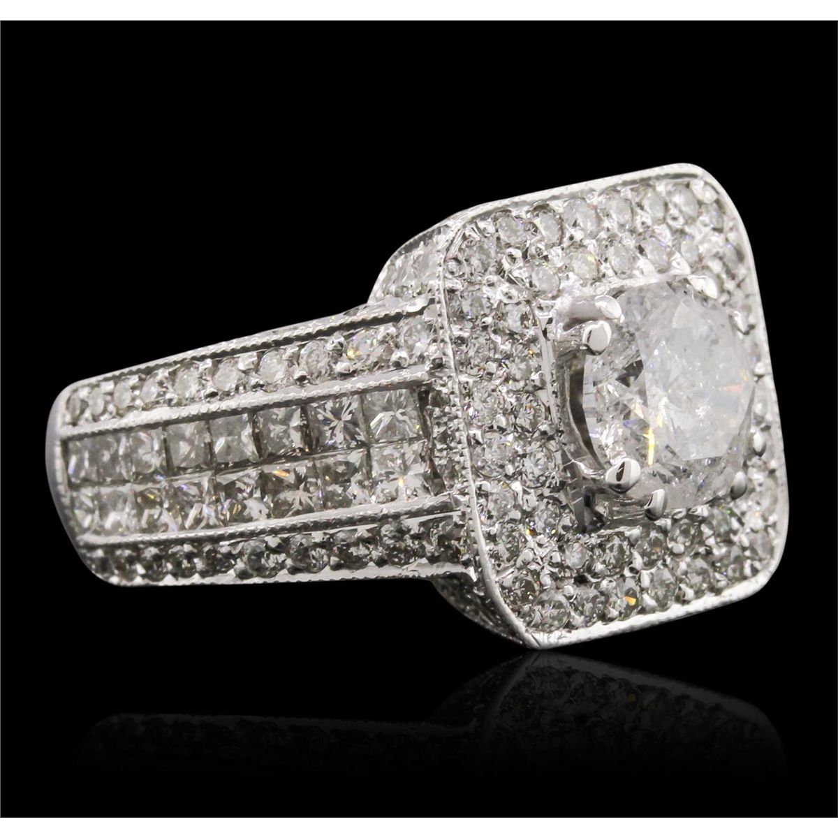 One electronically tested 14KT white gold Ladies combination cast & assembled engagement ring with a bright polish finish. Condition is new. Identified with markings of "14K". Containing: One prong set round brilliant cut diamond, measuring 7.20 - 7.20 x 4.66mm (depth est.) approximate weight of 1.47ct. Clarity: I-3. Color: G, Cut is Good. One Hundred Sixty-Nine bead set round brilliant cut diamonds, measuring 2.10 - 1.30 x 1.02mm (depth est.) approximate. Total Weight of 169 Stones = 1.55ct. Clarity: SI-1 to I-1. Color: H, Cut is Good. Thirty-Two invisible set princess cut diamonds, measuring 1.90 x 1.90 x 1.43mm (depth est.) approximate. Total Weight of 32 Stones = 1.35ct. Clarity: SI-1 to SI-2. Color: I - K, Cut is Good. Total Weight of Diamonds 4.38ct. Total Weight of Ring 9.80 grams. GGL Appraised at $19,020.00.