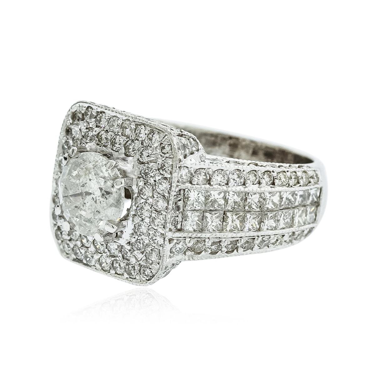 One electronically tested 14KT white gold Ladies combination cast & assembled engagement ring with a bright polish finish. Condition is new. Identified with markings of "14K". Containing: One prong set round brilliant cut diamond, measuring 7.20 - 7.20 x 4.66mm (depth est.) approximate weight of 1.47ct. Clarity: I-3. Color: G, Cut is Good. One Hundred Sixty-Nine bead set round brilliant cut diamonds, measuring 2.10 - 1.30 x 1.02mm (depth est.) approximate. Total Weight of 169 Stones = 1.55ct. Clarity: SI-1 to I-1. Color: H, Cut is Good. Thirty-Two invisible set princess cut diamonds, measuring 1.90 x 1.90 x 1.43mm (depth est.) approximate. Total Weight of 32 Stones = 1.35ct. Clarity: SI-1 to SI-2. Color: I - K, Cut is Good. Total Weight of Diamonds 4.38ct. Total Weight of Ring 9.80 grams. GGL Appraised at $19,020.00.