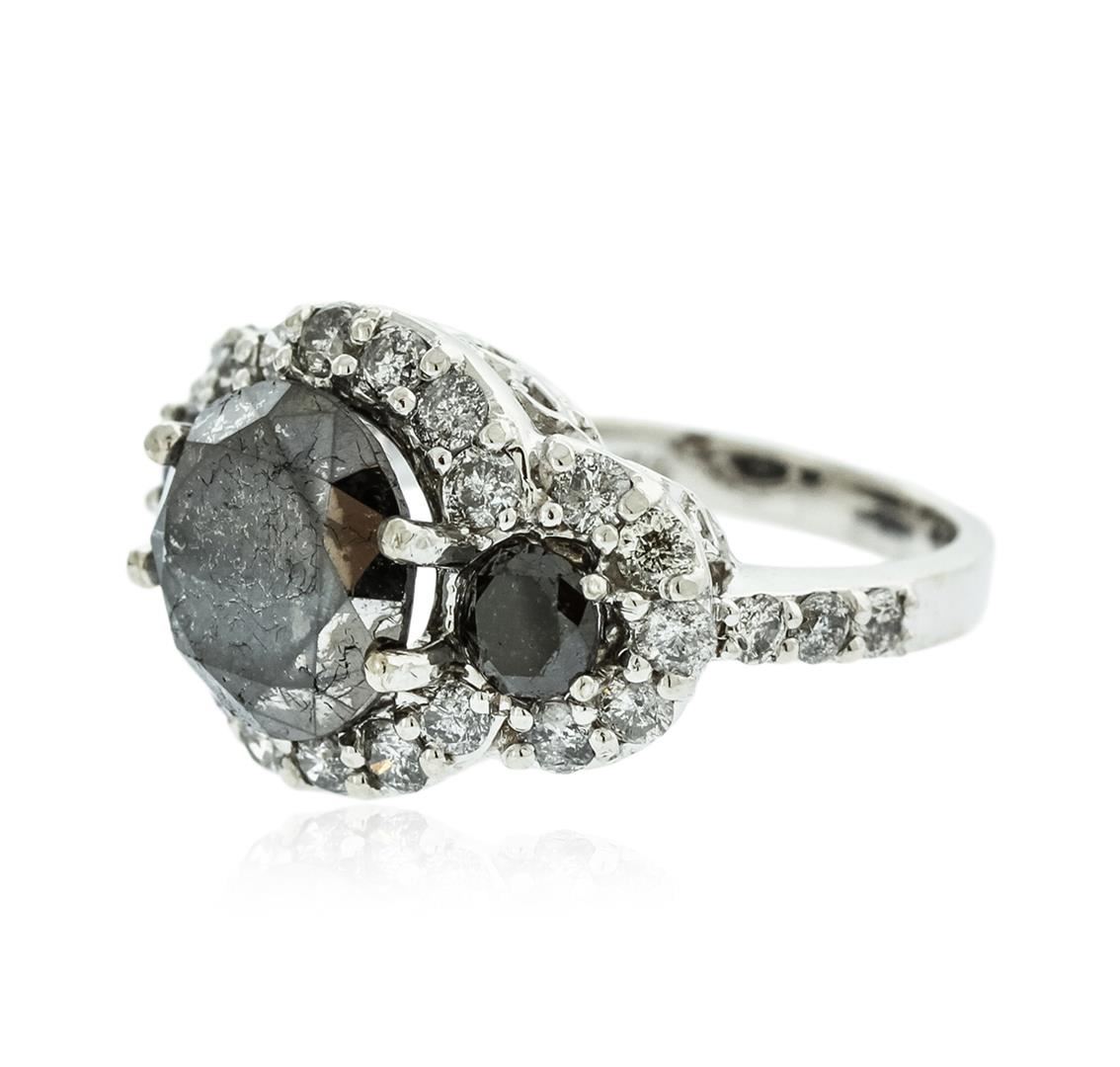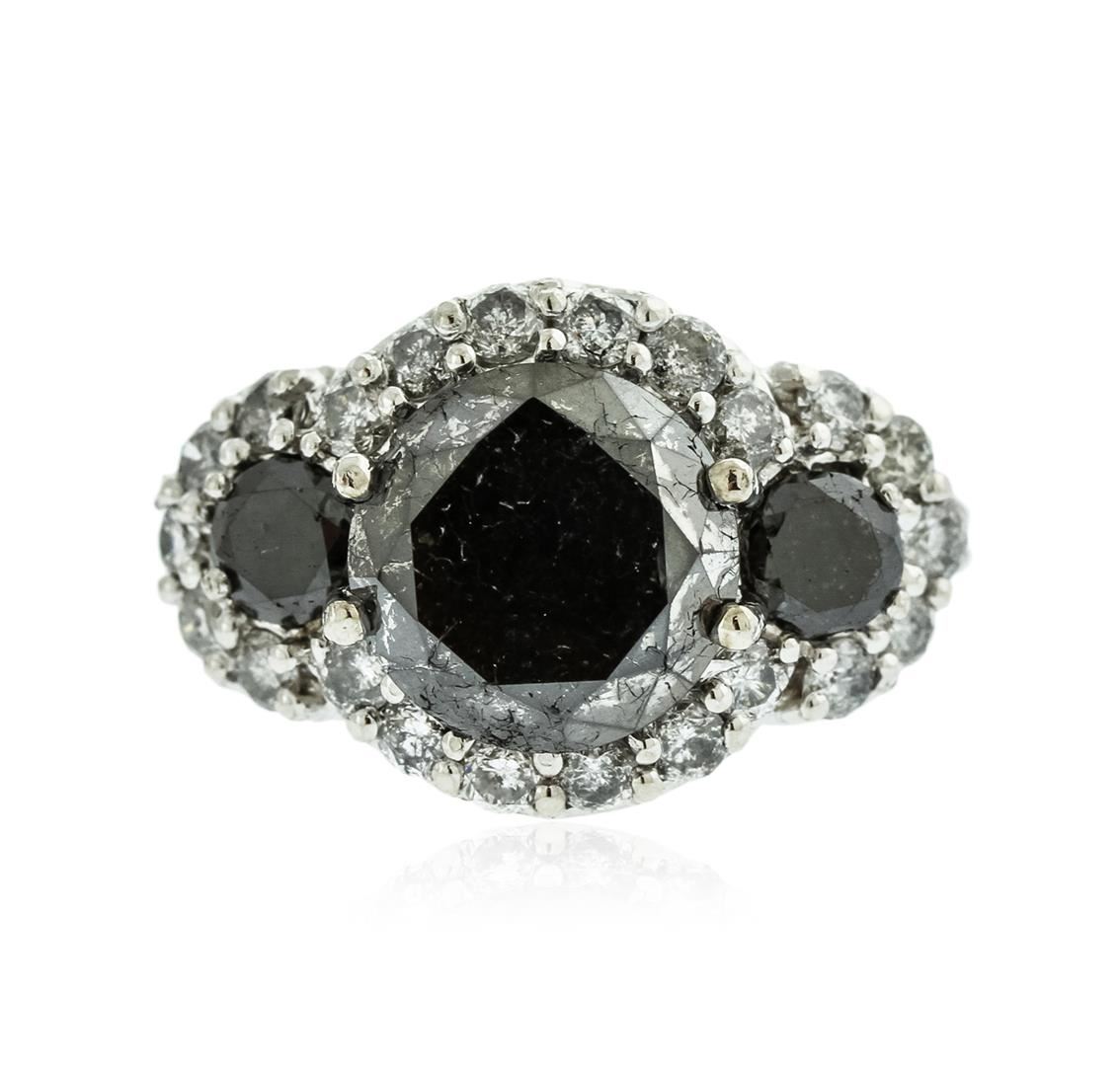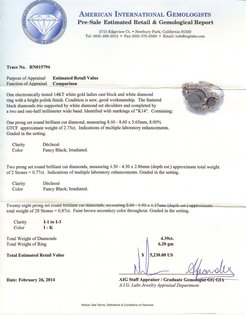 One electronically tested 14KT white gold ladies cast black and white diamond ring with a bright polish finish. The featured black diamonds trio supported by white diamond set shoulders and completed by a two and one-half millimeter wide band. Identified with markings of "K14". Condition is new, good workmanship. Containing: One prong set round brilliant cut diamond, measuring 8.60 - 8.60 x 5.65mm, 8.00.%. GTCF approximate weight of 2.75ct. Indications of multiple laboratory enhancements. Graded in the setting. Clarity Déclassé‚. Color: Fancy Black; Irradiated. Two prong set round brilliant cut diamonds, measuring 4.50 - 4.30 x 2.86mm (depth est.) approximate. Total Weight of 2 Stones = 0.77ct. Indications of multiple laboratory enhancements. Graded in the setting. Clarity Déclassé‚. Color: Fancy Black; Irradiated. Twenty-Eight prong set round brilliant cut diamonds, measuring 2.00 - 1.90 x 1.17mm (depth est.) approximate. Total Weight of 28 Stones = 0.87ct. Faint brown secondary color throughout. Graded in the setting. Clarity: I-1 to I-3. Color: I - K. Total Weight of Diamonds 4.39ct. Total Weight of Ring 6.20gm. AIG Appraised at $5,230.00.