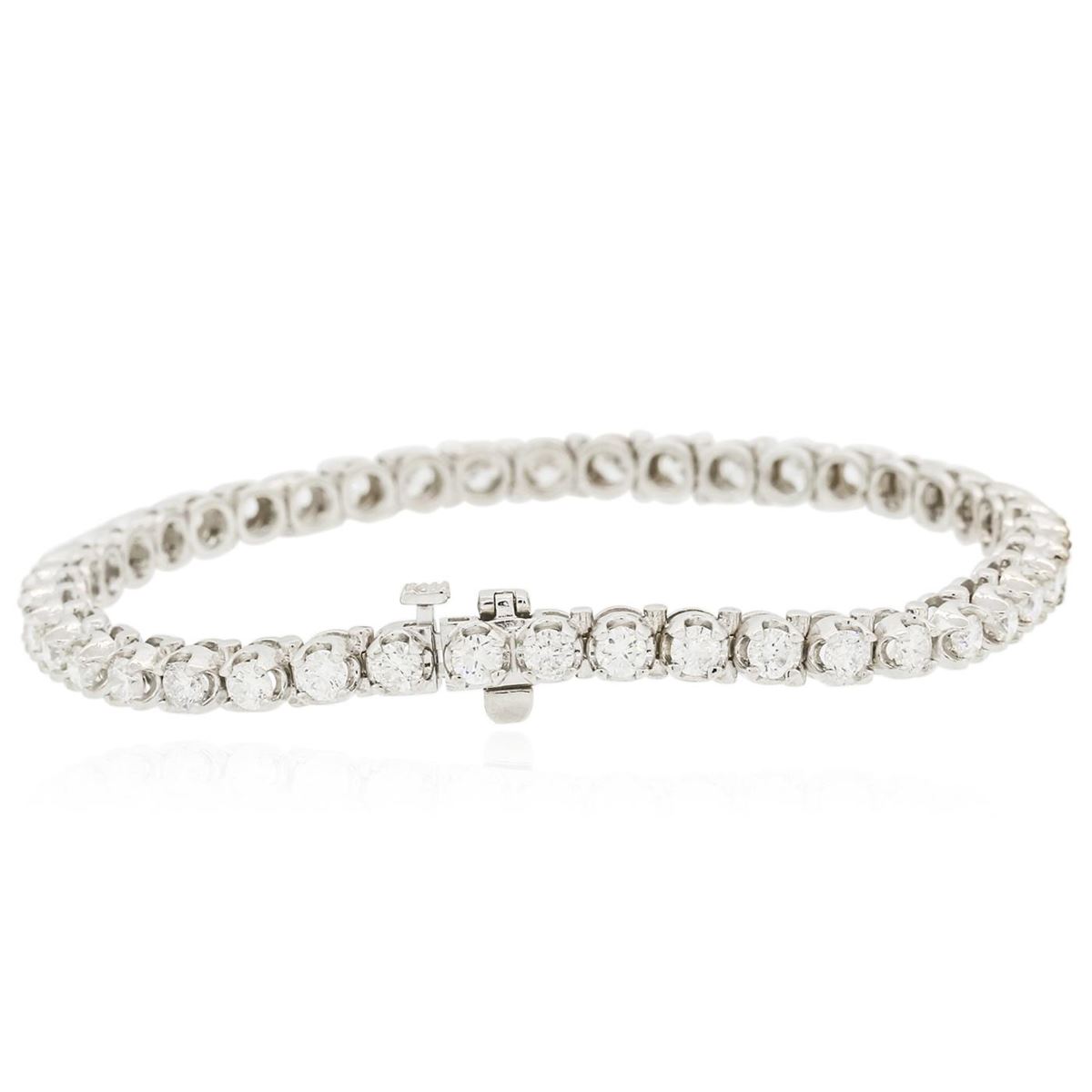 One electronically tested 14KT white gold ladies combination cast & assembled tennis bracelet with a hidden box clasp with a bright polish finish. Condition is new. Measurements: 7" in length. Identified with markings of "14K". Containing: Forty-Two prong set round brilliant cut diamonds, measuring 3.00 - 3.00 x 1.80mm (depth est.) approximate total weight of 42 Stones = 4.40ct. Clarity: SI-2 to I-2. Color: I - J, Cut is Good. All diamonds are graded in the mounting, unless otherwise stated. Total Weight of Diamonds 4.40ct. Total Weight of Bracelet 14.60 grams. GGL Appraised at $14,950.00.