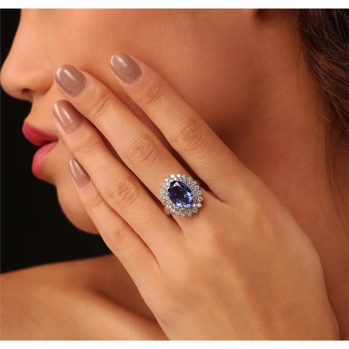 One electronically tested 14KT white gold Ladies cast ring with a bright polish finish. Condition is new. Identified with markings of "14K". Containing: One prong set oval modified brilliant cut natural tanzanite, measuring 12.00 x 10.00 x 6.49mm, approximate weight of 4.40ct., clarity is eye clean, type I, medium, very slightly grayish, bluish violet color, (GIA bV 5/3), cut is very good. Colored gemstones are presumed to have been subjected to commonly used color/clarity enhancement processes. Forty prong set round brilliant cut diamonds, measuring 2.00 - 1.50 x 1.05mm (depth est.) approximate. Total Weight of 40 Stones = 1.08ct. Clarity: SI-2 to I-1. Color: H - I, Cut is Good. Total Weight of Colored Stones 4.40ct. Total Weight of Diamonds 1.08ct. Total Weight of Ring 6.20 grams.