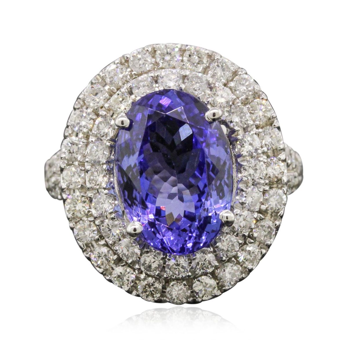 One electronically tested 14KT white gold ladies combination cast & assembled ring with a bright polish finish. Condition is new. Identified with markings of "K14". Containing: One prong set oval modified brilliant cut natural tanzanite, measuring 12.59 x 8.82 x 5.73mm, approximate weight of 4.40ct., clarity is eye clean, type I, medium, moderately strong, bluish violet color, (GIA bV 5/4), cut is good. Sixty-Eight prong set round brilliant cut diamonds, measuring 1.90 - 1.90 x 1.14mm (depth est.) approximate. Total Weight of 68 Stones = 1.71ct. Clarity: SI-2 to I-2. Color: J - L, Cut is Good. Colored gemstones are presumed to have been subjected to commonly used enhancement processes. All diamonds and colored gemstones are graded in the mounting, unless otherwise stated. Total Weight of Colored Stones 4.40ct. Total Weight of Diamonds 1.71ct. Total Weight of Ring 7.80 grams. GGL Appraised at $11,610.00.