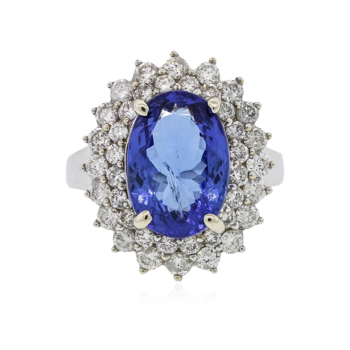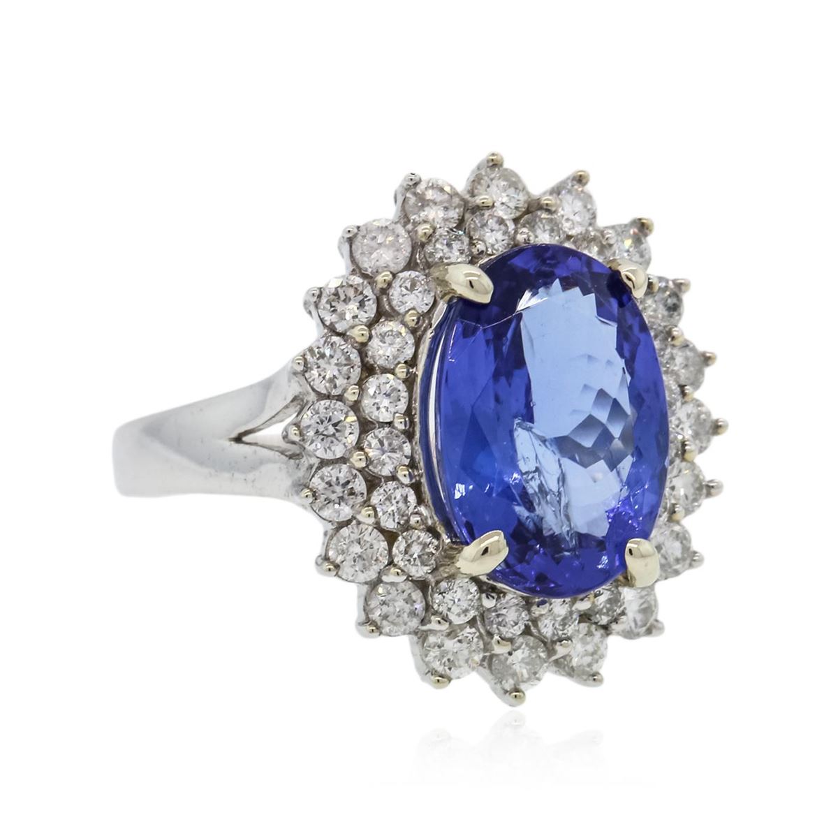 One electronically tested 14KT white gold Ladies cast ring with a bright polish finish. Condition is new. Identified with markings of "14K". Containing: One prong set oval modified brilliant cut natural tanzanite, measuring 12.00 x 10.00 x 6.49mm, approximate weight of 4.40ct., clarity is eye clean, type I, medium, very slightly grayish, bluish violet color, (GIA bV 5/3), cut is very good. Colored gemstones are presumed to have been subjected to commonly used color/clarity enhancement processes. Forty prong set round brilliant cut diamonds, measuring 2.00 - 1.50 x 1.05mm (depth est.) approximate. Total Weight of 40 Stones = 1.08ct. Clarity: SI-2 to I-1. Color: H - I, Cut is Good. Total Weight of Colored Stones 4.40ct. Total Weight of Diamonds 1.08ct. Total Weight of Ring 6.20 grams. GGL Appraised at $10,480.00.