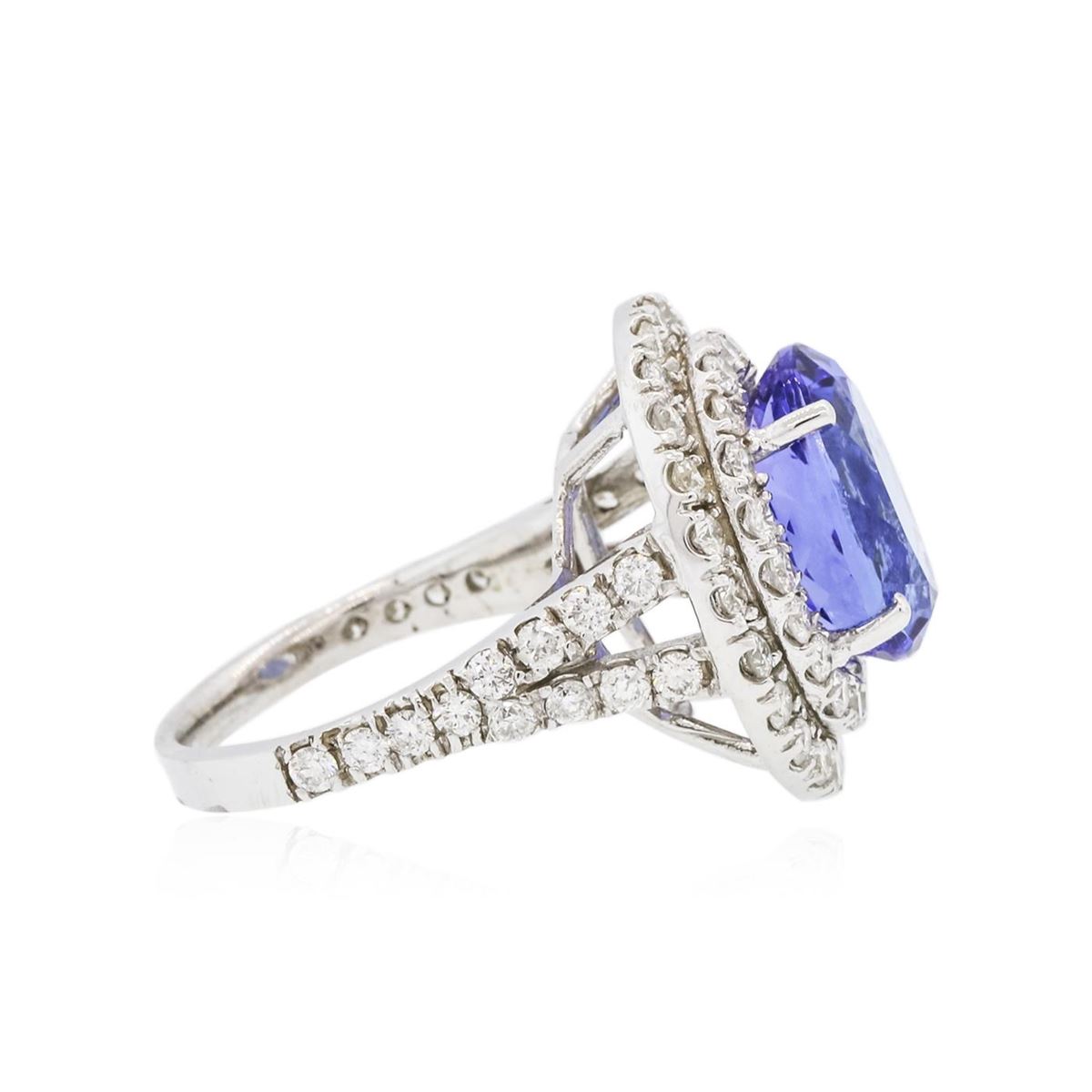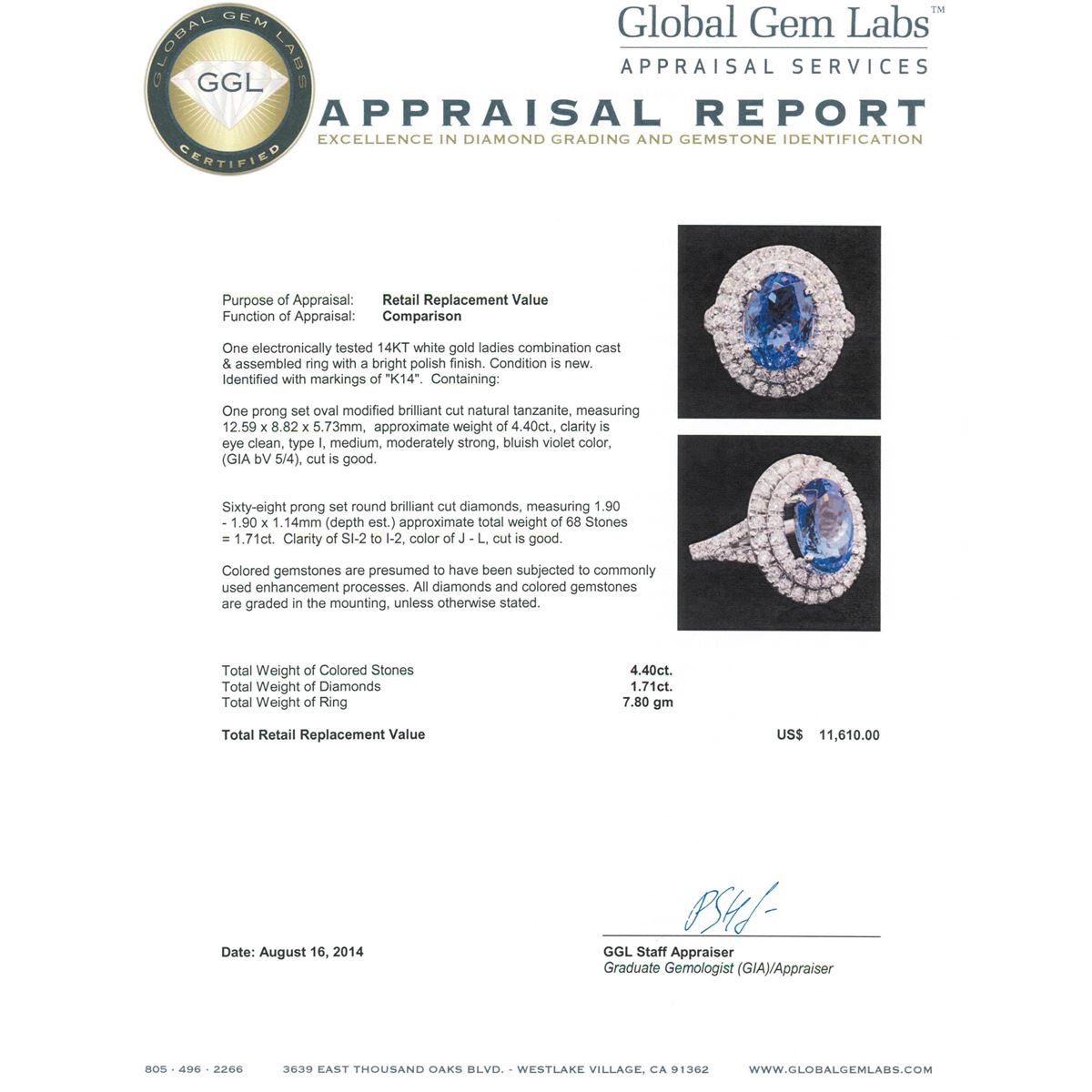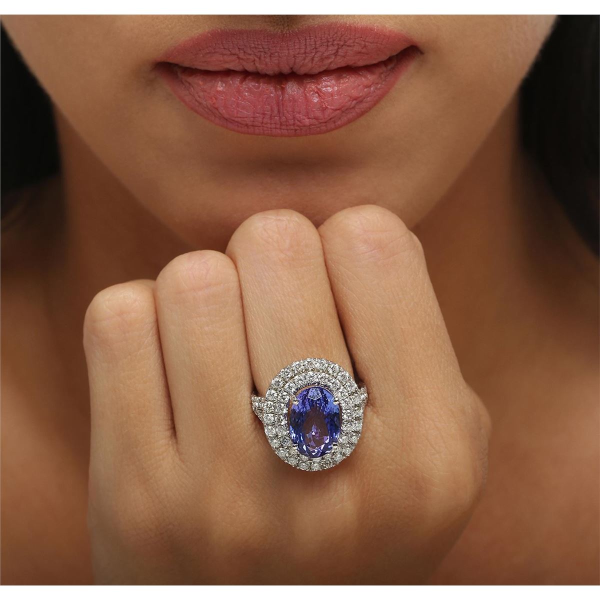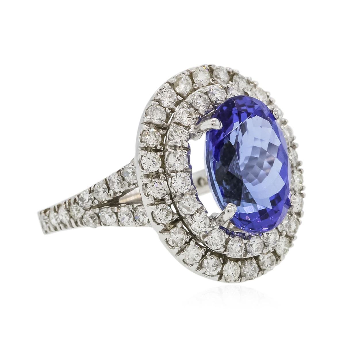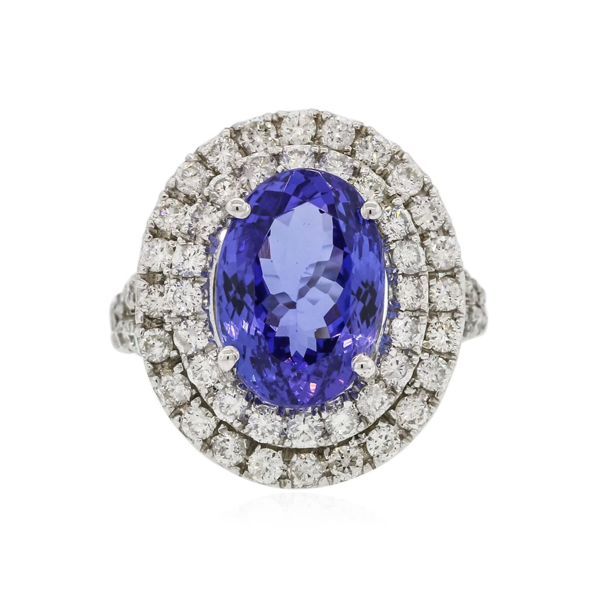 One electronically tested 14KT white gold ladies combination cast & assembled ring with a bright polish finish. Condition is new. Identified with markings of "K14". Containing: One prong set oval modified brilliant cut natural tanzanite, measuring 12.59 x 8.82 x 5.73mm, approximate weight of 4.40ct., clarity is eye clean, type I, medium, moderately strong, bluish violet color, (GIA bV 5/4), cut is good. Sixty-Eight prong set round brilliant cut diamonds, measuring 1.90 - 1.90 x 1.14mm (depth est.) approximate. Total Weight of 68 Stones = 1.71ct. Clarity: SI-2 to I-2. Color: J - L, Cut is Good. Colored gemstones are presumed to have been subjected to commonly used enhancement processes. All diamonds and colored gemstones are graded in the mounting, unless otherwise stated. Total Weight of Colored Stones 4.40ct. Total Weight of Diamonds 1.71ct. Total Weight of Ring 7.80 grams. GGL Appraised at $11,610.00.