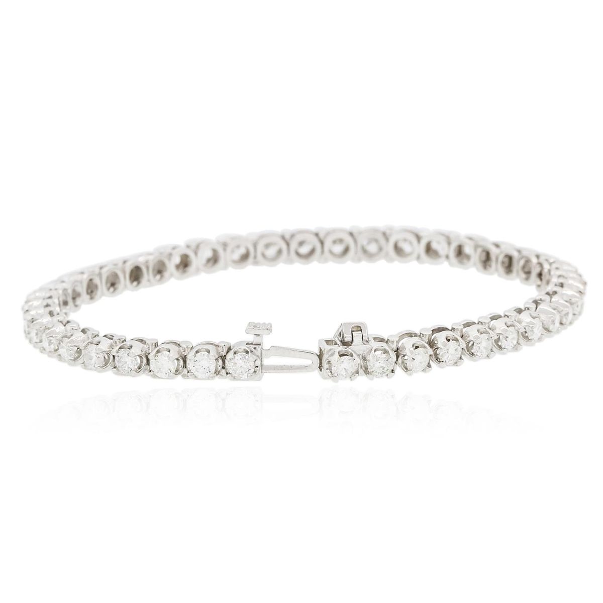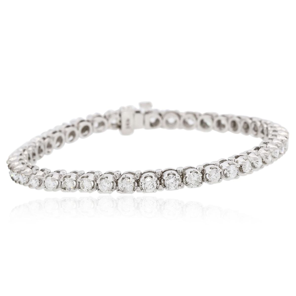 One electronically tested 14KT white gold ladies combination cast & assembled tennis bracelet with a hidden box clasp with a bright polish finish. Condition is new. Measurements: 7" in length. Identified with markings of "14K". Containing: Forty-Two prong set round brilliant cut diamonds, measuring 3.00 - 3.00 x 1.80mm (depth est.) approximate total weight of 42 Stones = 4.40ct. Clarity: SI-2 to I-2. Color: I - J, Cut is Good. All diamonds are graded in the mounting, unless otherwise stated. Total Weight of Diamonds 4.40ct. Total Weight of Bracelet 14.60 grams. GGL Appraised at $14,950.00.
