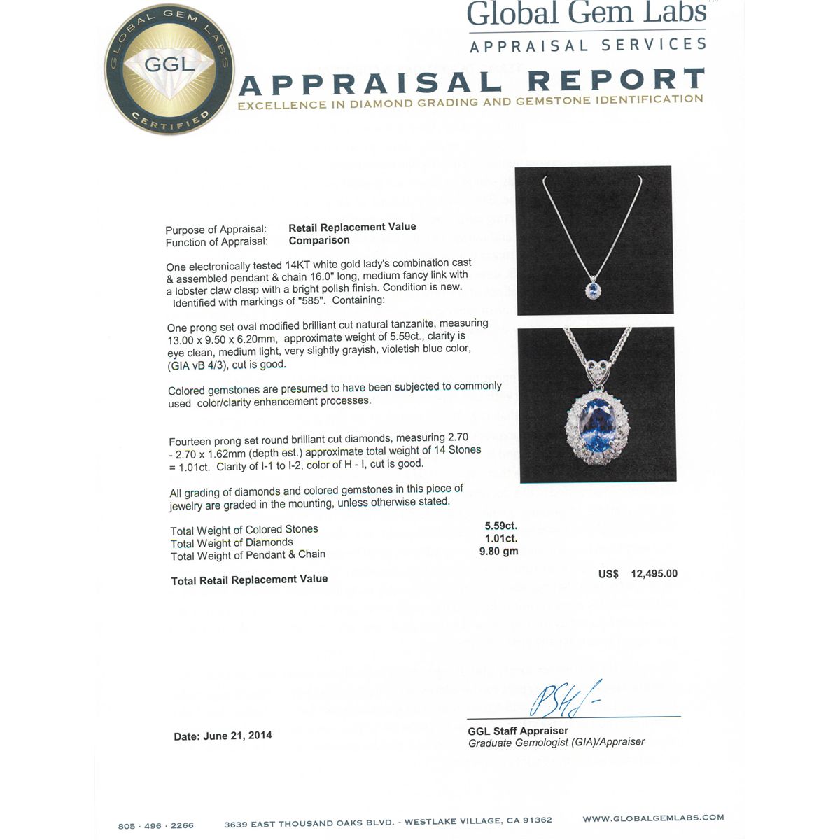 One electronically tested 14KT white gold Ladies combination cast & assembled ring with a bright polish finish. Condition is new. Identified with markings of "K14". Containing: One prong set rectangular cushion modified brilliant cut natural tanzanite, measuring 10.00 x 8.90 x 6.30mm, approximate weight of 4.41ct., clarity is eye clean, type I, medium light, very slightly grayish, bluish violet color, (GIA bV 4/3), cut is good. Colored gemstones are presumed to have been subjected to commonly used color/clarity enhancement processes. Ninety-Four prong set round brilliant cut diamonds, measuring 1.10 - 1.10 x 0.66mm (depth est.) approximate. Total Weight of 94 Stones = 0.45ct. Clarity: I-1 to I-2. Color: I - J, Cut is Good. Total Weight of Colored Stones 4.41ct. Total Weight of Diamonds 0.45ct. Total Weight of Ring 7.10 grams. GGL Appraised at $10,090.00.