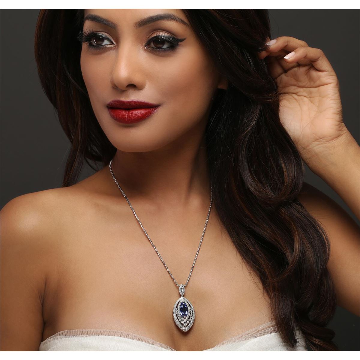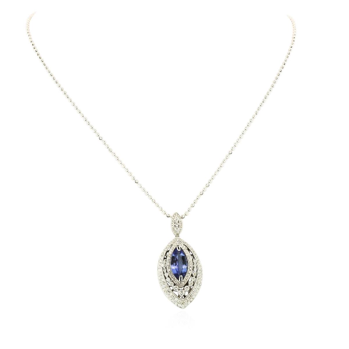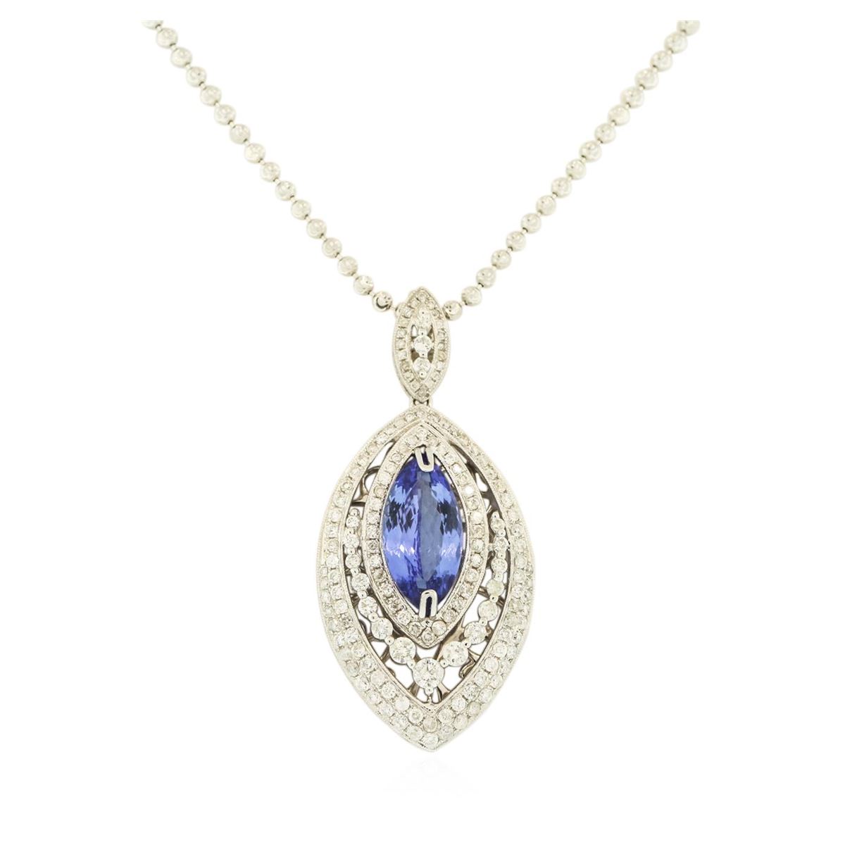 One electronically tested 14KT white gold ladies cast & assembled tanzanite and diamond pendant/enhancer with chain. The pendant/enhancer features a tanzanite set within an elaborate diamond set lattice gallery, completed by a diamond set bail with snap-locking bail with safety. The pendant/enhancer is supported by an eighteen inch length 14KT white gold designer style chain, terminating in a lobster claw clasp. Bright polish finish with milgrain detailing throughout. Trademark is Orianne. Identified with markings of "14K". Condition is new, good workmanship. Containing: One prong set marquise brilliant cut natural tanzanite, measuring 16.00 x 7.95 x 5.15mm, 6% bulge factor, approximate weight of 4.42ct., clarity is eye clean, type I, medium dark, very slightly grayish, bluish violet color, (GIA bV 6/3), cut is good. Transmitting light with no distortion, transparent. Graded in the setting. Tanzanite is a very rare gemstone that is only found in the country of Tanzania. Originally discovered in 1967. Tiffany & Company, named the stone Tanzanite. It is found in the Usumburu Mountains that border the Umba Valley of northern Tanzania. Tanzanite occurs in gray, brown, violet, blue, reddish-purple, & green. The gem is interesting because of its exceptional pleochroism. Rotated in different directions a tanzanite will exhibit multiple changes of color. Tanzanite has a low tolerance to ultrasonic cleaning, and should not be cleaned using this method. One Hundred Fifty bead and prong set round brilliant cut diamonds approximate total weight of 150 Stones = 1.94ct. Graded in the setting. Clarity: I-1 to I-2. Color: G - I. Total Weight of Colored Stones 4.42ct. Total Weight of Diamonds 1.94ct. Total Weight of Pendant/Enhancer With Chain 15.62 grams. AIG Appraised at $18,445.00.