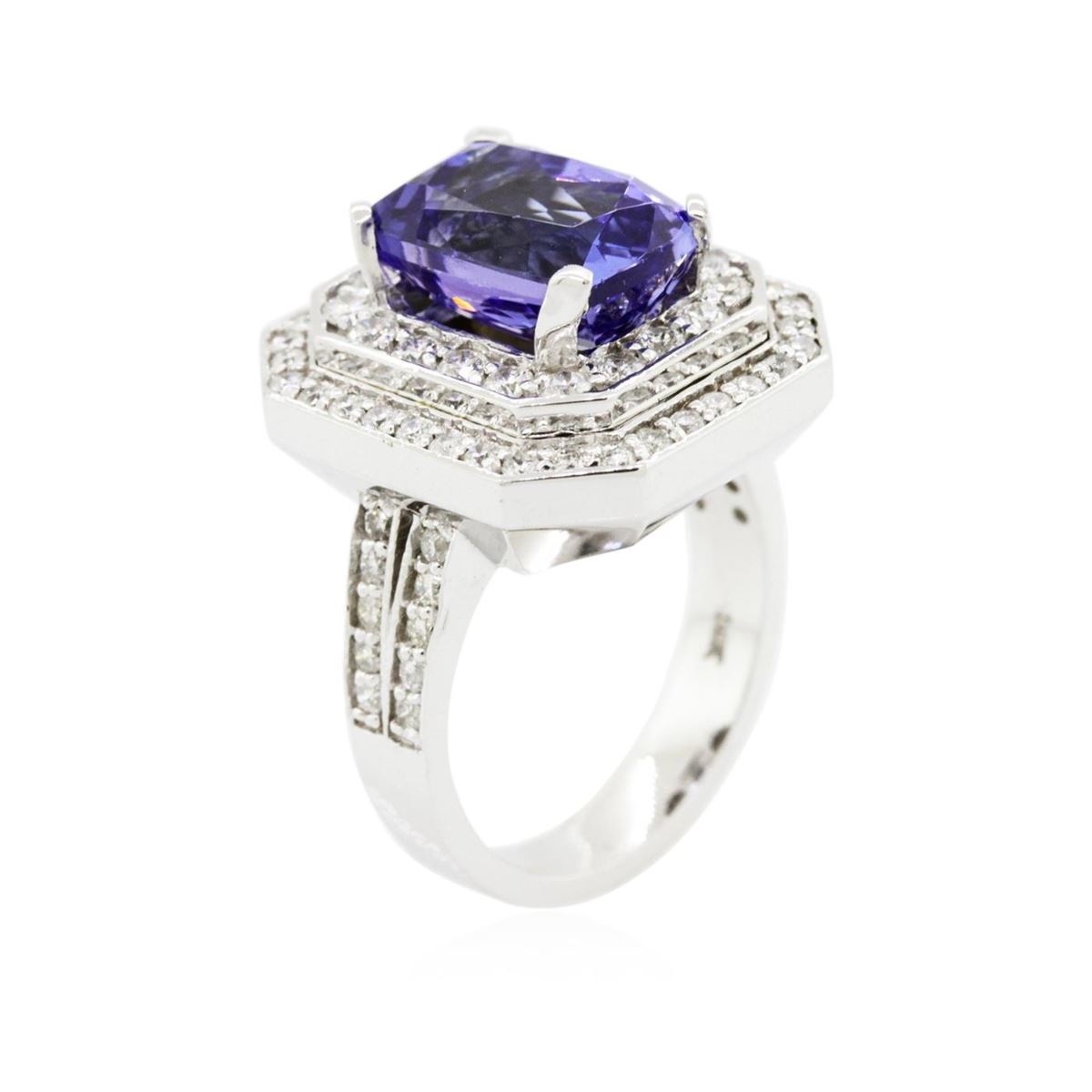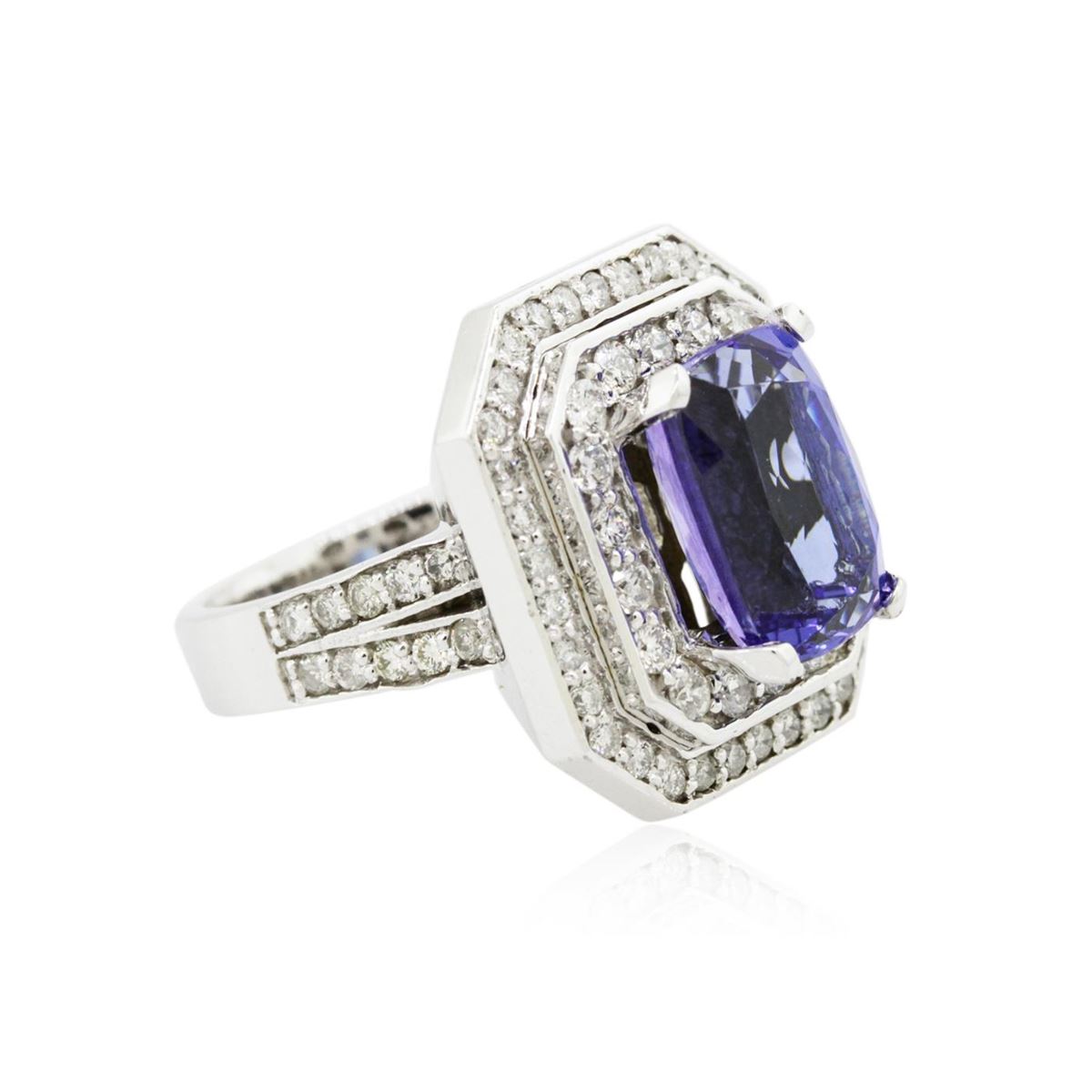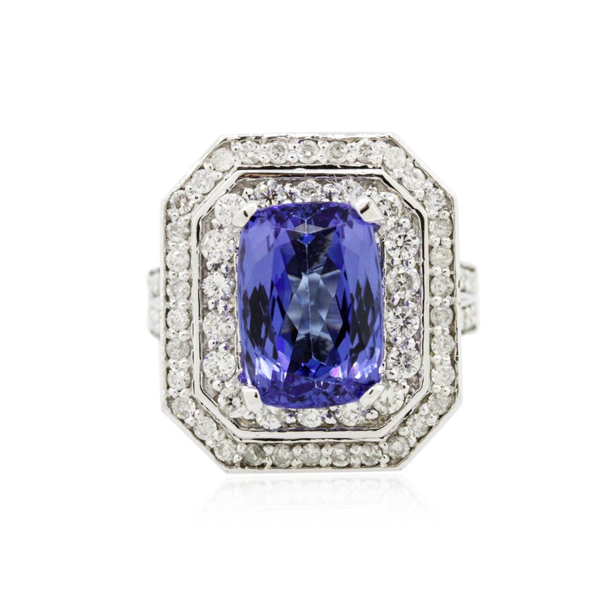 One electronically tested 14KT white gold Ladies combination cast & assembled ring with a bright polish finish. Condition is new. Identified with markings of "14K". Containing: One prong set rectangular cushion modified brilliant cut natural tanzanite, measuring 11.00 x 8.10 x 6.30mm, approximate weight of 4.42ct., clarity is eye clean, type I, medium light, very slightly grayish, bluish violet color, (GIA bV 4/3), cut is good. Colored gemstones are presumed to have been subjected to commonly used color/clarity enhancement processes. Seventy-Two prong set round brilliant cut diamonds, measuring 1.50 - 1.50 x 0.90mm (depth est.) approximate. Total Weight of 72 Stones = 0.89ct. Clarity: I-1 to I-2. Color: I - J, Cut is Good. Total Weight of Colored Stones 4.42ct. Total Weight of Diamonds 0.89ct. Total Weight of Ring 12.00 grams. GGL Appraised at $11,355.00.