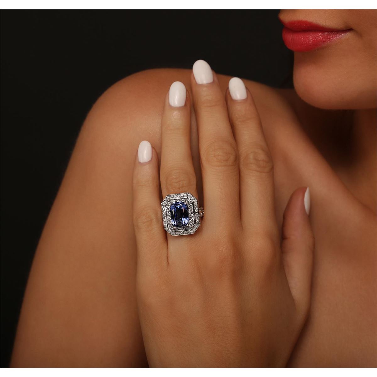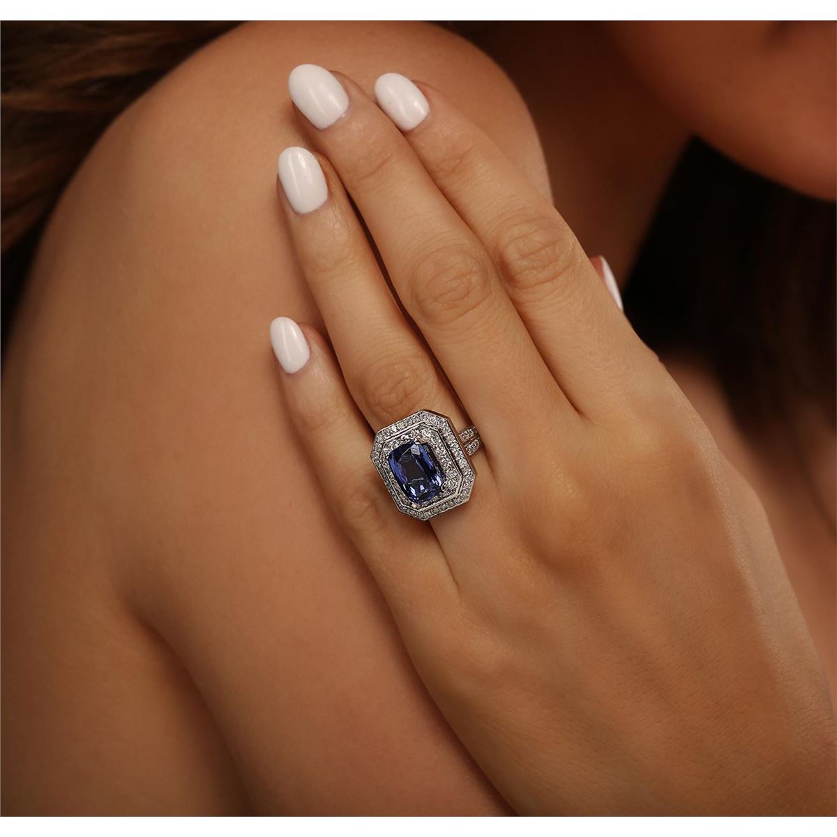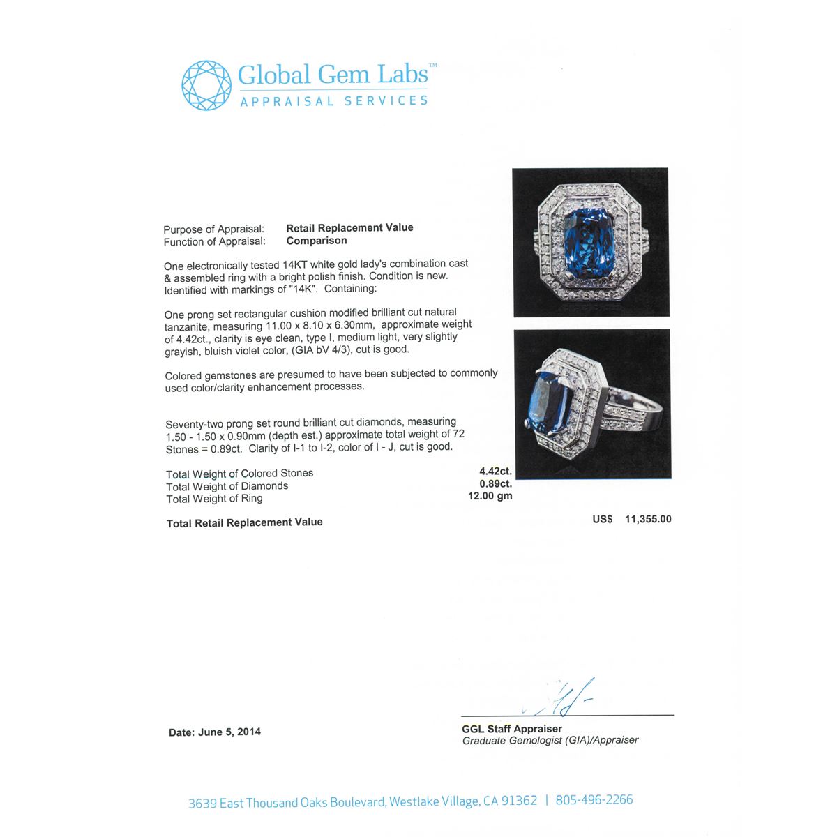 One electronically tested 14KT white gold Ladies combination cast & assembled ring with a bright polish finish. Condition is new. Identified with markings of "14K". Containing: One prong set rectangular cushion modified brilliant cut natural tanzanite, measuring 11.00 x 8.10 x 6.30mm, approximate weight of 4.42ct., clarity is eye clean, type I, medium light, very slightly grayish, bluish violet color, (GIA bV 4/3), cut is good. Colored gemstones are presumed to have been subjected to commonly used color/clarity enhancement processes. Seventy-Two prong set round brilliant cut diamonds, measuring 1.50 - 1.50 x 0.90mm (depth est.) approximate. Total Weight of 72 Stones = 0.89ct. Clarity: I-1 to I-2. Color: I - J, Cut is Good. Total Weight of Colored Stones 4.42ct. Total Weight of Diamonds 0.89ct. Total Weight of Ring 12.00 grams. GGL Appraised at $11,355.00.
