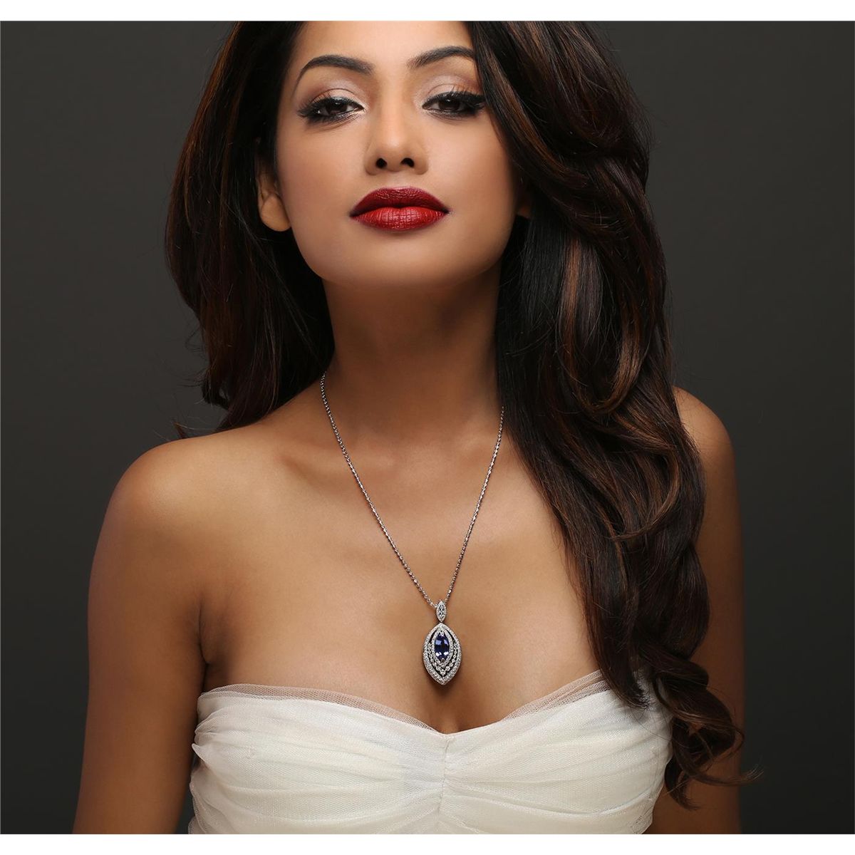 One electronically tested 14KT white gold ladies cast & assembled tanzanite and diamond pendant/enhancer with chain. The pendant/enhancer features a tanzanite set within an elaborate diamond set lattice gallery, completed by a diamond set bail with snap-locking bail with safety. The pendant/enhancer is supported by an eighteen inch length 14KT white gold designer style chain, terminating in a lobster claw clasp. Bright polish finish with milgrain detailing throughout. Trademark is Orianne. Identified with markings of "14K". Condition is new, good workmanship. Containing: One prong set marquise brilliant cut natural tanzanite, measuring 16.00 x 7.95 x 5.15mm, 6% bulge factor, approximate weight of 4.42ct., clarity is eye clean, type I, medium dark, very slightly grayish, bluish violet color, (GIA bV 6/3), cut is good. Transmitting light with no distortion, transparent. Graded in the setting. Tanzanite is a very rare gemstone that is only found in the country of Tanzania. Originally discovered in 1967. Tiffany & Company, named the stone Tanzanite. It is found in the Usumburu Mountains that border the Umba Valley of northern Tanzania. Tanzanite occurs in gray, brown, violet, blue, reddish-purple, & green. The gem is interesting because of its exceptional pleochroism. Rotated in different directions a tanzanite will exhibit multiple changes of color. Tanzanite has a low tolerance to ultrasonic cleaning, and should not be cleaned using this method. One Hundred Fifty bead and prong set round brilliant cut diamonds approximate total weight of 150 Stones = 1.94ct. Graded in the setting. Clarity: I-1 to I-2. Color: G - I. Total Weight of Colored Stones 4.42ct. Total Weight of Diamonds 1.94ct. Total Weight of Pendant/Enhancer With Chain 15.62 grams. AIG Appraised at $18,445.00.