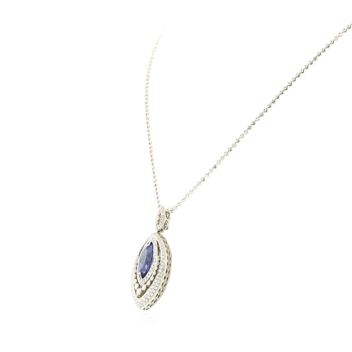 One electronically tested 14KT white gold ladies cast & assembled tanzanite and diamond pendant/enhancer with chain. The pendant/enhancer features a tanzanite set within an elaborate diamond set lattice gallery, completed by a diamond set bail with snap-locking bail with safety. The pendant/enhancer is supported by an eighteen inch length 14KT white gold designer style chain, terminating in a lobster claw clasp. Bright polish finish with milgrain detailing throughout. Trademark is Orianne. Identified with markings of "14K". Condition is new, good workmanship. Containing: One prong set marquise brilliant cut natural tanzanite, measuring 16.00 x 7.95 x 5.15mm, 6% bulge factor, approximate weight of 4.42ct., clarity is eye clean, type I, medium dark, very slightly grayish, bluish violet color, (GIA bV 6/3), cut is good. Transmitting light with no distortion, transparent. Graded in the setting. Tanzanite is a very rare gemstone that is only found in the country of Tanzania. Originally discovered in 1967. Tiffany & Company, named the stone Tanzanite. It is found in the Usumburu Mountains that border the Umba Valley of northern Tanzania. Tanzanite occurs in gray, brown, violet, blue, reddish-purple, & green. The gem is interesting because of its exceptional pleochroism. Rotated in different directions a tanzanite will exhibit multiple changes of color. Tanzanite has a low tolerance to ultrasonic cleaning, and should not be cleaned using this method. One Hundred Fifty bead and prong set round brilliant cut diamonds approximate total weight of 150 Stones = 1.94ct. Graded in the setting. Clarity: I-1 to I-2. Color: G - I. Total Weight of Colored Stones 4.42ct. Total Weight of Diamonds 1.94ct. Total Weight of Pendant/Enhancer With Chain 15.62 grams. AIG Appraised at $18,445.00.