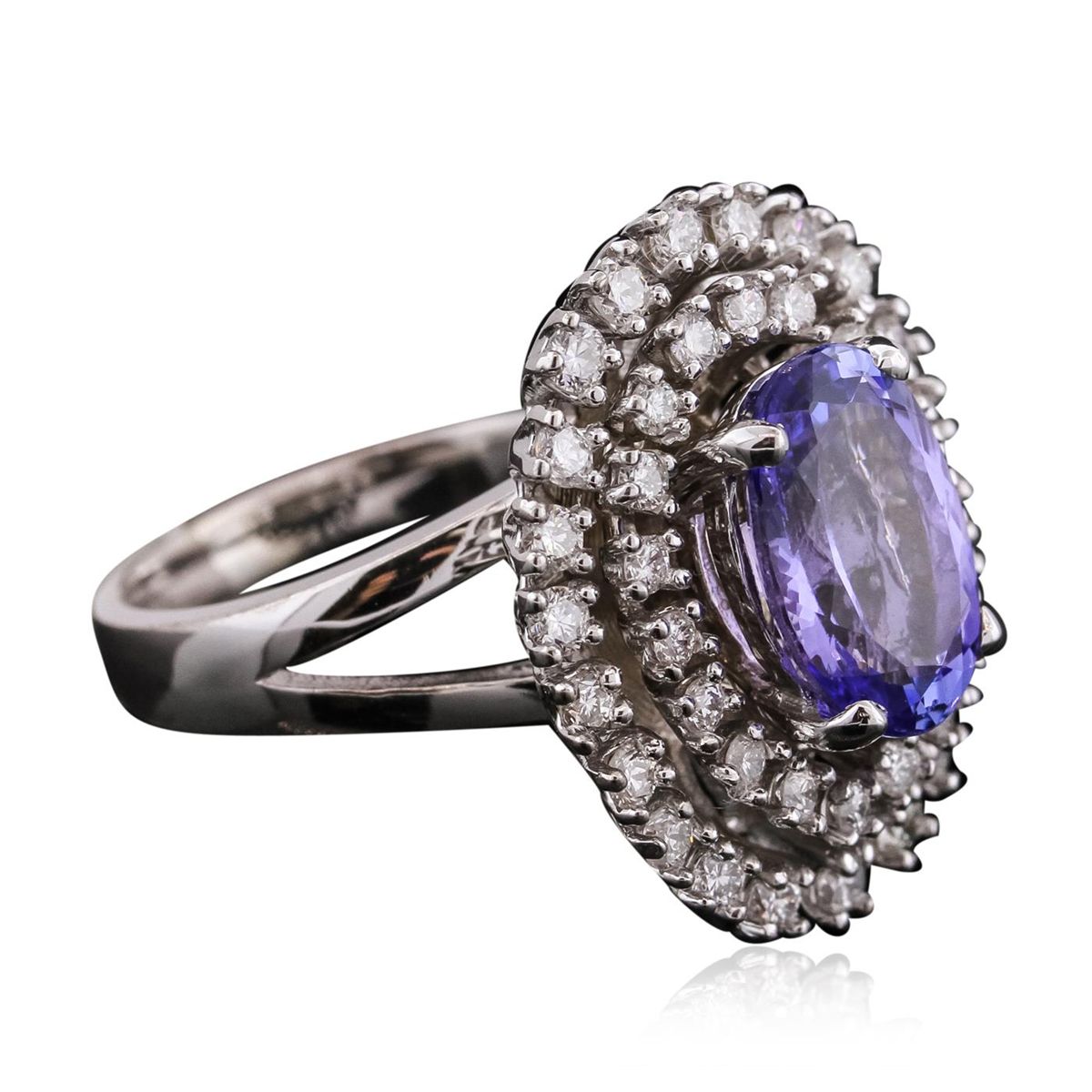 One electronically tested 14KT white gold ladies cast tanzanite and diamond ring with a bright polish finish. The featured tanzanite is set within two tiered diamond bezels, completed by a two and one-half millimeter wide band. Identified with markings of "K14". Condition is new, good workmanship. Containing: One prong set oval brilliant cut natural tanzanite, measuring 12.10 x 8.60 x 5.70mm, 8% bulge factor, approximate weight of 4.42ct., clarity is eye clean, type I, medium dark, very slightly grayish, bluish violet color, (GIA bV 6/3), cut is good. Transmitting light with no distortion, transparent. Graded in the setting. Tanzanite is a very rare gemstone that is only found in the country of Tanzania. Originally discovered in 1967. Tiffany & Company, named the stone Tanzanite. It is found in the Usumburu Mountains that border the Umba Valley of northern Tanzania. Tanzanite occurs in gray, brown, violet, blue, reddish-purple, & green. The gem is interesting because of its exceptional pleochroism. Rotated in different directions a tanzanite will exhibit multiple changes of color. Tanzanite has a low tolerance to ultrasonic cleaning, and should not be cleaned using this method. Forty prong set round brilliant cut diamonds, measuring 2.10 - 1.90 x 1.20mm (depth est.) approximate total weight of 40 Stones = 1.16ct. Graded in the setting. Clarity: SI-1 to I-1. Color: H - J. Total Weight of Colored Stones 4.42ct. Total Weight of Diamonds 1.16ct. Total Weight of Ring 12.45 grams. AIG Appraised at $16,625.00.