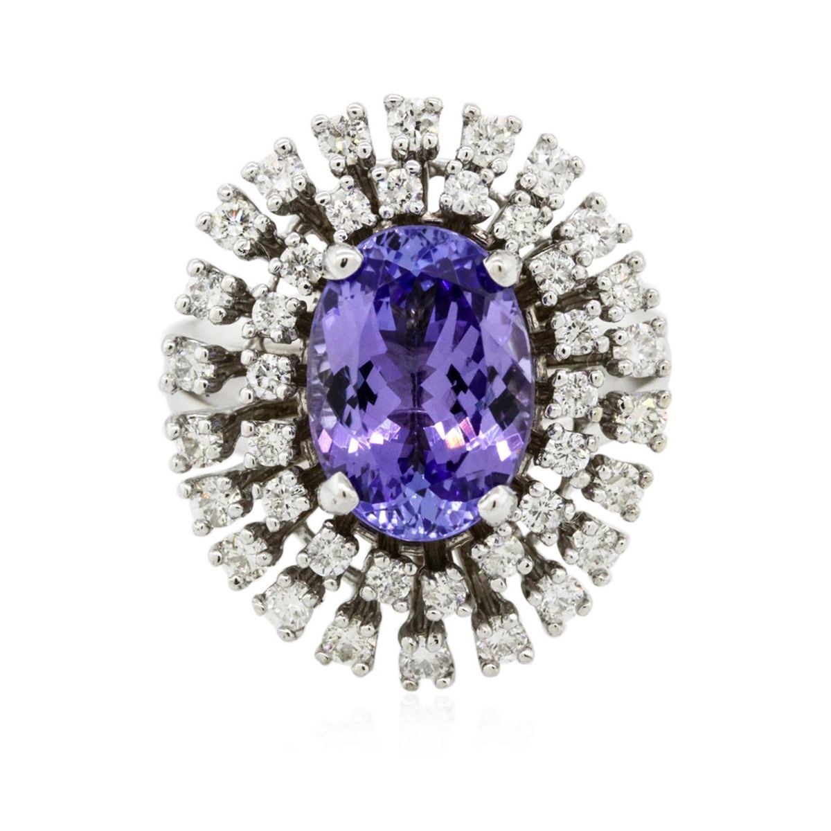 One electronically tested 14KT white gold ladies cast tanzanite and diamond ring with a bright polish finish. The featured tanzanite is set within two tiered diamond bezels, completed by a two and one-half millimeter wide band. Identified with markings of "K14". Condition is new, good workmanship. Containing: One prong set oval brilliant cut natural tanzanite, measuring 12.10 x 8.60 x 5.70mm, 8% bulge factor, approximate weight of 4.42ct., clarity is eye clean, type I, medium dark, very slightly grayish, bluish violet color, (GIA bV 6/3), cut is good. Transmitting light with no distortion, transparent. Graded in the setting. Tanzanite is a very rare gemstone that is only found in the country of Tanzania. Originally discovered in 1967. Tiffany & Company, named the stone Tanzanite. It is found in the Usumburu Mountains that border the Umba Valley of northern Tanzania. Tanzanite occurs in gray, brown, violet, blue, reddish-purple, & green. The gem is interesting because of its exceptional pleochroism. Rotated in different directions a tanzanite will exhibit multiple changes of color. Tanzanite has a low tolerance to ultrasonic cleaning, and should not be cleaned using this method. Forty prong set round brilliant cut diamonds, measuring 2.10 - 1.90 x 1.20mm (depth est.) approximate total weight of 40 Stones = 1.16ct. Graded in the setting. Clarity: SI-1 to I-1. Color: H - J. Total Weight of Colored Stones 4.42ct. Total Weight of Diamonds 1.16ct. Total Weight of Ring 12.45 grams. AIG Appraised at $16,625.00.