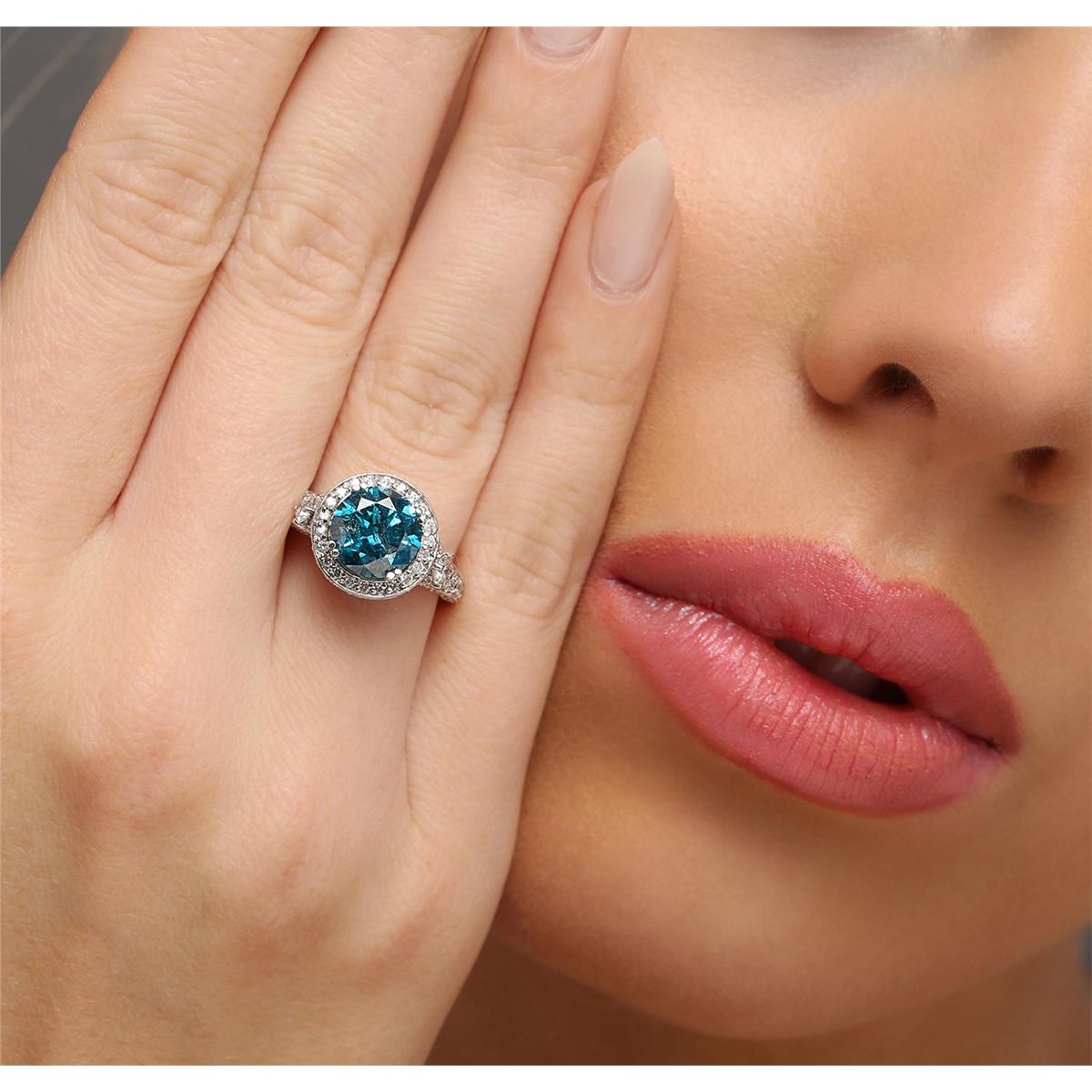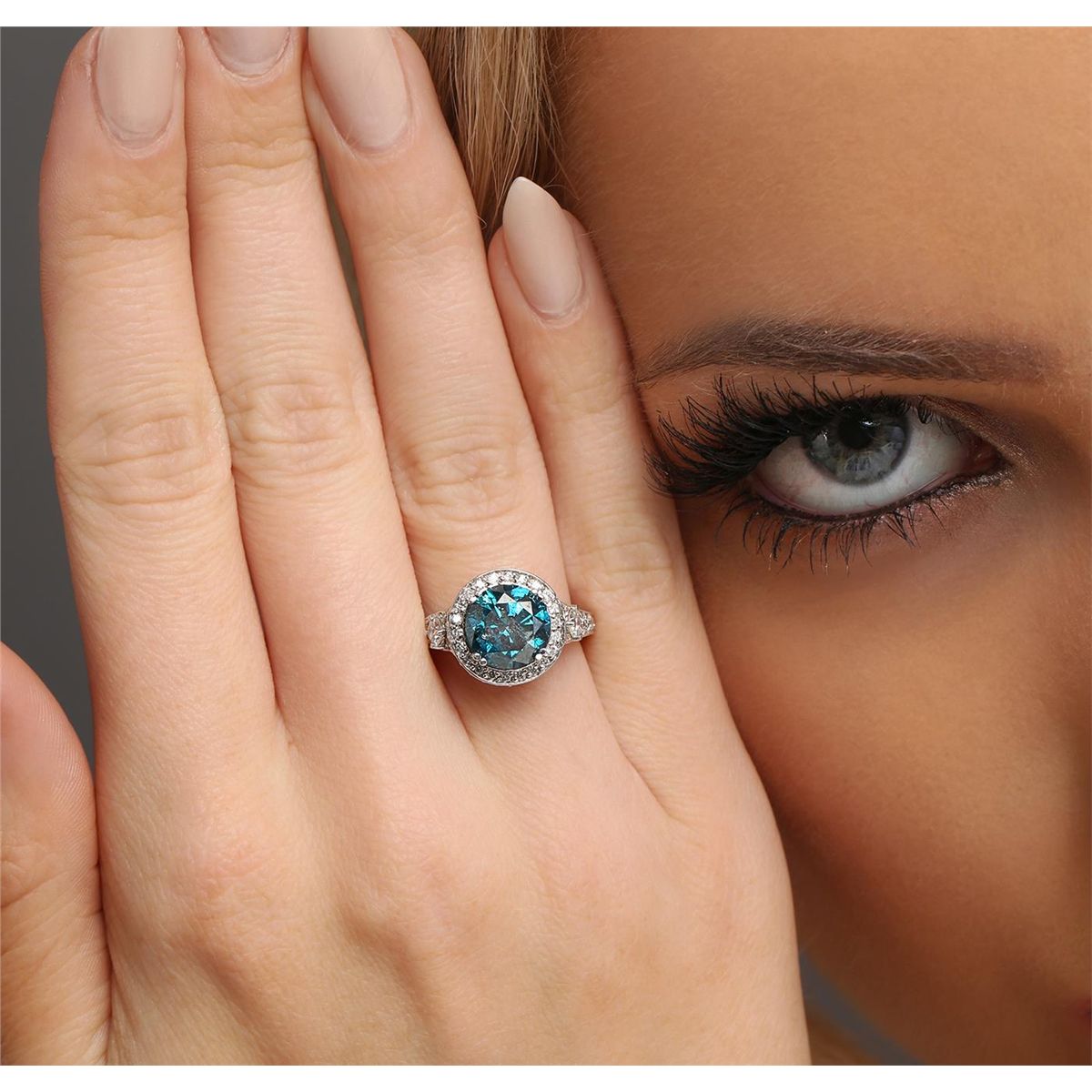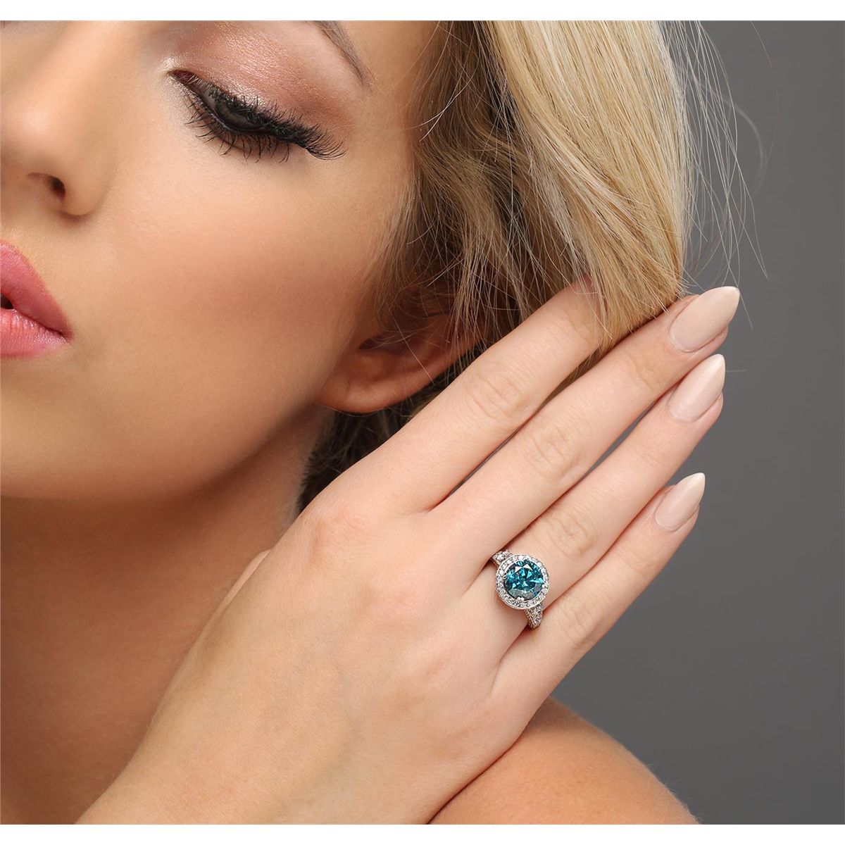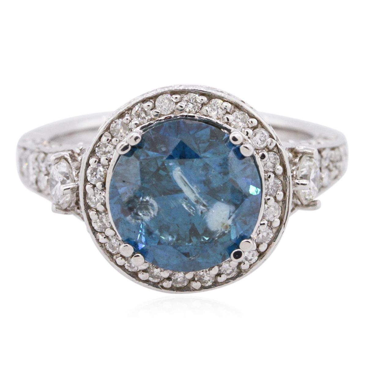 One electronically tested 14KT white gold ladies cast diamond ring with a flat shank with a bright polish finish. Identified with markings of "K14". Condition is new. Containing: One prong set round brilliant cut diamond, measuring 9.16 - 9.12 x 6.35mm (depth est.) approximate weight of 3.24ct. Clarity: I-2, Cut is Good. The color of the stone has been treated. Two prong set round brilliant cut diamonds, measuring 3.00 - 3.00 x 1.80mm (depth est.) approximate total weight of 2 Stones = 0.20ct. Clarity: SI-1 to SI-2. Color: H - I, Cut is Good. One Hundred Twenty-Six prong set round brilliant cut diamonds, measuring 1.70 - 1.10 x 0.84mm (depth est.) approximate total weight of 126 Stones = 1.00ct. Clarity: SI-2 to I-1. Color: H - I, Cut is Good. All diamonds are graded in the mounting, unless otherwise stated. Total Weight of Diamonds 4.43ct. Total Weight of Ring 5.80 grams. GGL Appraised at $15,915.00.