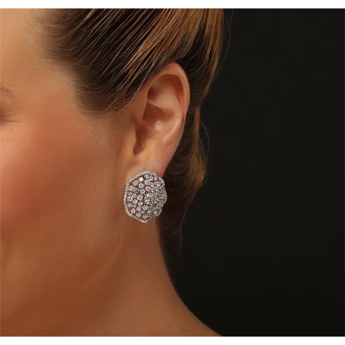 One pair electronically tested 14KT white gold Ladies combination cast & assembled earrings with Omega clip backs with posts with a bright polish finish. Condition is new. Containing: Two prong set oval shaped cut diamonds, measuring 5.60 x 4.50 x 3.05mm (depth est.) approximate. Total Weight of 2 Stones = 0.96ct. Clarity: I-2. Color: J, Cut is Good. One Hundred prong set round brilliant cut diamonds, measuring 1.10 - 1.10 x 0.66mm (depth est.) approximate. Total Weight of 100 Stones = 0.48ct. Clarity: I-1 to I-2. Color: H - I, Cut is Good. Eighty-Eight prong set round brilliant cut diamonds, measuring 2.40 - 1.80 x 1.26mm (depth est.) approximate. Total Weight of 88 Stones = 2.98ct. Clarity: SI-2 to I-2. Color: H - J, Cut is Good. All diamonds are graded in the mounting, unless otherwise stated. Total Weight of Diamonds 4.43ct. Total Weight of Earrings 11.00 grams. GGL Appraised at $13,750.00.
