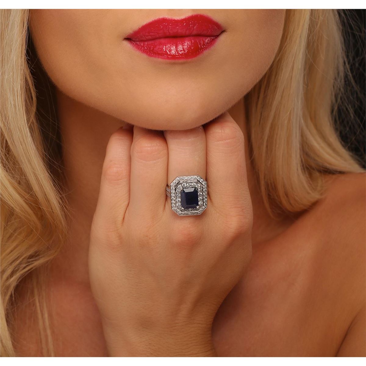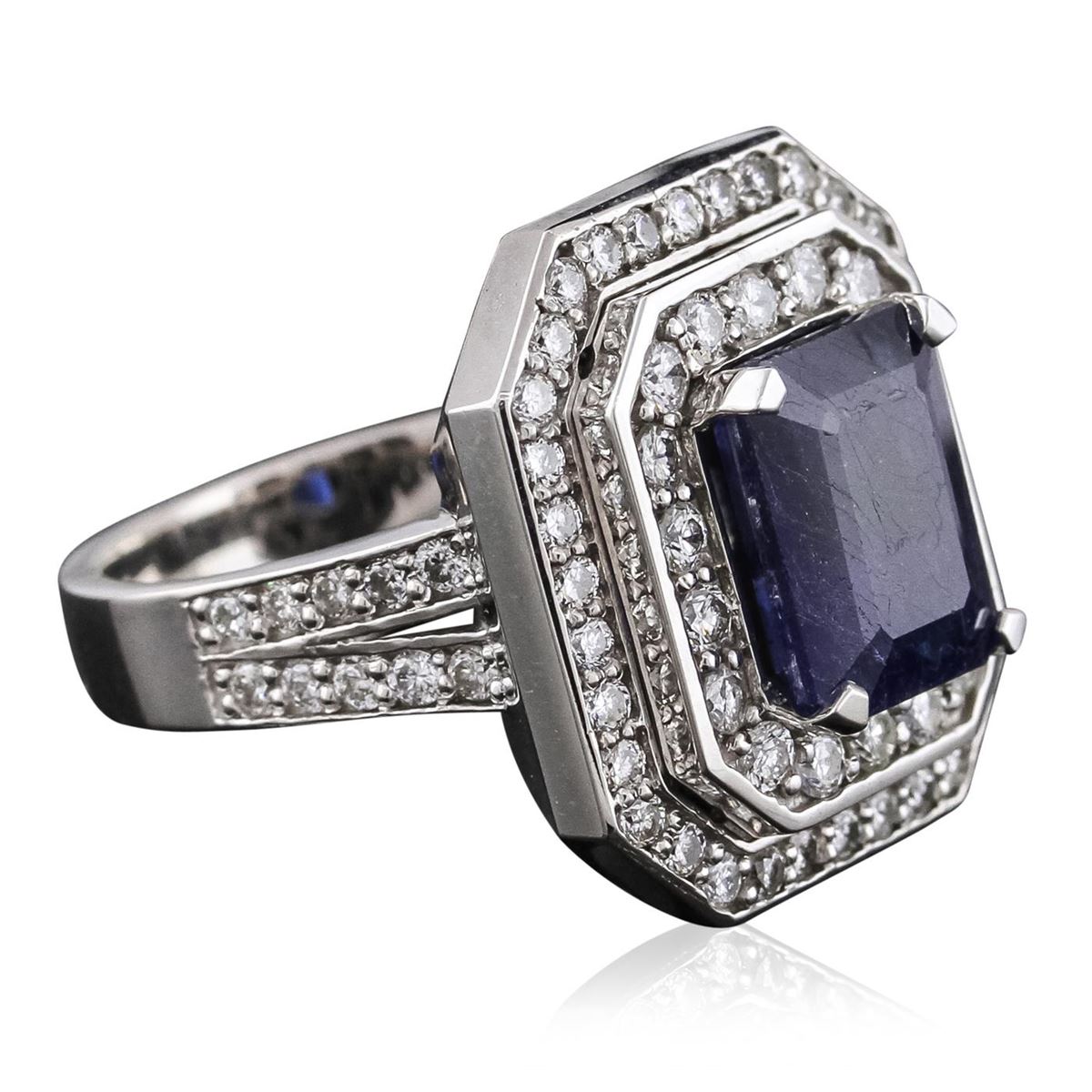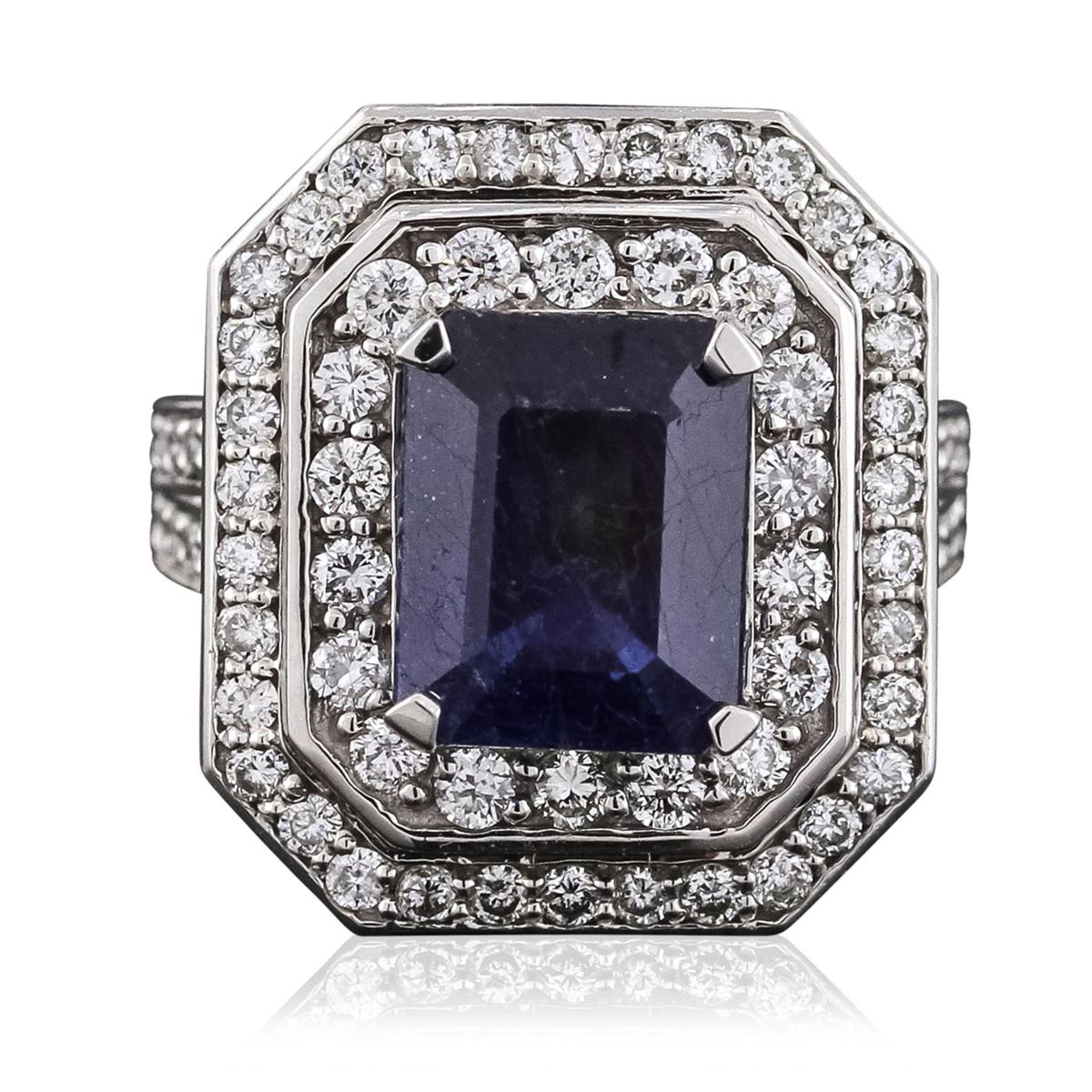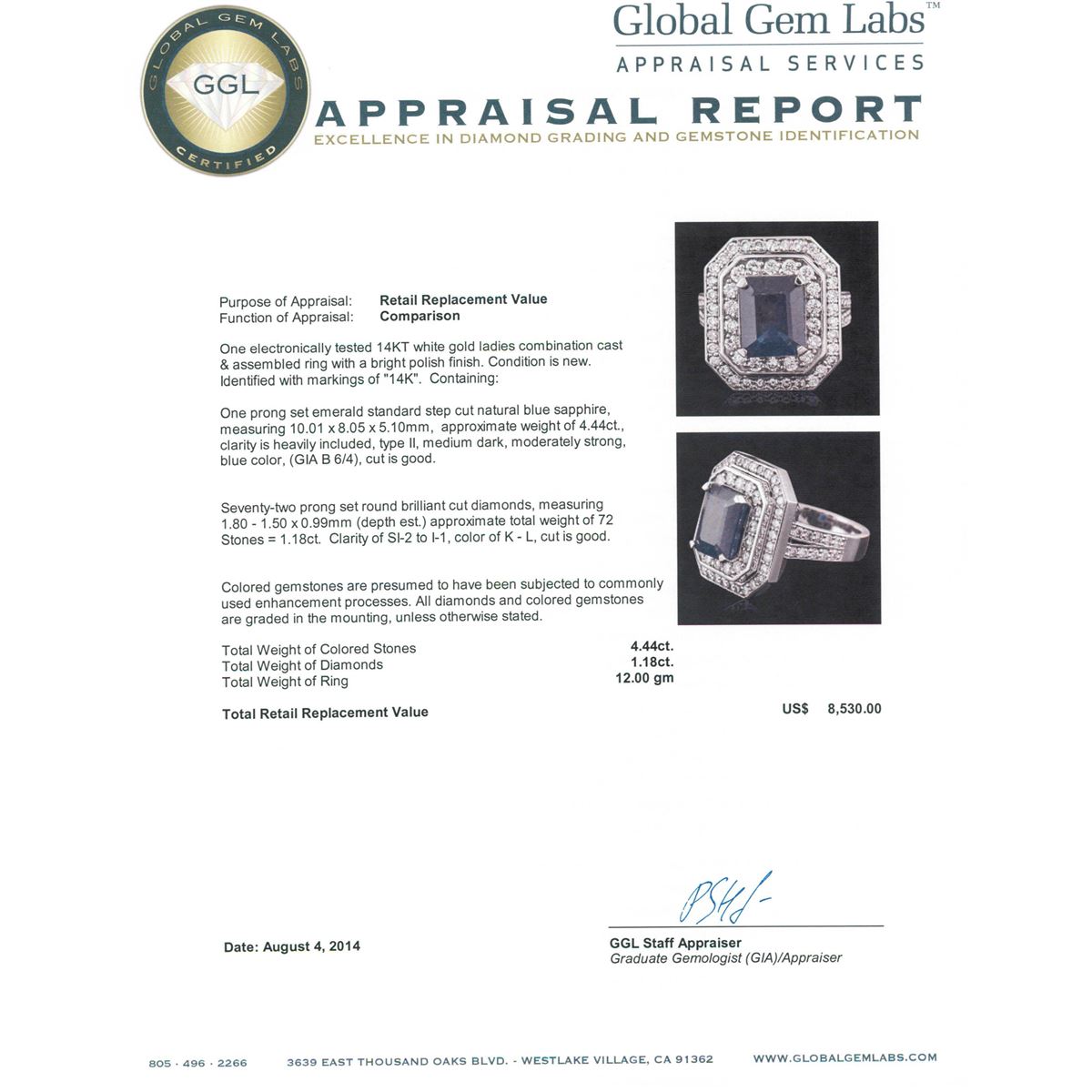 One electronically tested 14KT white gold ladies combination cast & assembled ring with a bright polish finish. Condition is new. Identified with markings of "14K". Containing: One prong set emerald standard step cut natural blue sapphire, measuring 10.01 x 8.05 x 5.10mm, approximate weight of 4.44ct., clarity is heavily included, type II, medium dark, moderately strong, blue color, (GIA B 6/4), cut is good. Seventy-Two prong set round brilliant cut diamonds, measuring 1.80 - 1.50 x 0.99mm (depth est.) approximate. Total Weight of 72 Stones = 1.18ct. Clarity: SI-2 to I-1. Color: K - L, Cut is Good. Colored gemstones are presumed to have been subjected to commonly used enhancement processes. All diamonds and colored gemstones are graded in the mounting, unless otherwise stated. Total Weight of Colored Stones 4.44ct. Total Weight of Diamonds 1.18ct. Total Weight of Ring 12.00 grams. GGL Appraised at $8,530.00.