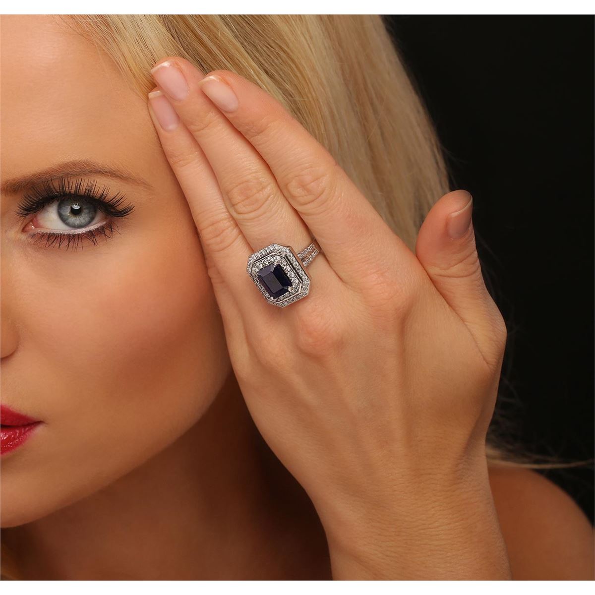 One electronically tested 14KT white gold ladies combination cast & assembled ring with a bright polish finish. Condition is new. Identified with markings of "14K". Containing: One prong set emerald standard step cut natural blue sapphire, measuring 10.01 x 8.05 x 5.10mm, approximate weight of 4.44ct., clarity is heavily included, type II, medium dark, moderately strong, blue color, (GIA B 6/4), cut is good. Seventy-Two prong set round brilliant cut diamonds, measuring 1.80 - 1.50 x 0.99mm (depth est.) approximate. Total Weight of 72 Stones = 1.18ct. Clarity: SI-2 to I-1. Color: K - L, Cut is Good. Colored gemstones are presumed to have been subjected to commonly used enhancement processes. All diamonds and colored gemstones are graded in the mounting, unless otherwise stated. Total Weight of Colored Stones 4.44ct. Total Weight of Diamonds 1.18ct. Total Weight of Ring 12.00 grams. GGL Appraised at $8,530.00.