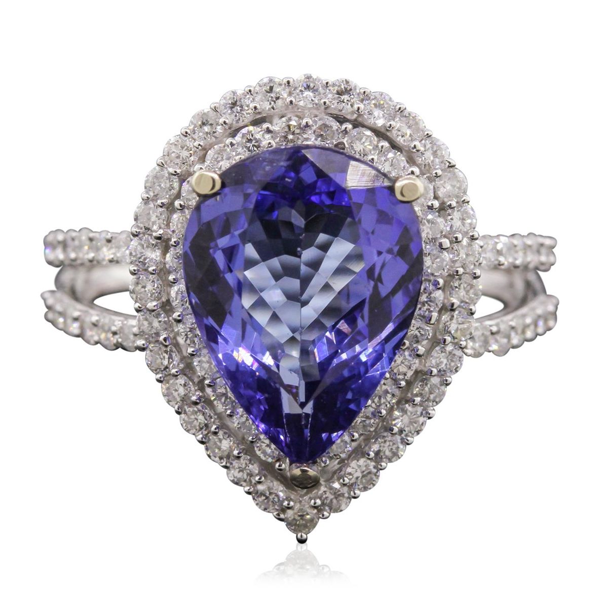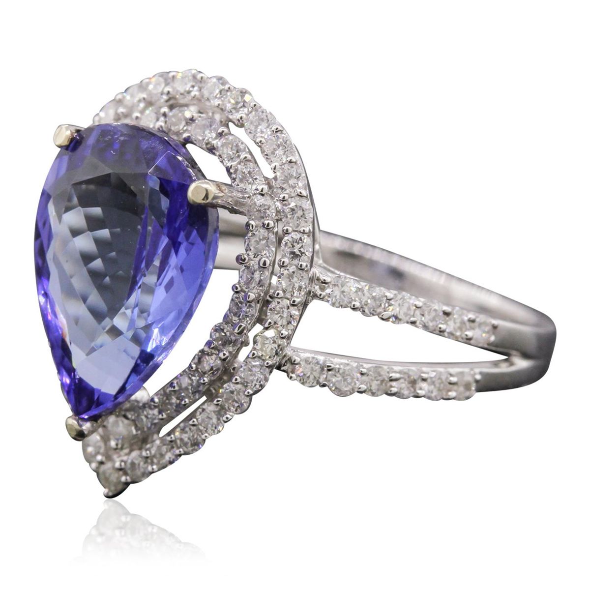 One electronically tested 14KT white gold Ladies cast ring with a bright polish finish. Condition is new. Identified with markings of "14K". Containing: One prong set pear modified brilliant cut natural tanzanite, measuring 13.00 x 9.62 x 5.30mm, approximate weight of 4.44ct., clarity is eye clean, type I, medium, very slightly grayish, bluish violet color, (GIA bV 5/3), cut is very good. Colored gemstones are presumed to have been subjected to commonly used color/clarity enhancement processes. Eighty-One prong set round brilliant cut diamonds, measuring 1.50 - 1.50 x 0.90mm (depth est.) approximate. Total Weight of 81 Stones = 1.00ct. Clarity: I-1 to I-2. Color: I - J, Cut is Good. Total Weight of Colored Stones 4.44ct. Total Weight of Diamonds 1.00ct. Total Weight of Ring 4.40 Grams. GGL Appraised at $8,950.00.