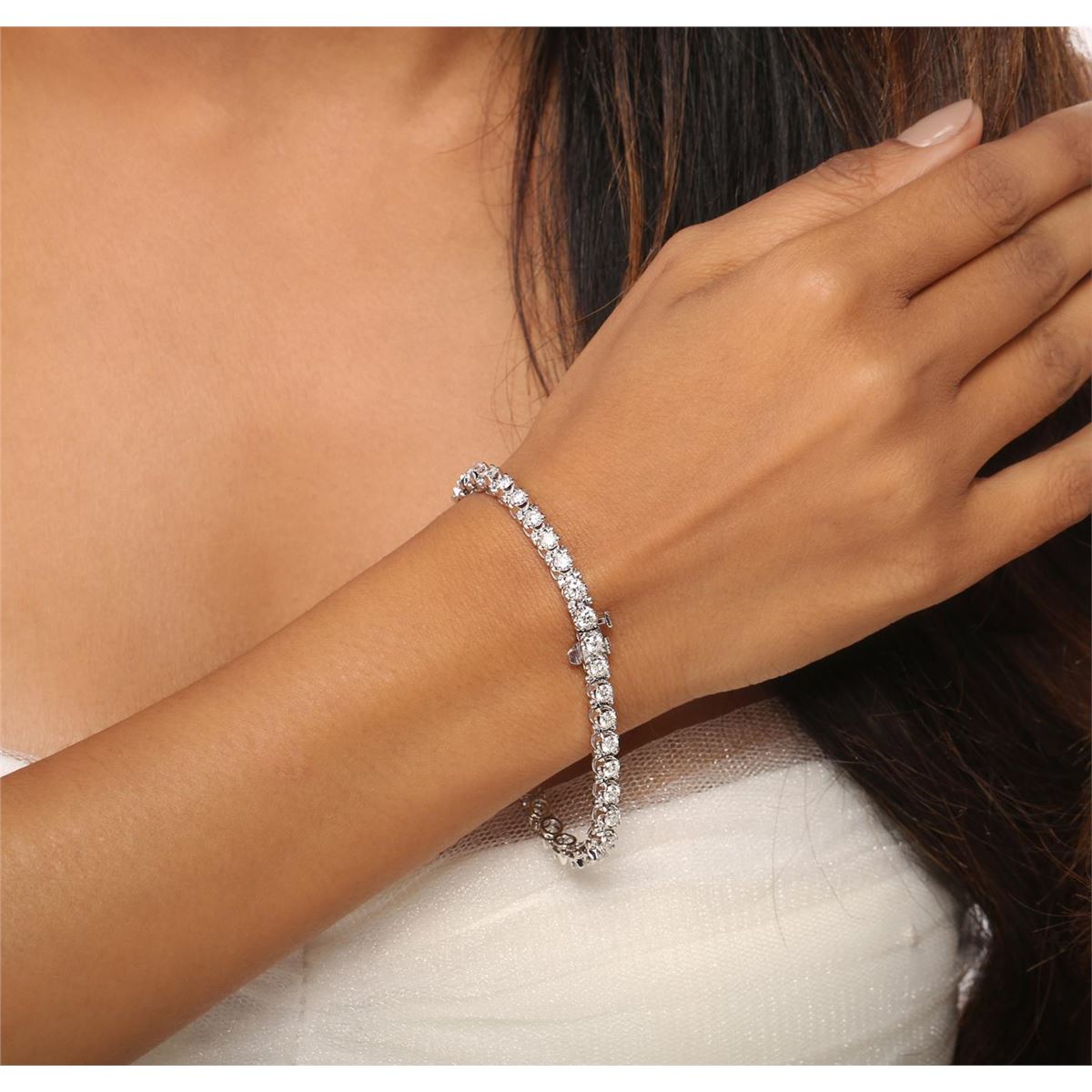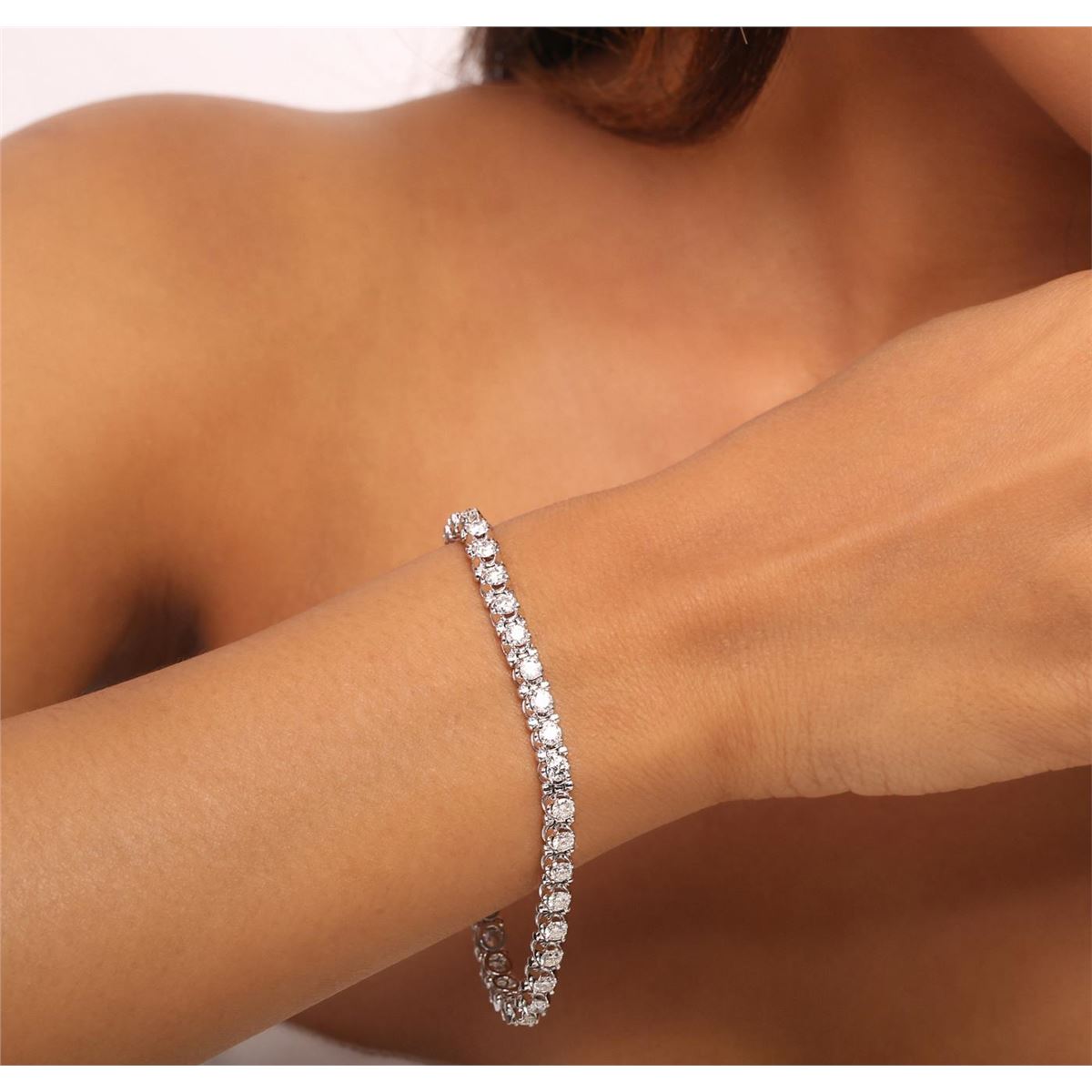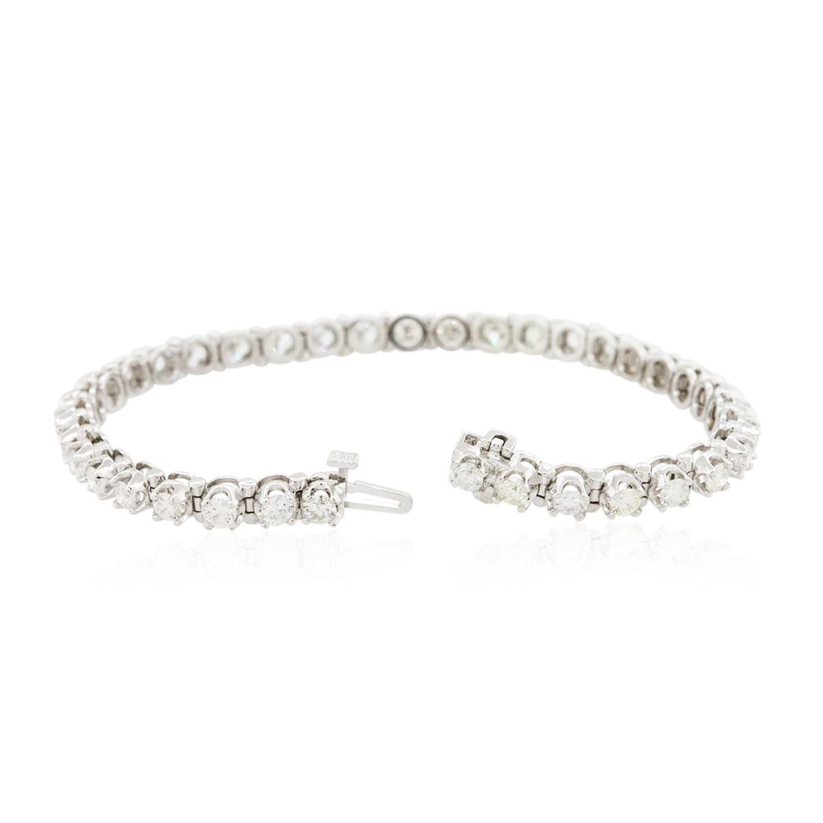 One electronically tested 14KT white gold ladies combination cast & assembled tennis bracelet with a hidden box clasp with a bright polish finish. Condition is new. Measurements: 7" in length. Identified with markings of "14K". Containing: Thirty-Seven prong set round brilliant cut diamonds, measuring 3.20 - 3.20 x 1.92mm (depth est.) approximate. Total Weight of 37 Stones = 4.44ct. Clarity: SI-2 to I-2. Color: F - H, Cut is Good. All diamonds are graded in the mounting, unless otherwise stated. Total Weight of Diamonds 4.44ct. Total Weight of Bracelet 13.90 grams. GGL Appraised at $16,670.00.