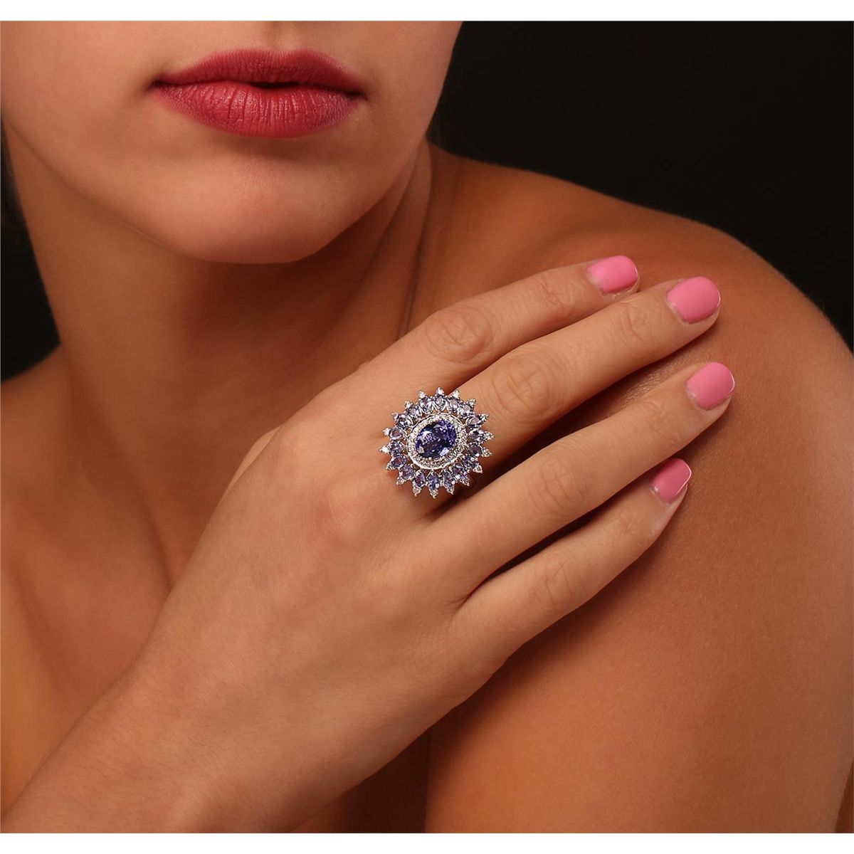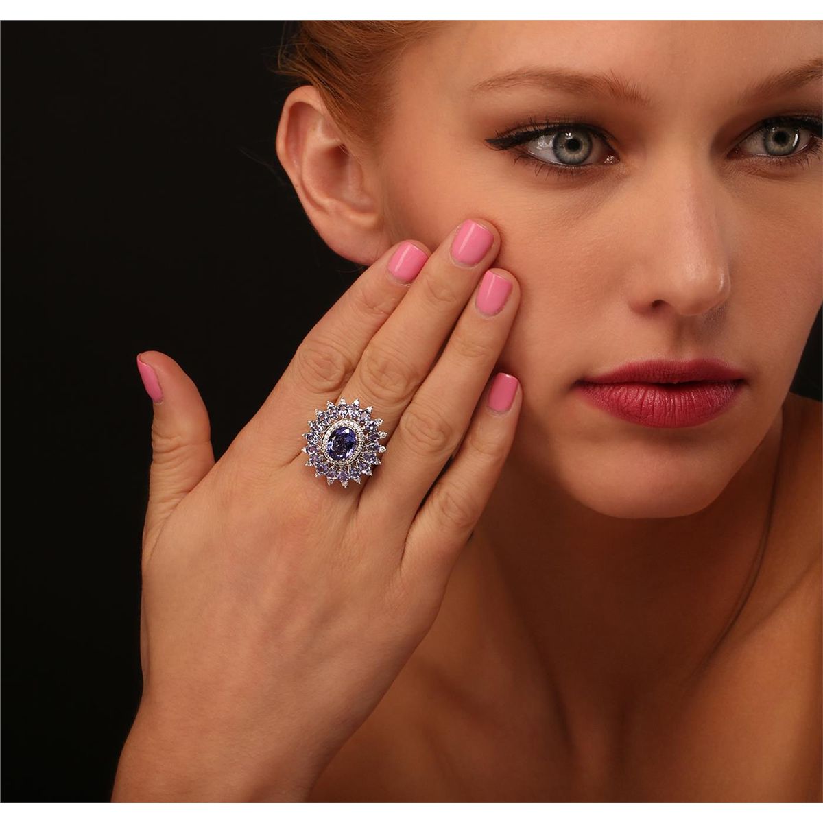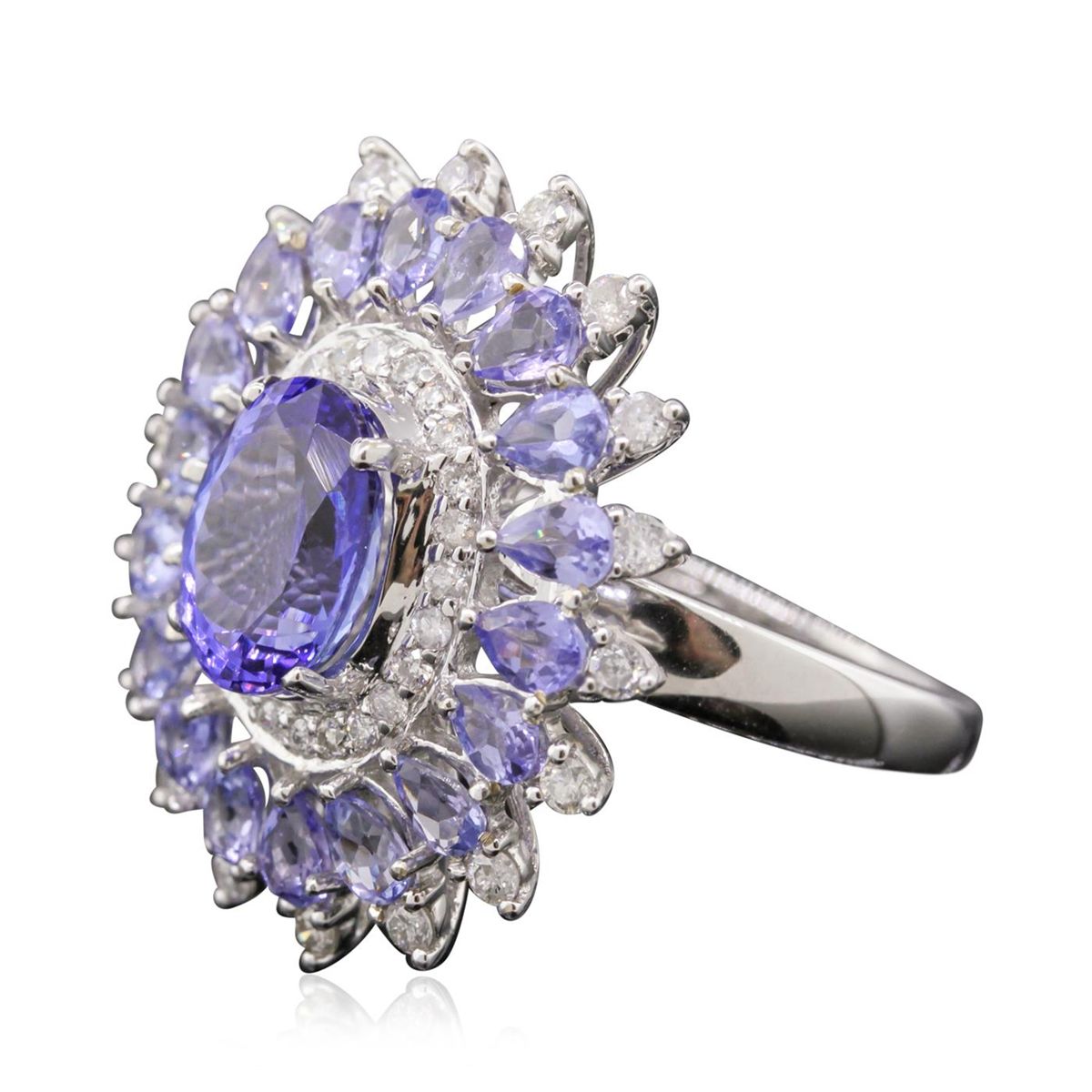 One electronically tested 14KT white gold ladies cast tanzanite and diamond ring with a bright polish finish. Condition is new, good workmanship. The featured tanzanite is set within a stylized tanzanite and diamond bezel, completed by a two millimeter wide band. Trademark is Orianne. Identified with markings of "14K". Containing: One prong set oval mixed cut natural tanzanite, measuring 10.00 x 7.60 x 4.94mm, 6%. bulge factor, approximate weight of 2.72ct., clarity is eye clean, type I, medium dark, very slightly grayish, bluish violet color, (GIA bV 6/3), cut is good. Transmitting light with no distortion, transparent. Graded in the setting. Eighteen prong set pear mixed cut natural tanzanites, measuring 3.50 x 2.70 x 1.50mm, approximate total weight of 1.72ct., clarity is eye clean, type I, medium, very slightly grayish, violet color, (GIA V 5/3), cut is good. Transmitting light with no distortion, transparent. Measurements & the color grade are an average for the group. Graded in the setting. Tanzanite is a very rare gemstone that is only found in the country of Tanzania. Originally discovered in 1967. Tiffany & Company, named the stone Tanzanite. It is found in the Usumburu Mountains that border the Umba Valley of northern Tanzania. Tanzanite occurs in gray, brown, violet, blue, reddish-purple, & green. The gem is interesting because of its exceptional pleochroism. Rotated in different directions a tanzanite will exhibit multiple changes of color. Tanzanite has a low tolerance to ultrasonic cleaning, and should not be cleaned using this method. Forty-Two prong set round brilliant cut diamonds, measuring 1.80 - 1.40 x 0.96mm (depth est.) approximate. Total Weight of 42 Stones = 0.65ct. Graded in the setting. Clarity: SI-1 to I-1. Color: G - I. Total Weight of Colored Stones 4.44ct. Total Weight of Diamonds 0.65ct. Total Weight of Ring 8.36 grams. AIG Appraised at $11,205.00.