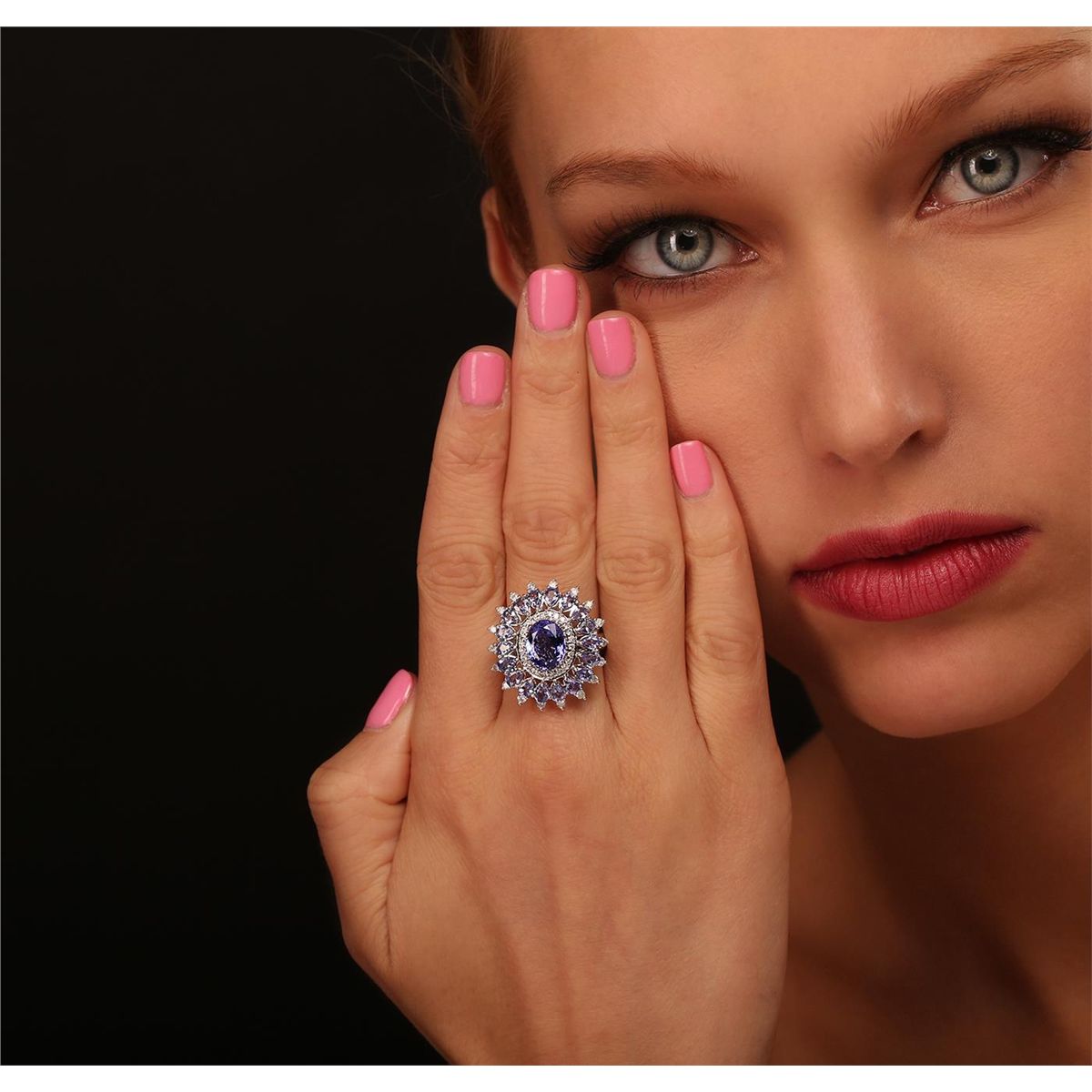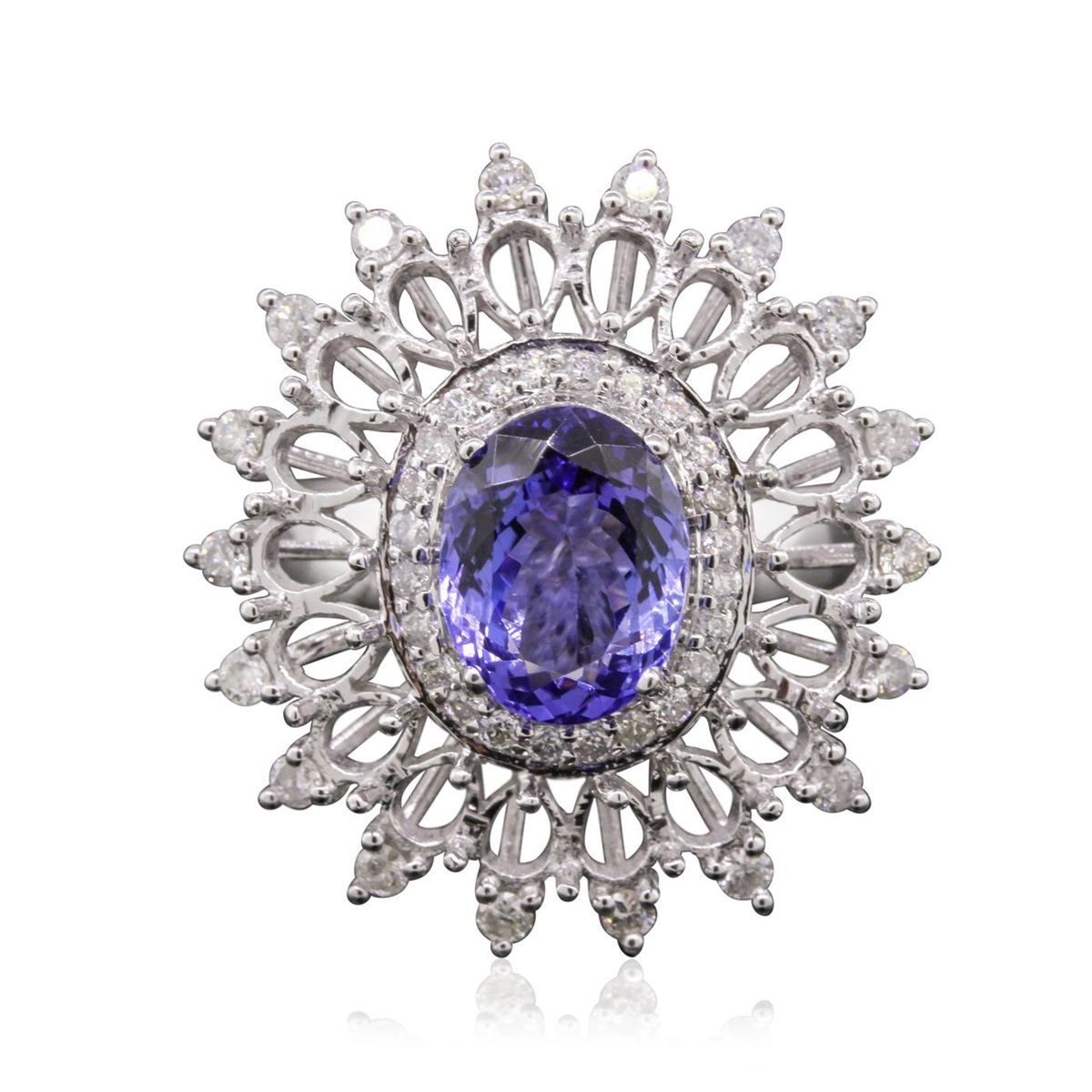 One electronically tested 14KT white gold ladies cast tanzanite and diamond ring with a bright polish finish. Condition is new, good workmanship. The featured tanzanite is set within a stylized tanzanite and diamond bezel, completed by a two millimeter wide band. Trademark is Orianne. Identified with markings of "14K". Containing: One prong set oval mixed cut natural tanzanite, measuring 10.00 x 7.60 x 4.94mm, 6%. bulge factor, approximate weight of 2.72ct., clarity is eye clean, type I, medium dark, very slightly grayish, bluish violet color, (GIA bV 6/3), cut is good. Transmitting light with no distortion, transparent. Graded in the setting. Eighteen prong set pear mixed cut natural tanzanites, measuring 3.50 x 2.70 x 1.50mm, approximate total weight of 1.72ct., clarity is eye clean, type I, medium, very slightly grayish, violet color, (GIA V 5/3), cut is good. Transmitting light with no distortion, transparent. Measurements & the color grade are an average for the group. Graded in the setting. Tanzanite is a very rare gemstone that is only found in the country of Tanzania. Originally discovered in 1967. Tiffany & Company, named the stone Tanzanite. It is found in the Usumburu Mountains that border the Umba Valley of northern Tanzania. Tanzanite occurs in gray, brown, violet, blue, reddish-purple, & green. The gem is interesting because of its exceptional pleochroism. Rotated in different directions a tanzanite will exhibit multiple changes of color. Tanzanite has a low tolerance to ultrasonic cleaning, and should not be cleaned using this method. Forty-Two prong set round brilliant cut diamonds, measuring 1.80 - 1.40 x 0.96mm (depth est.) approximate. Total Weight of 42 Stones = 0.65ct. Graded in the setting. Clarity: SI-1 to I-1. Color: G - I. Total Weight of Colored Stones 4.44ct. Total Weight of Diamonds 0.65ct. Total Weight of Ring 8.36 grams. AIG Appraised at $11,205.00.
