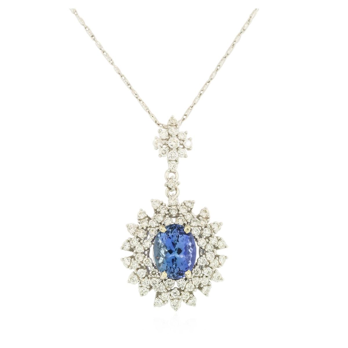 One electronically tested 14KT white gold ladies cast & assembled tanzanite and diamond pendant with chain. The pendant features a tanzanite set within a stylized diamond bezel, completed by a diamond set bail. The pendant is supported by an eighteen inch length 14KT white gold designer style chain, terminating in a lobster claw clasp. Bright polish finish. Trademark is Orianne. Identified with markings of "14K". Condition is new, good workmanship. Containing: One prong set oval brilliant cut natural tanzanite, measuring 10.90 x 8.45 x 6.70mm, 6% bulge factor, approximate weight of 4.45ct., clarity is eye clean, type I, medium dark, very slightly grayish, bluish violet color, (GIA bV 6/3), cut is good. Transmitting light with no distortion, transparent. Graded in the setting. Tanzanite is a very rare gemstone that is only found in the country of Tanzania. Originally discovered in 1967. Tiffany & Company, named the stone Tanzanite. It is found in the Usumburu Mountains that border the Umba Valley of northern Tanzania. Tanzanite occurs in gray, brown, violet, blue, reddish-purple, & green. The gem is interesting because of its exceptional pleochroism. Rotated in different directions a tanzanite will exhibit multiple changes of color. Tanzanite has a low tolerance to ultrasonic cleaning, and should not be cleaned using this method. Seventy-Two prong set round brilliant cut diamonds, measuring 1.90 - 1.80 x 1.11mm (depth est.) approximate total weight of 72 Stones = 1.76ct. Graded in the setting. Clarity: SI-1 to I-1. Color: G - I. Total Weight of Colored Stones 4.45ct. Total Weight of Diamonds 1.76ct. Total Weight of Pendant With Chain 7.15 grams. AIG Appraised at $17,290.00.