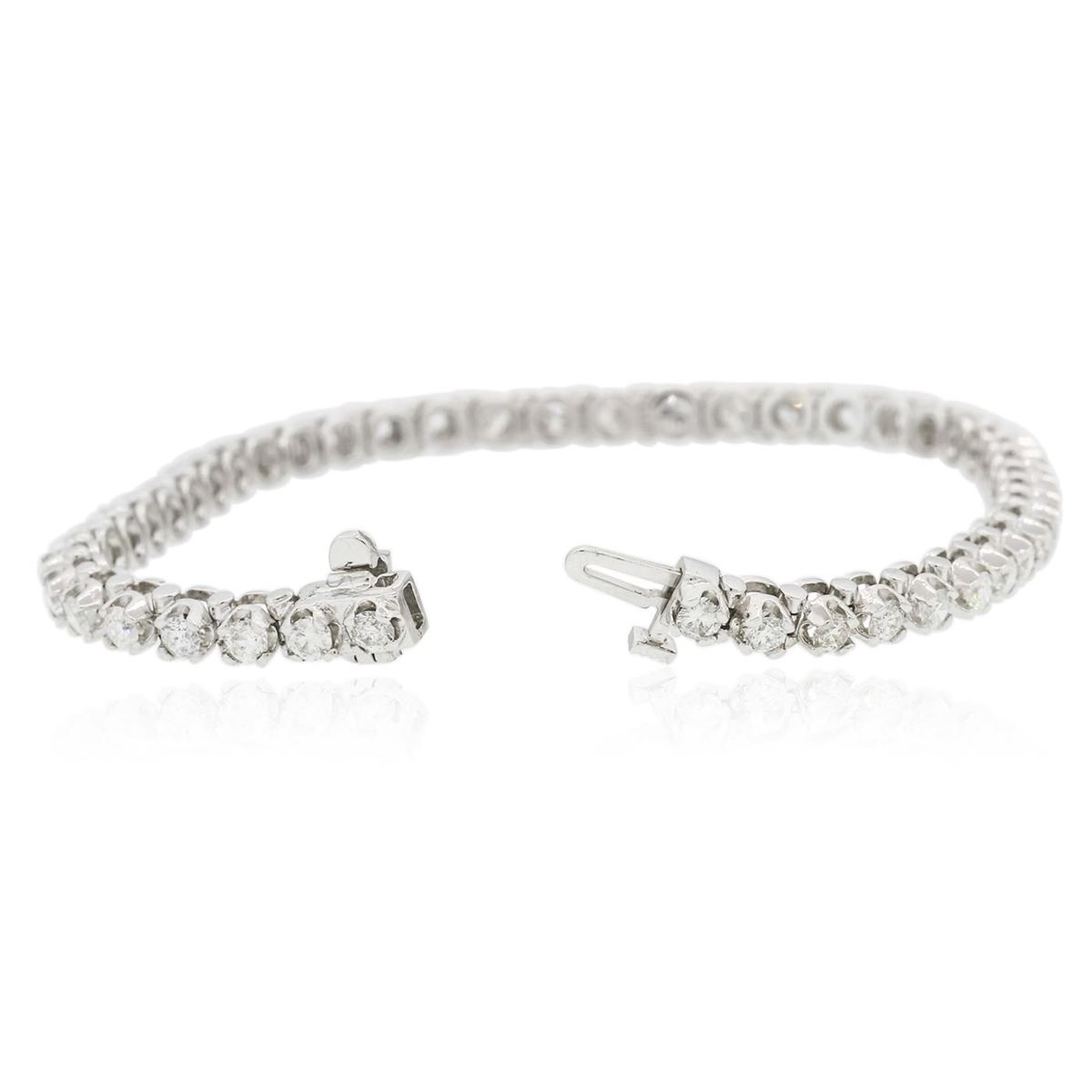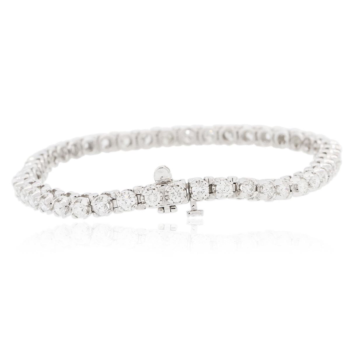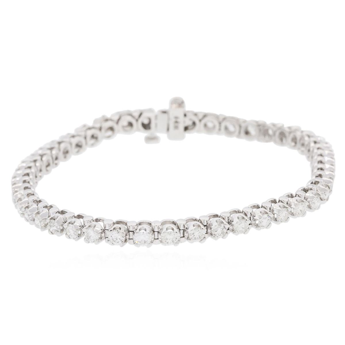 One electronically tested 14KT white gold ladies combination cast & assembled tennis bracelet with a hidden box clasp with a bright polish finish. Condition is new. Measurements: 7" in length. Identified with markings of "14K". Containing: Forty-Five prong set round brilliant cut diamonds, measuring 3.00 - 3.00 x 1.80mm (depth est.) approximate total weight of 45 Stones = 4.45ct. Clarity: SI-2 to I-1. Color: G - J, Cut is Good. All diamonds are graded in the mounting, unless otherwise stated. Total Weight of Diamonds 4.45ct. Total Weight of Bracelet 13.10 grams. GGL Appraised at $16,535.00.