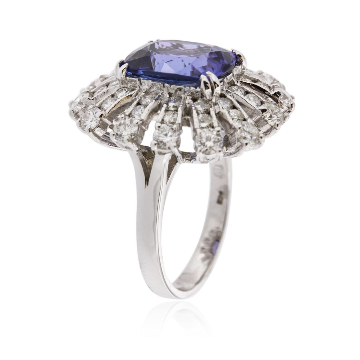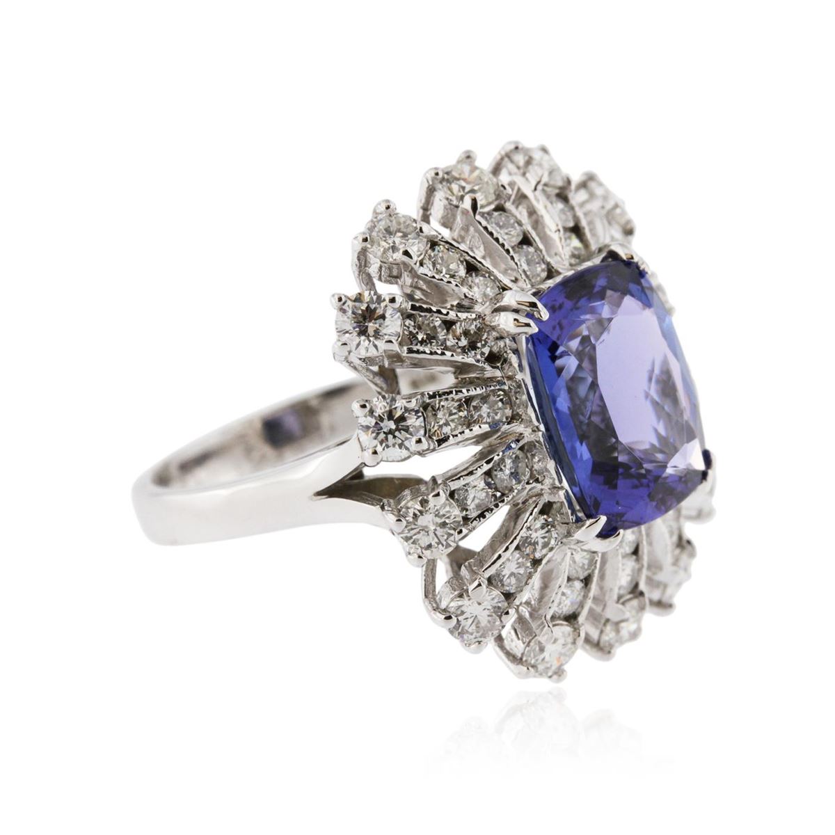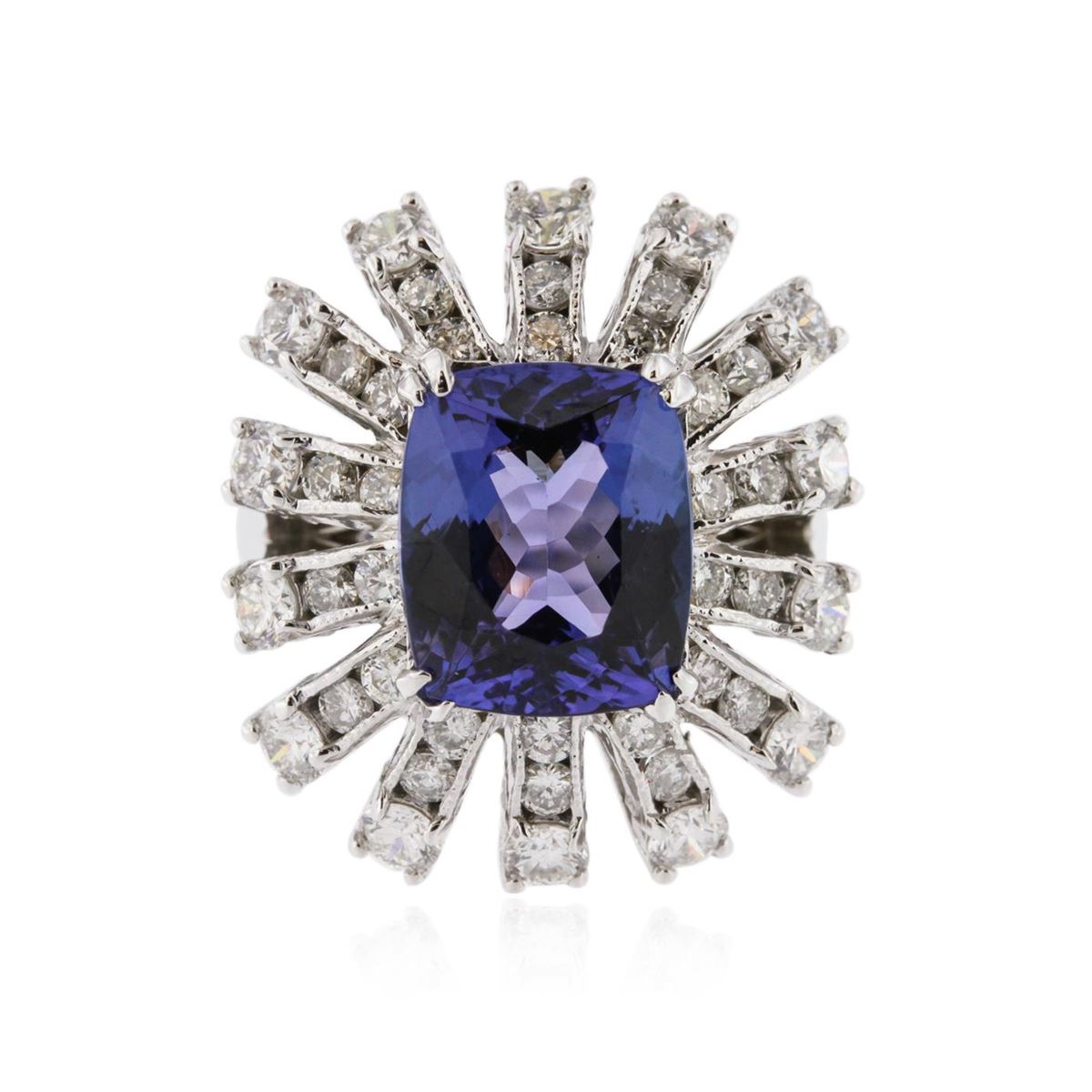 One polished, stamped, and electronically tested solid 14KT White Gold ring mounted with: 1 genuine tanzanite center stone weighing 4.46 carats and 42 genuine round diamonds weighing 1.94 carats. This item weighs 7.5 grams, condition is new, excellent workmanship. AIGL Appraised at $11,100.00.