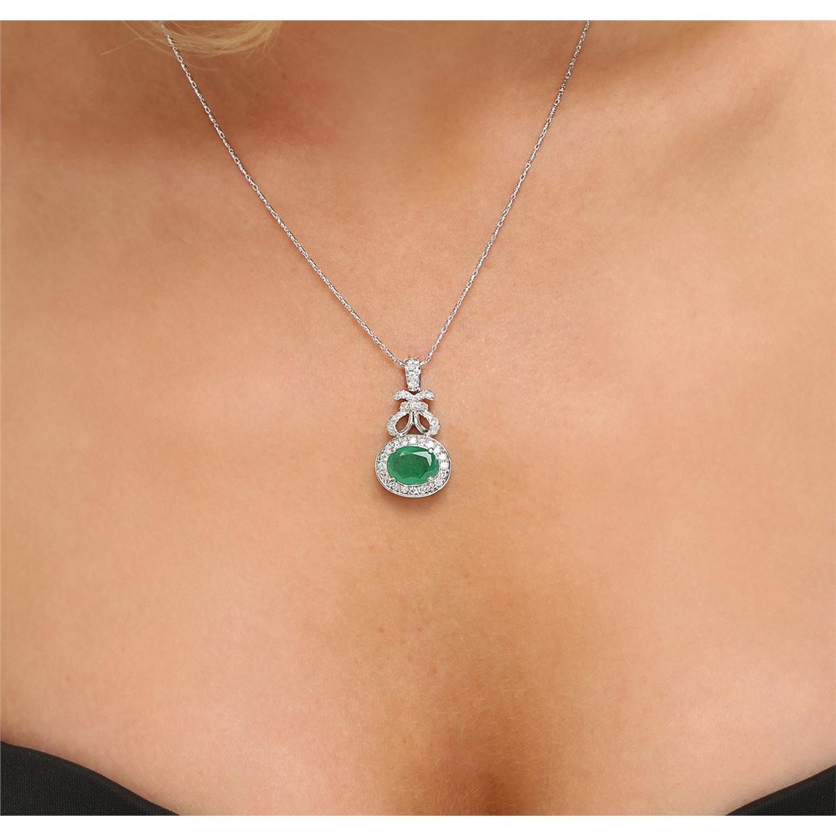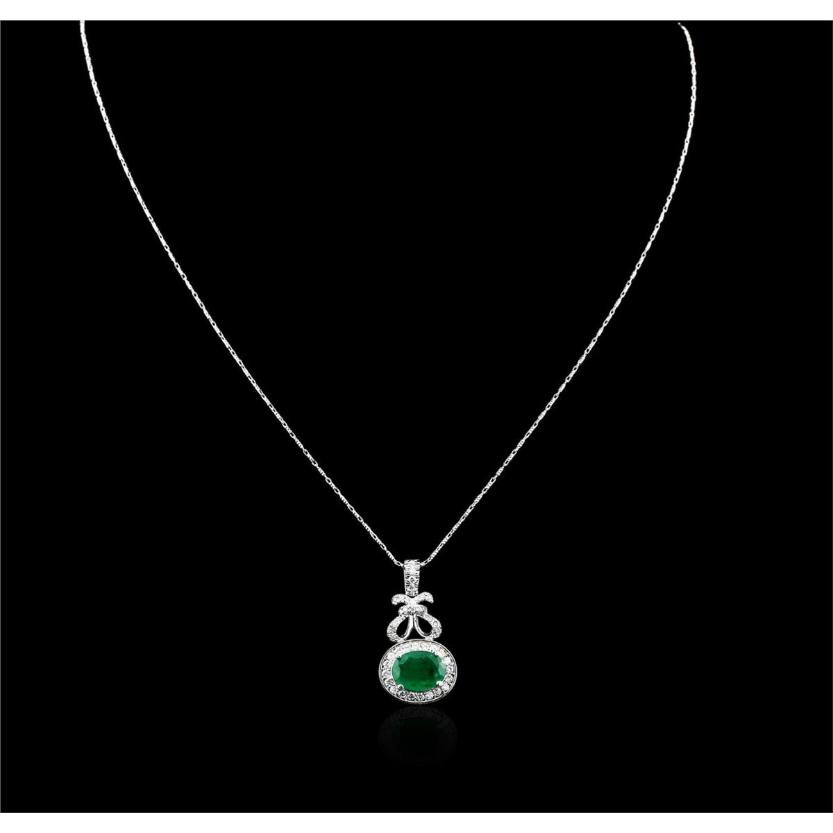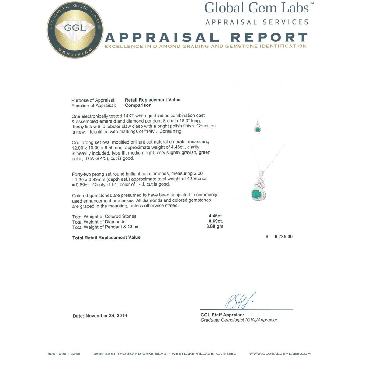 One electronically tested 14KT white gold ladies combination cast & assembled emerald and diamond pendant & chain 18.0" long, fancy link with a lobster claw clasp with a bright polish finish. Identified with markings of "14K". Condition is new. Containing: One prong set oval modified brilliant cut natural emerald, measuring 12.00 x 10.00 x 6.50mm, approximate weight of 4.46ct., clarity is heavily included, type III, medium light, very slightly grayish, green color, (GIA G 4/3), cut is good. Forty-Two prong set round brilliant cut diamonds, measuring 2.00 - 1.30 x 0.99mm (depth est.) approximate total weight of 42 Stones = 0.69ct. Clarity: I-1. Color: I - J, Cut is Good. Colored gemstones are presumed to have been subjected to commonly used enhancement processes. All diamonds and colored gemstones are graded in the mounting, unless otherwise stated. Total Weight of Colored Stones 4.46ct. Total Weight of Diamonds 0.69ct. Total Weight of Pendant & Chain 8.80 grams. GGL Appraised at $6,785.00.