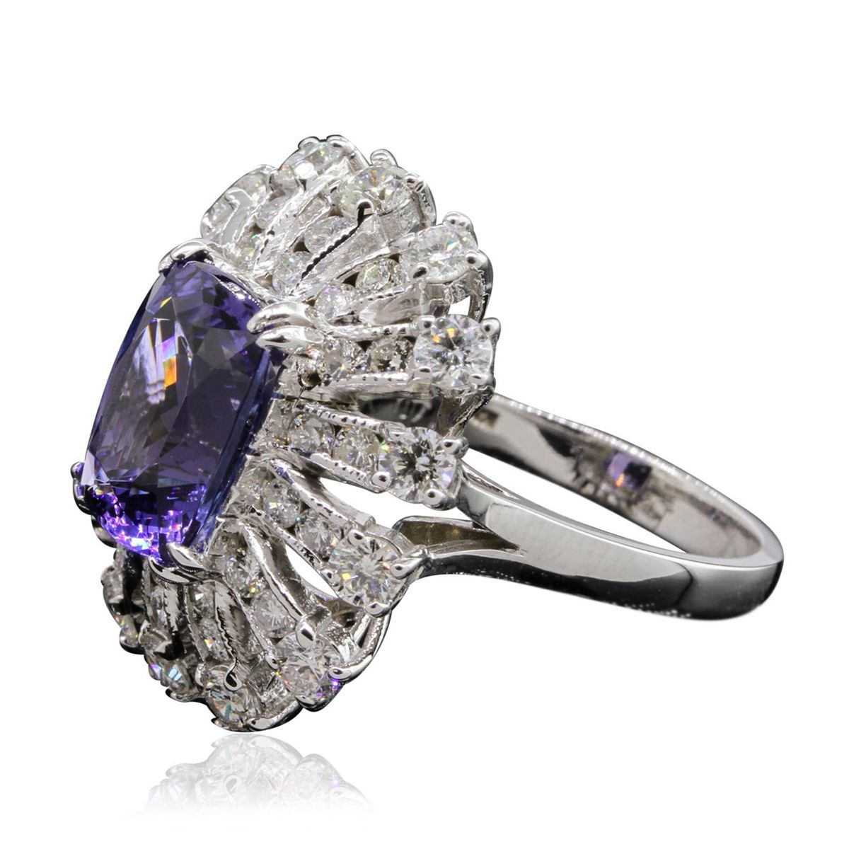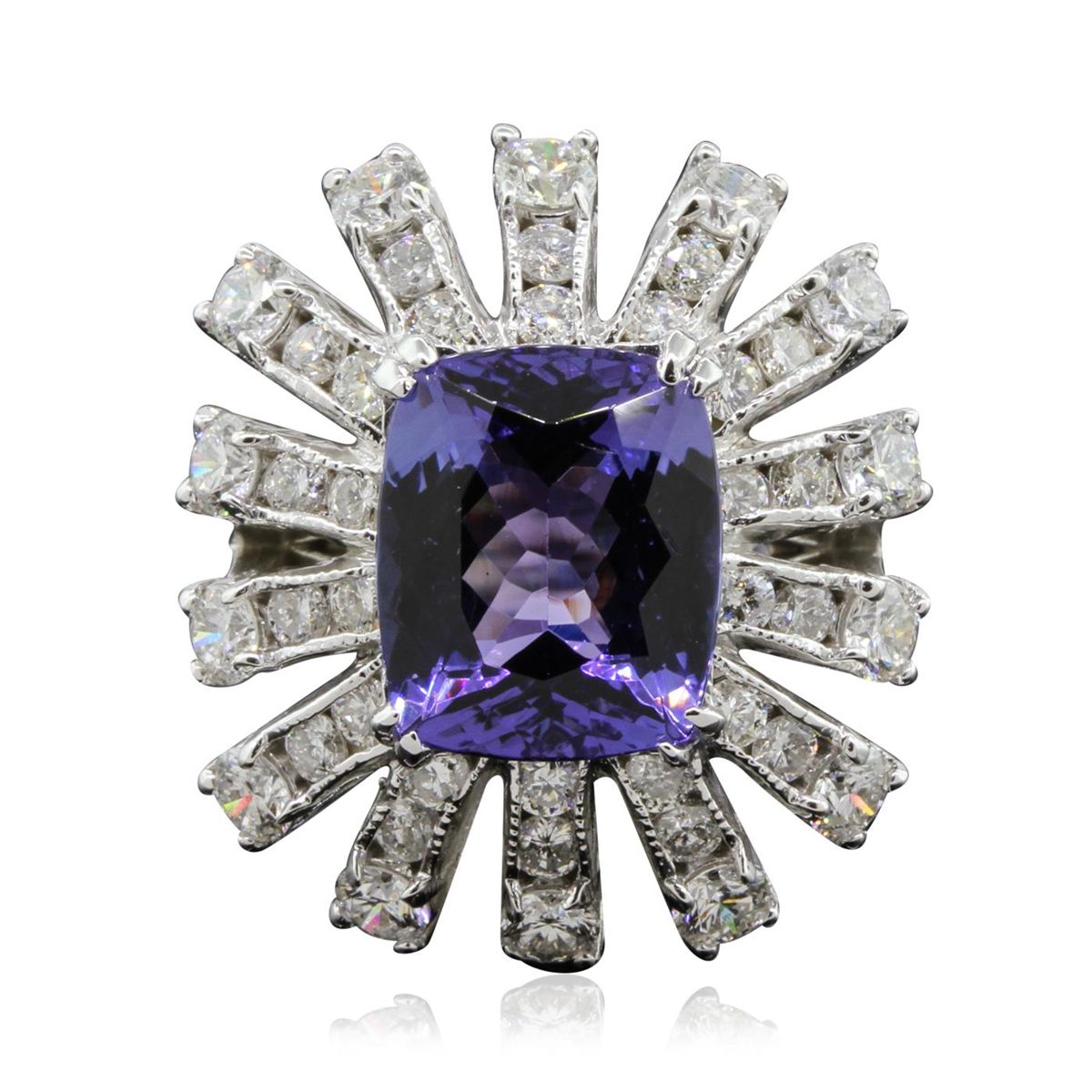 One polished, stamped, and electronically tested solid 14KT White Gold ring mounted with: 1 genuine tanzanite center stone weighing 4.46 carats and 42 genuine round diamonds weighing 1.94 carats. This item weighs 7.5 grams, condition is new, excellent workmanship. AIGL Appraised at $11,100.00.