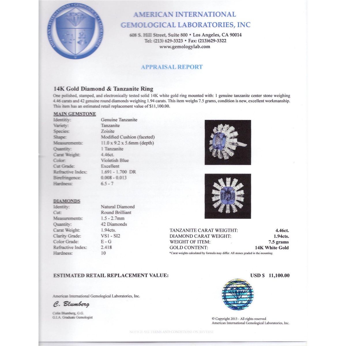 One polished, stamped, and electronically tested solid 14KT White Gold ring mounted with: 1 genuine tanzanite center stone weighing 4.46 carats and 42 genuine round diamonds weighing 1.94 carats. This item weighs 7.5 grams, condition is new, excellent workmanship. AIGL Appraised at $11,100.00.
