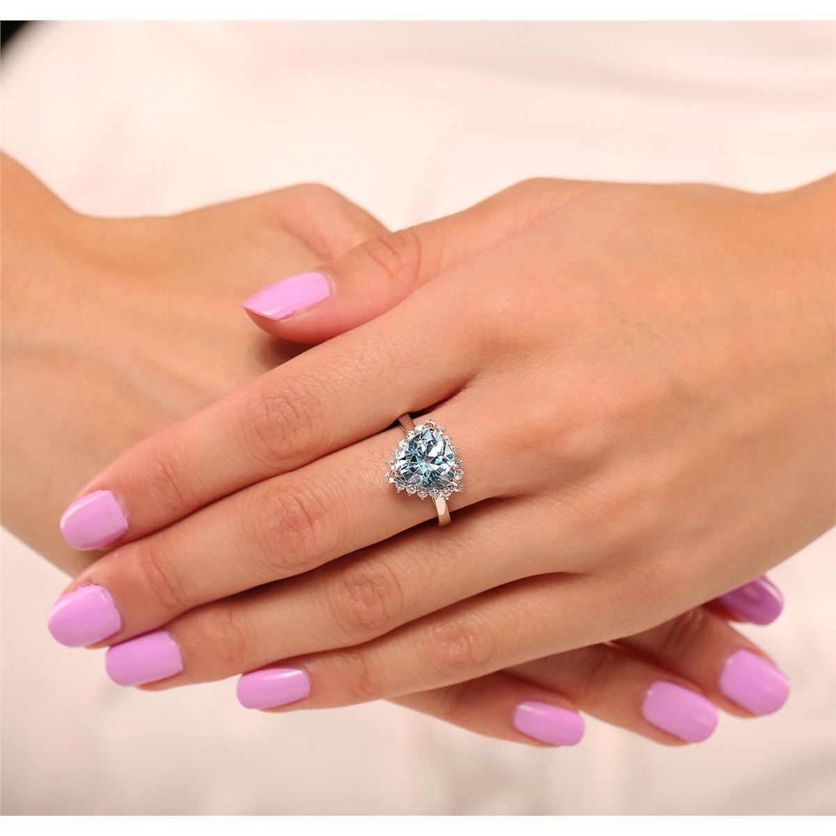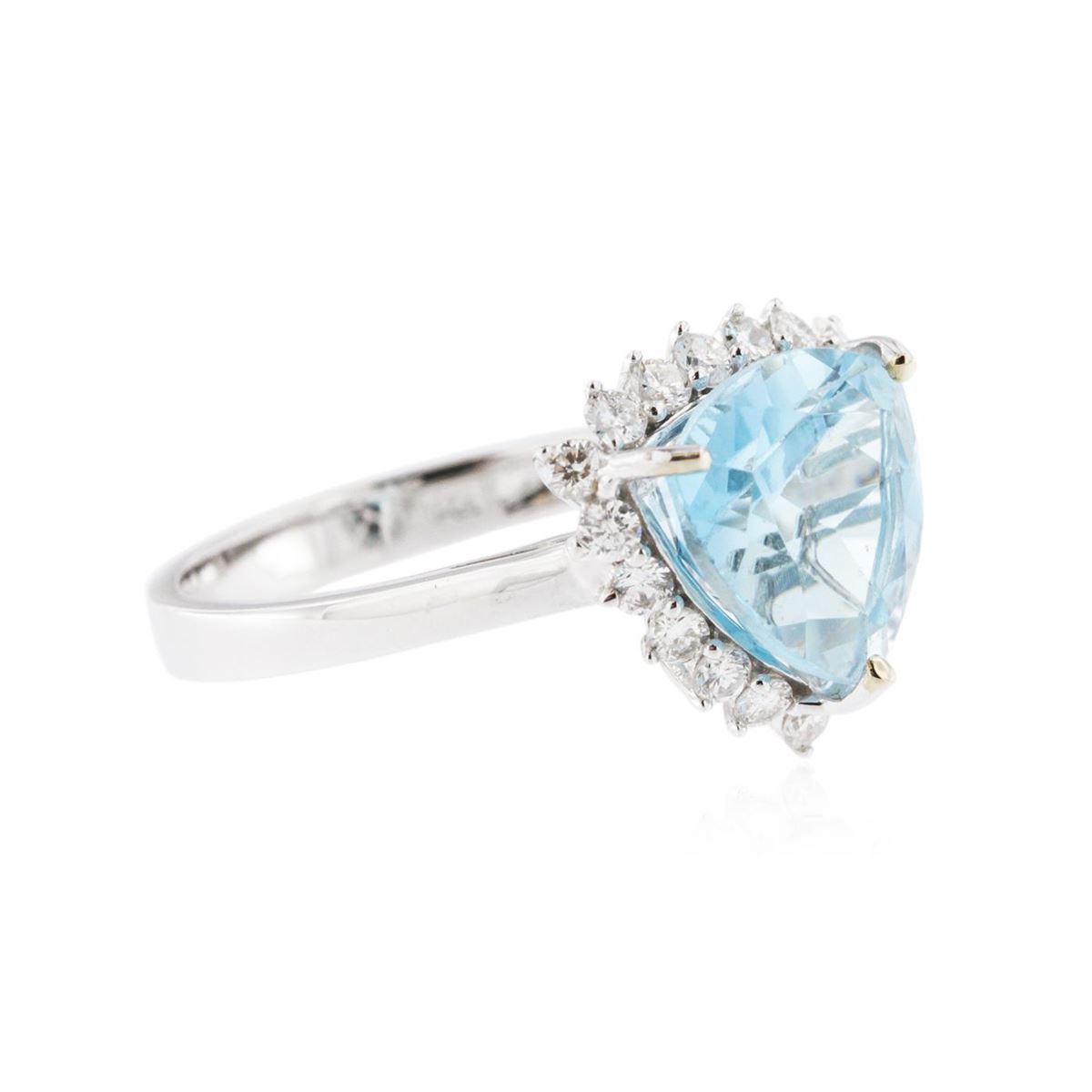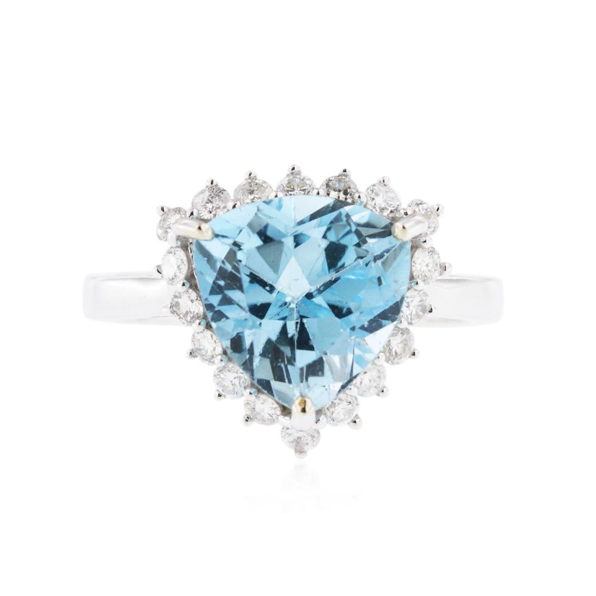 One electronically tested 14KT white gold ladies cast blue topaz and diamond ring with a bright polish finish. Condition is new, good workmanship. The featured topaz is set within a two tiered diamond bezel supported by split shoulders completed by a three millimeter wide band. Trademark is Orianne. Identified with markings of "14K". Containing: One prong set emerald step cut natural blue topaz, measuring 10.00 x 8.00 x 4.60mm, 10%. bulge factor, approximate weight of 3.86ct., clarity is eye clean, type I, medium, very slightly grayish, very slightly greenish blue color, (GIA vslgB 5/3), cut is good. Transmitting light with no distortion, transparent. Graded in the setting. A deposit of a thin layer has been applied to the topaz to produce the intense color effect. The process utilizes a very high temperature treatment, diffusion of ions into the topaz, plus in some cases neutron bombardment has been used to create the color center. Diffusion processes causes the added ions to become part of the crystal surface with no distinct boundary. Do not put a gem treated in this manner into an ultrasonic cleaner. Forty-Eight prong set round brilliant cut diamonds, measuring 1.60 - 1.30 x 0.87mm (depth est.) approximate. Total Weight of 48 Stones = 0.63ct. Graded in the setting. Clarity: I-1 to I-2. Color: G - I. Total Weight of Colored Stones 3.86ct. Total Weight of Diamonds 0.63ct. Total Weight of Ring 6.81 grams. AIG Appraised at $3,010.00.