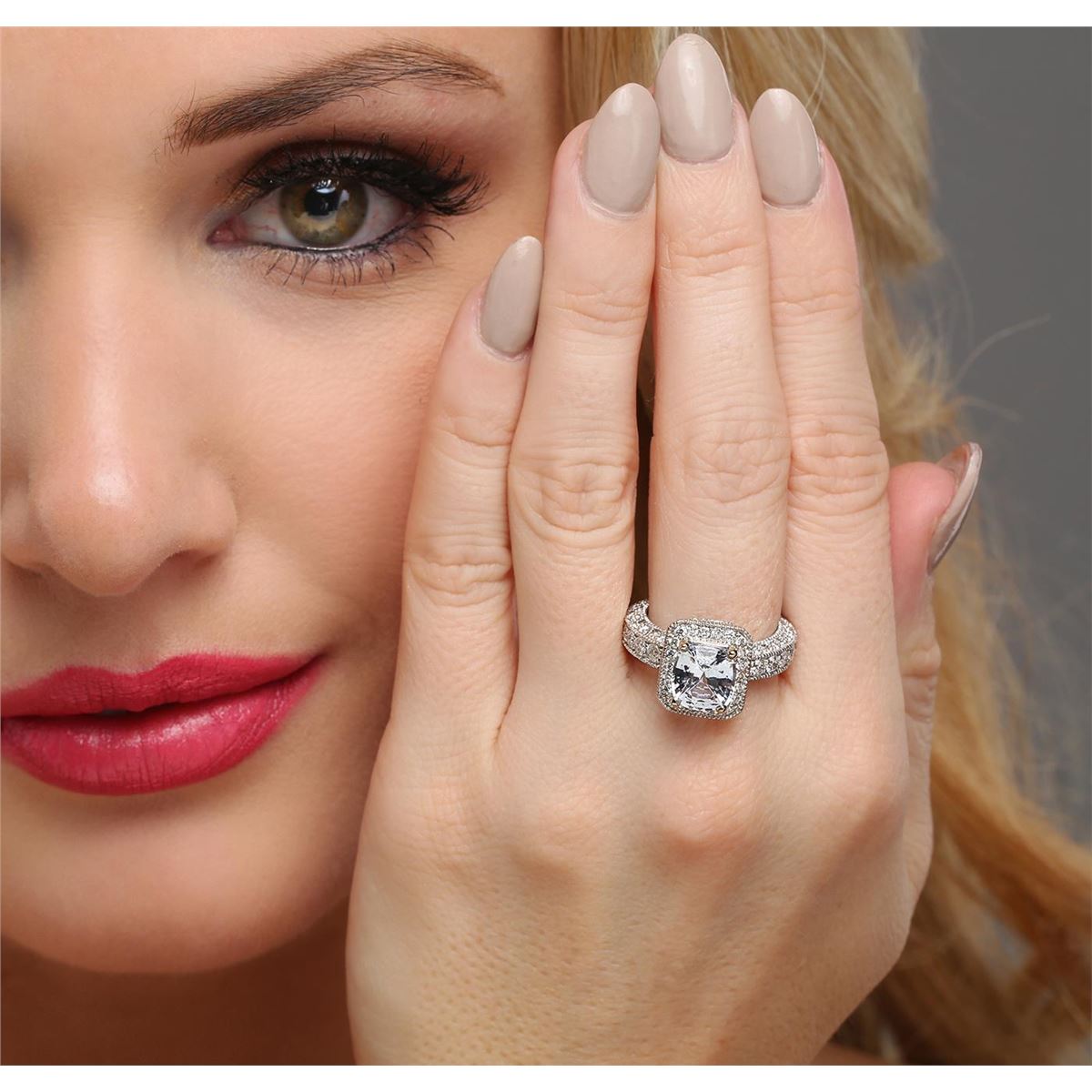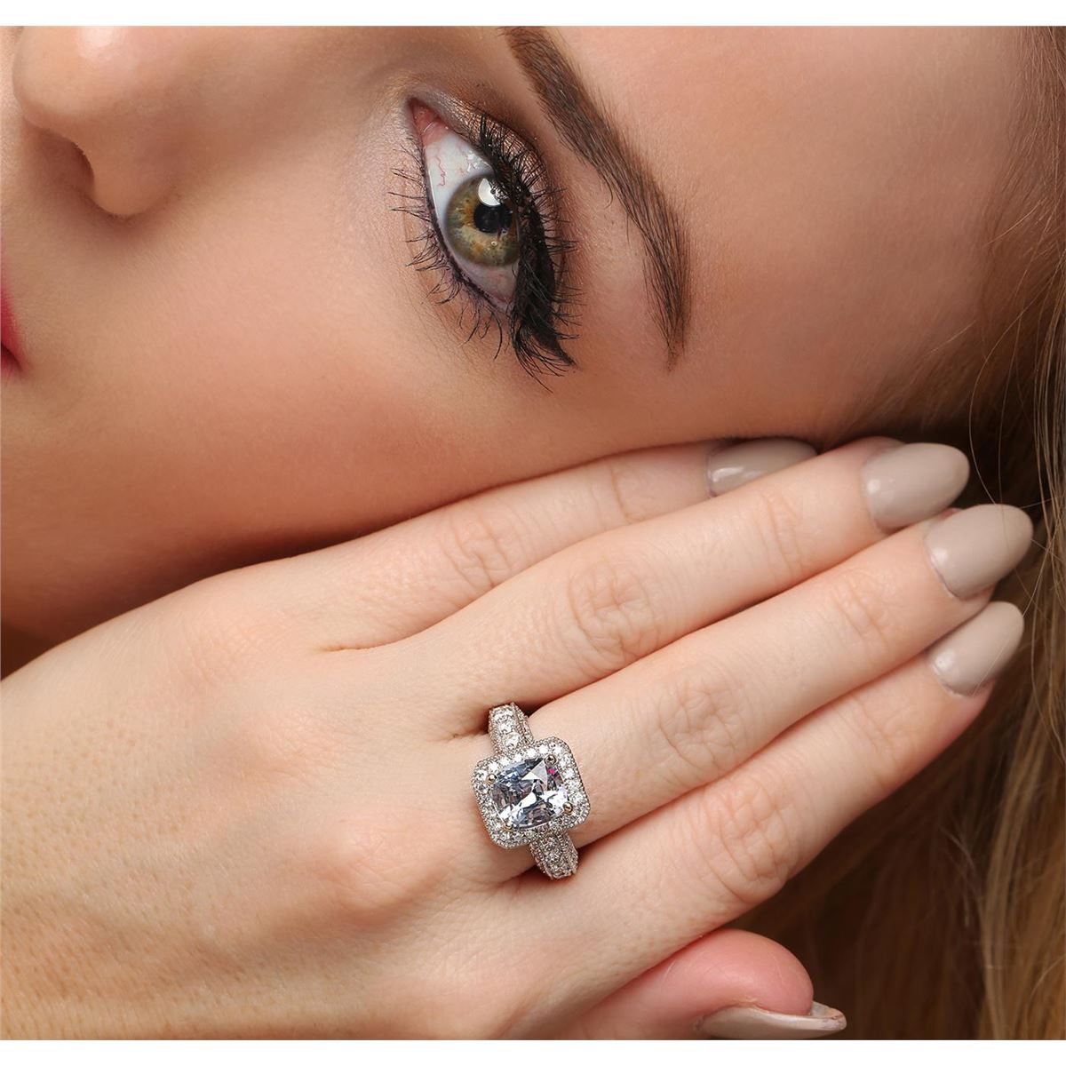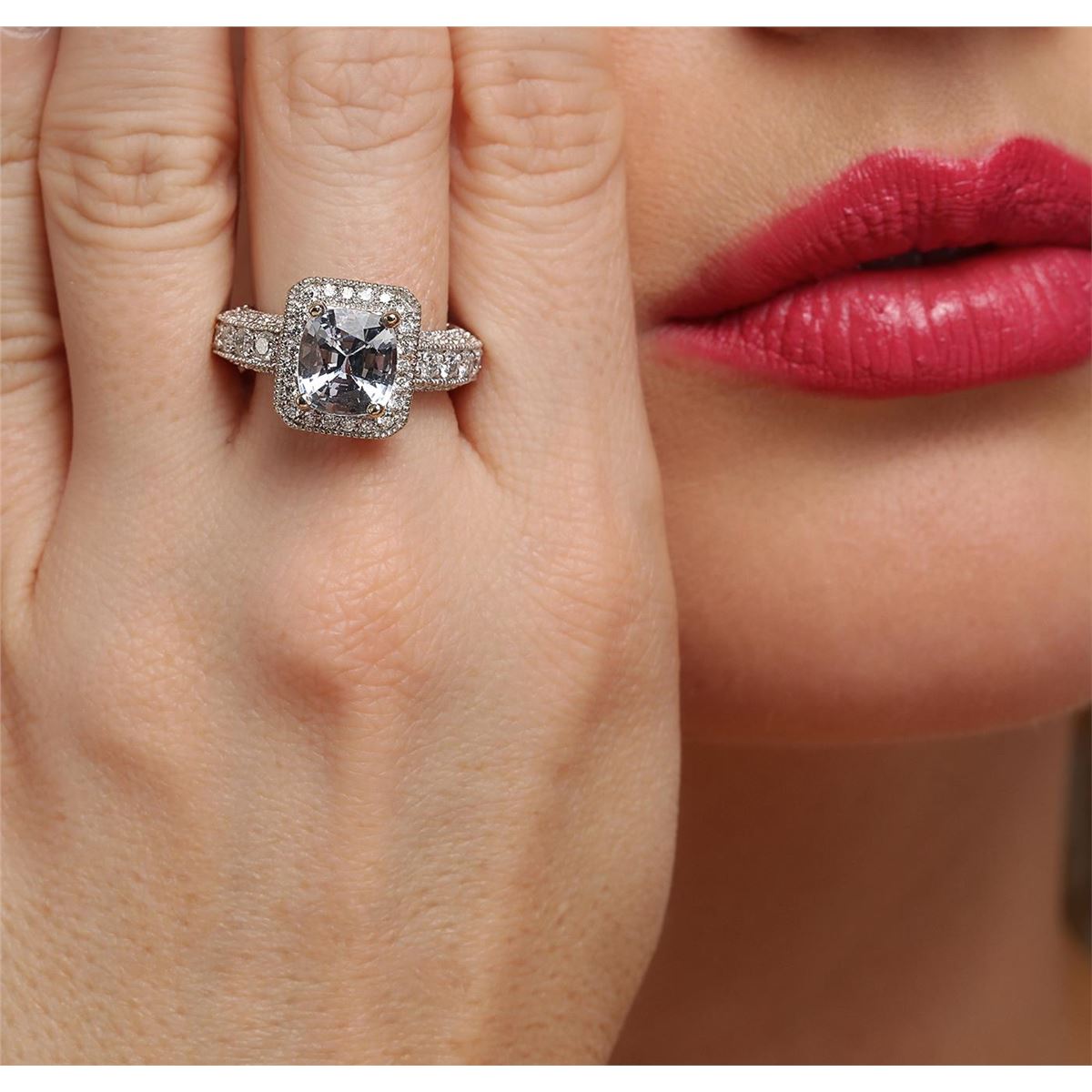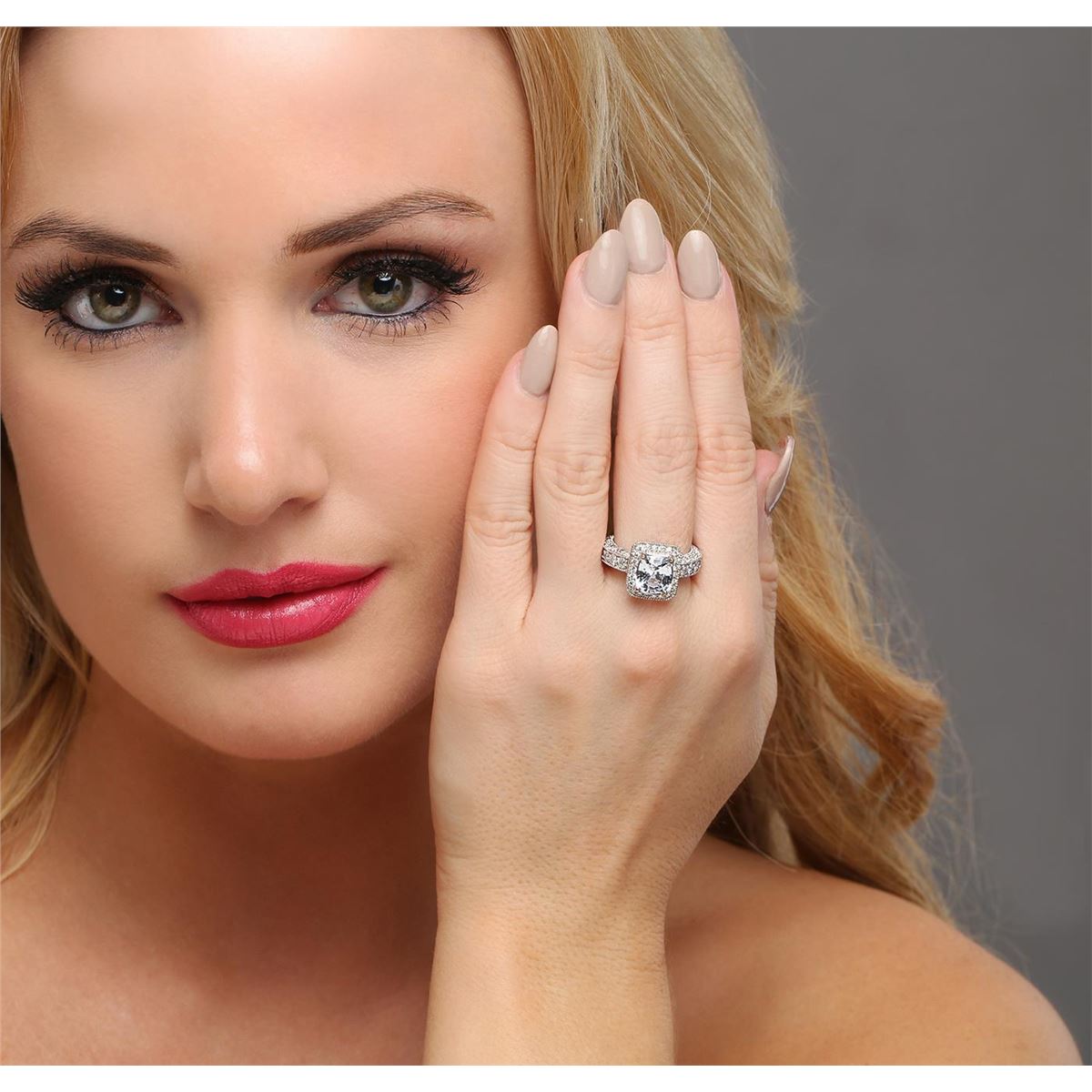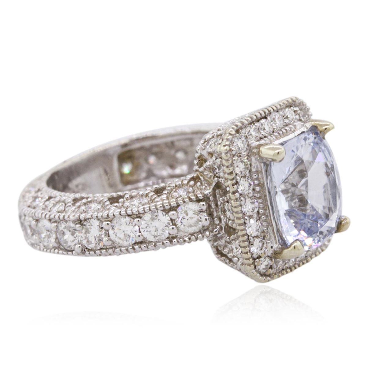 One electronically tested 14KT white gold ladies cast blue zircon and diamond ring. The featured blue spinel is set within a diamond bezel supported by a diamond set under gallery and diamond set shoulders, completed by a five millimeter wide band. Bright polish finish with milgrain detailing throughout. Identified with markings of "14K". Condition is new, good workmanship. Containing: One prong set rectangular cushion mixed cut natural blue zircon, measuring 8.90 x 8.10 x 5.30mm, 6%. bulge factor, approximate weight of 4.47ct., clarity is slightly included, type I, medium light, slightly grayish, green blue color, (GIA GB 4/2), cut is good. Transmitting light with a minimum of distortion, transparent. Naturally occurring internal & external characteristics are present. Refractive index testing results of OTL. This is a conclusive result for zircon. Graded in the setting. Eighteen prong set round brilliant cut diamonds, measuring 2.50 - 2.40 x 1.47mm (depth est.) approximate total weight of 18 Stones = 1.06ct. Graded in the setting. Clarity: SI-2 to I-1. Color: H - J Fifty-Two prong set round brilliant cut diamonds, measuring 1.40 - 1.30 x 0.81mm (depth est.) approximate total weight of 52 Stones = 0.56ct. Graded in the setting. Clarity: SI-1 to I-1. Color: H - J. Total Weight of Colored Stones 4.47ct. Total Weight of Diamonds 1.62ct. Total Weight of Ring 7.95 grams. AIG Appraised at $6,365.00.