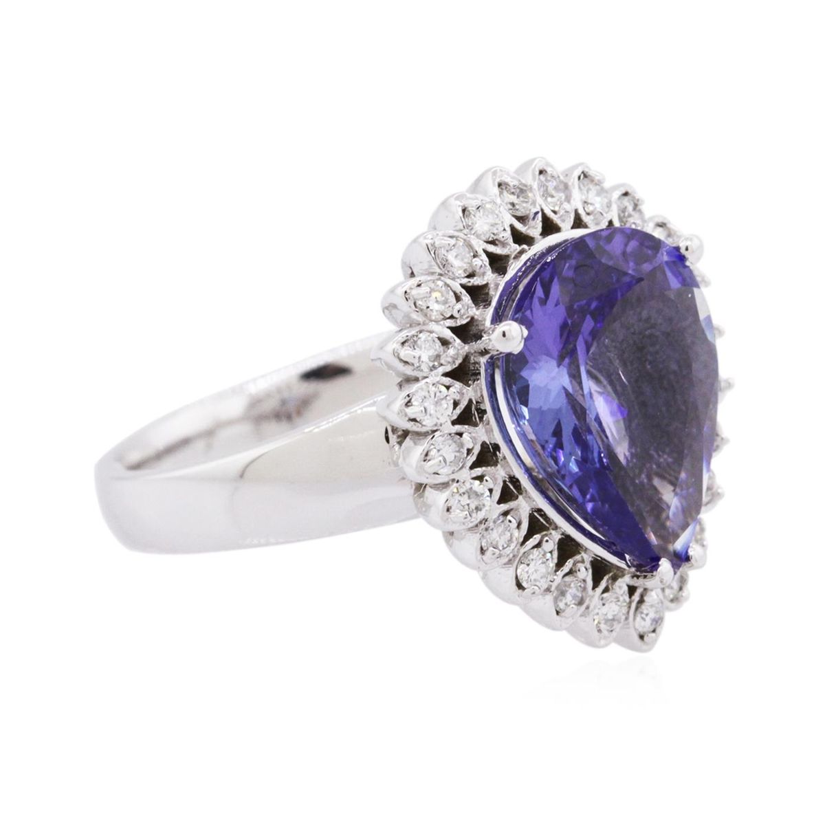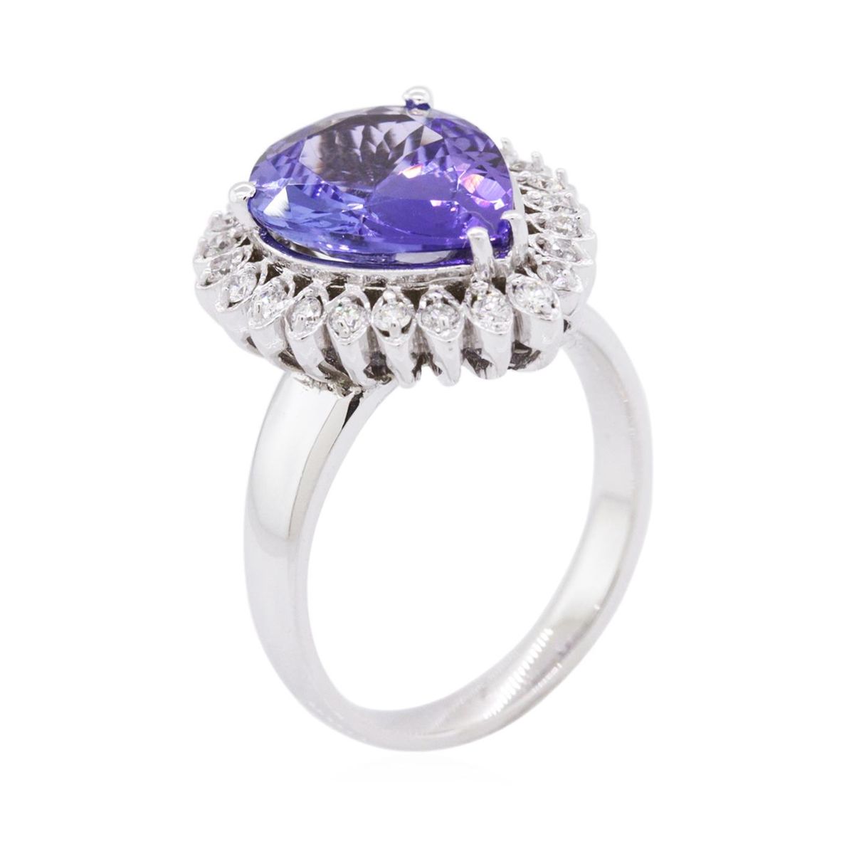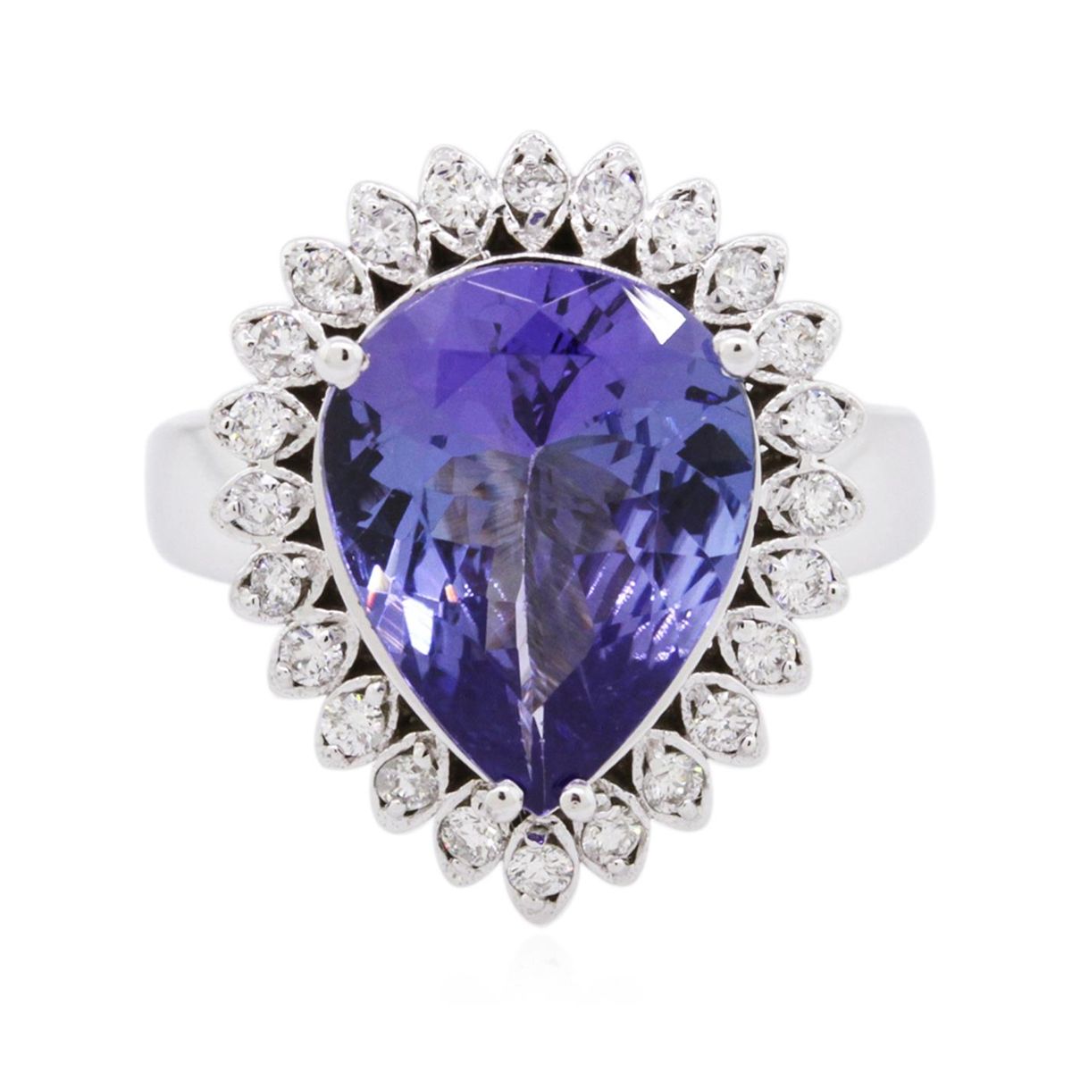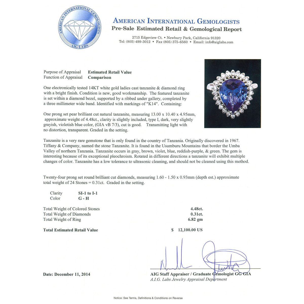 One electronically tested 14KT white gold ladies cast tanzanite & diamond ring with a bright finish. The featured tanzanite is set within a diamond bezel, supported by a ribbed under gallery, completed by a three millimeter wide band. Identified with markings of "K14". Condition is new, good workmanship. Containing: One prong set pear brilliant cut natural tanzanite, measuring 13.00 x 10.40 x 4.95mm, approximate weight of 4.48ct., clarity is slightly included, type I, dark, very slightly grayish, violetish blue color, (GIA vB 7/3), cut is good. Transmitting light with no distortion, transparent. Graded in the setting. Tanzanite is a very rare gemstone that is only found in the country of Tanzania. Originally discovered in 1967. Tiffany & Company, named the stone Tanzanite. It is found in the Usumburu Mountains that border the Umba Valley of northern Tanzania. Tanzanite occurs in gray, brown, violet, blue, reddish-purple, & green. The gem is interesting because of its exceptional pleochroism. Rotated in different directions a tanzanite will exhibit multiple changes of color. Tanzanite has a low tolerance to ultrasonic cleaning, and should not be cleaned using this method. Twenty-Four prong set round brilliant cut diamonds, measuring 1.60 - 1.50 x 0.93mm (depth est.) approximate total weight of 24 Stones = 0.31ct. Graded in the setting. Clarity: SI-1 to I-1. Color: G - H. Total Weight of Colored Stones 4.48ct. Total Weight of Diamonds 0.31ct. Total Weight of Ring 6.82 grams. AIG Appraised at $12,100.00.