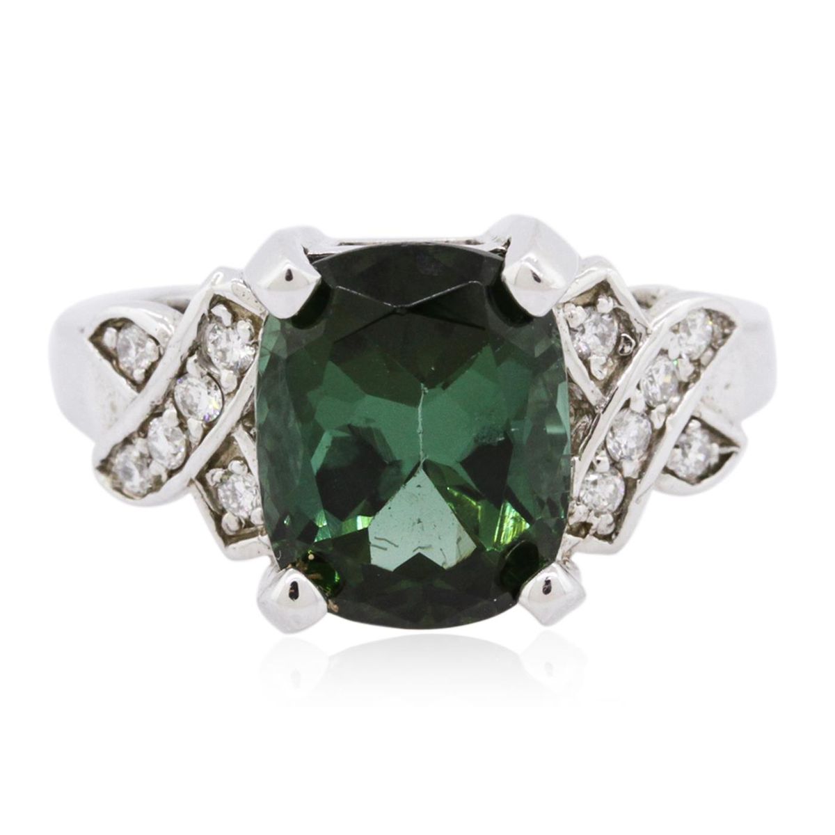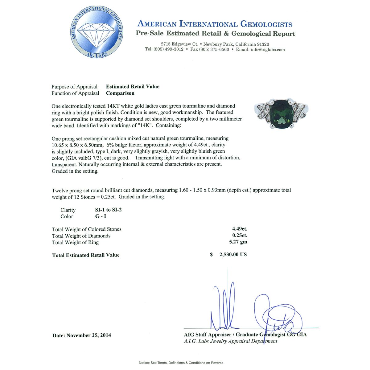 One electronically tested 14KT white gold ladies cast green tourmaline and diamond ring with a bright polish finish. The featured green tourmaline is supported by diamond set shoulders, completed by a two millimeter wide band. Identified with markings of "14K". Condition is new, good workmanship. Containing: One prong set rectangular cushion mixed cut natural green tourmaline, measuring 10.65 x 8.50 x 6.50mm, 6%. bulge factor, approximate weight of 4.49ct., clarity is slightly included, type I, dark, very slightly grayish, very slightly bluish green color, (GIA vslbG 7/3), cut is good. Transmitting light with a minimum of distortion, transparent. Naturally occurring internal & external characteristics are present. Graded in the setting. Twelve prong set round brilliant cut diamonds, measuring 1.60 - 1.50 x 0.93mm (depth est.) approximate total weight of 12 Stones = 0.25ct. Graded in the setting. Clarity: SI-1 to SI-2. Color: G - I. Total Weight of Colored Stones 4.49ct. Total Weight of Diamonds 0.25ct. Total Weight of Ring 5.27 grams. AIG Appraised at $2,530.00.