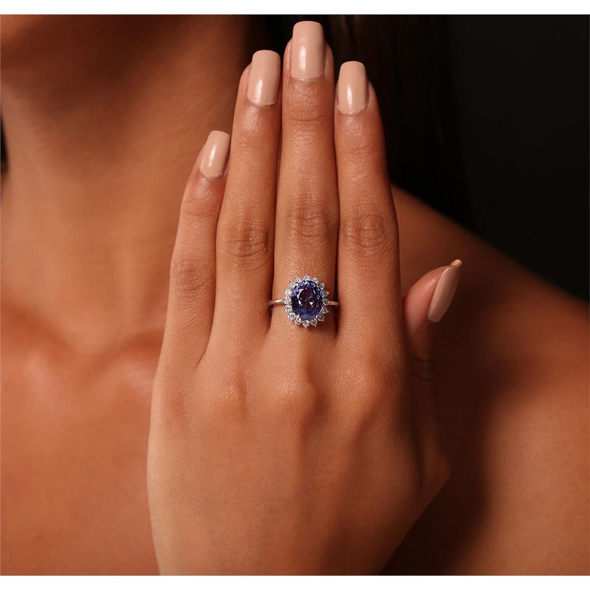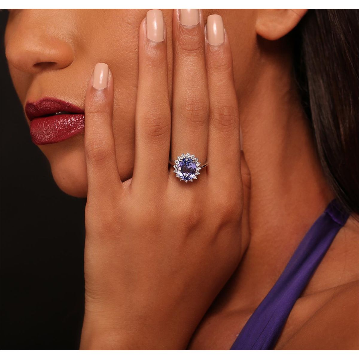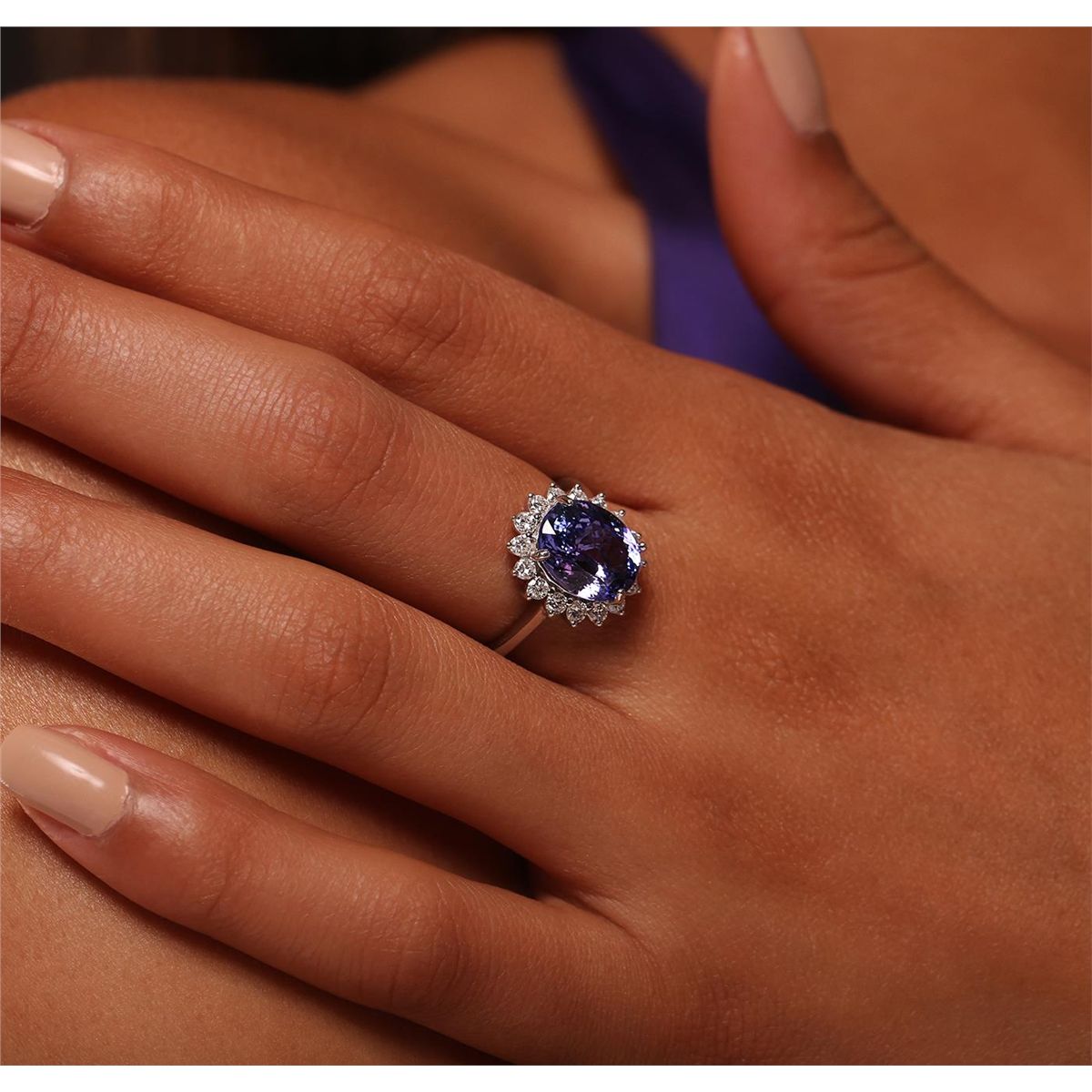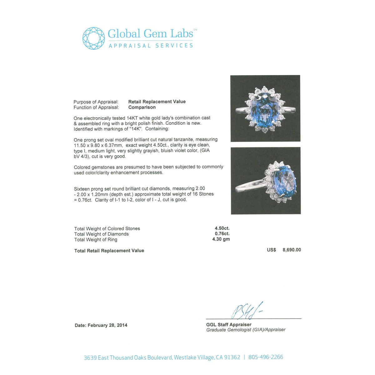 One electronically tested 14KT white gold Ladies combination cast & assembled ring with a bright polish finish. Condition is new. Identified with markings of "14K". Containing: One prong set oval modified brilliant cut natural tanzanite, measuring 11.50 x 9.80 x 6.37mm, exact weight 4.50ct., clarity is eye clean, type I, medium light, very slightly grayish, bluish violet color, (GIA bV 4/3), cut is very good. Colored gemstones are presumed to have been subjected to commonly used color/clarity enhancement processes. Sixteen prong set round brilliant cut diamonds, measuring 2.00 - 2.00 x 1.20mm (depth est.) approximate. Total Weight of 16 Stones = 0.76ct. Clarity: I-1 to I-2. Color: I - J, Cut is Good.. Total Weight of Colored Stones 4.50ct. Total Weight of Diamonds 0.76ct. Total Weight of Ring 4.30 grams. GGL Appraised at $8,690.00.
