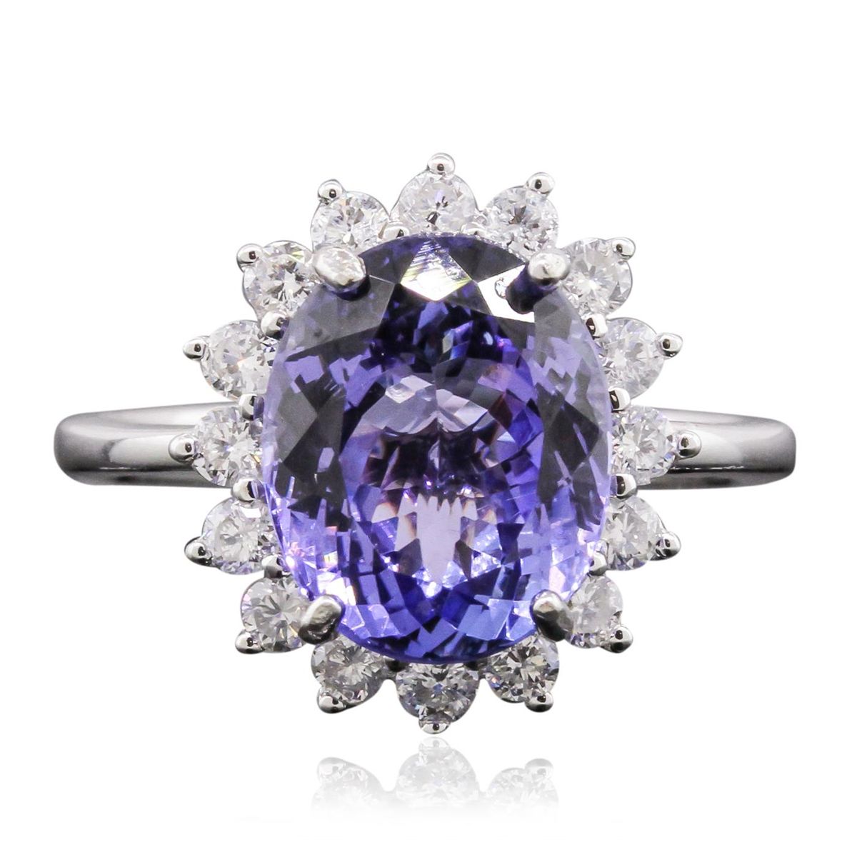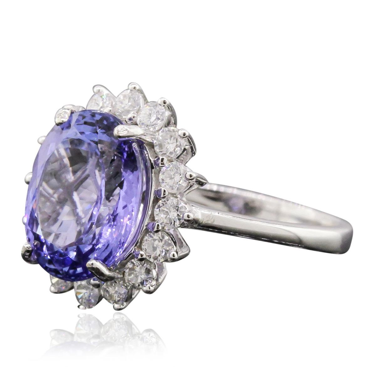 One electronically tested 14KT white gold Ladies combination cast & assembled ring with a bright polish finish. Condition is new. Identified with markings of "14K". Containing: One prong set oval modified brilliant cut natural tanzanite, measuring 11.50 x 9.80 x 6.37mm, exact weight 4.50ct., clarity is eye clean, type I, medium light, very slightly grayish, bluish violet color, (GIA bV 4/3), cut is very good. Colored gemstones are presumed to have been subjected to commonly used color/clarity enhancement processes. Sixteen prong set round brilliant cut diamonds, measuring 2.00 - 2.00 x 1.20mm (depth est.) approximate. Total Weight of 16 Stones = 0.76ct. Clarity: I-1 to I-2. Color: I - J, Cut is Good.. Total Weight of Colored Stones 4.50ct. Total Weight of Diamonds 0.76ct. Total Weight of Ring 4.30 grams. GGL Appraised at $8,690.00.