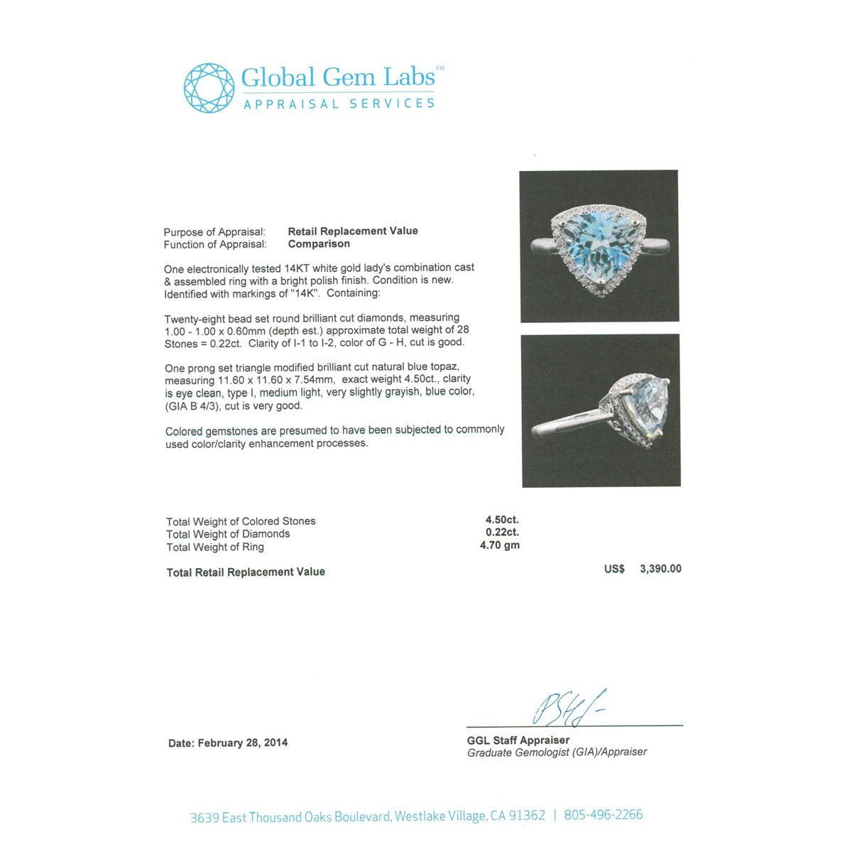 One electronically tested 14KT white gold Ladies combination cast & assembled ring with a bright polish finish. Condition is new. Identified with markings of "14K". Containing: Twenty-Eight bead set round brilliant cut diamonds, measuring 1.00 - 1.00 x 0.60mm (depth est.) approximate. Total Weight of 28 Stones = 0.22ct. Clarity: I-1 to I-2. Color: G - H, Cut is Good. One prong set triangle modified brilliant cut natural blue topaz, measuring 11.60 x 11.60 x 7.54mm, exact weight 4.50ct., clarity is eye clean, type I, medium light, very slightly grayish, blue color, (GIA B 4/3), cut is very good. Colored gemstones are presumed to have been subjected to commonly used color/clarity enhancement processes. Total Weight of Colored Stones 4.50ct. Total Weight of Diamonds 0.22ct. Total Weight of Ring 4.70 grams. GGL Appraised at $3,390.00.