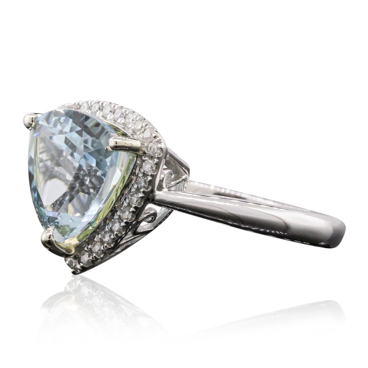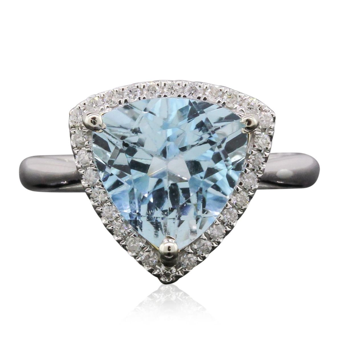 One electronically tested 14KT white gold Ladies combination cast & assembled ring with a bright polish finish. Condition is new. Identified with markings of "14K". Containing: Twenty-Eight bead set round brilliant cut diamonds, measuring 1.00 - 1.00 x 0.60mm (depth est.) approximate. Total Weight of 28 Stones = 0.22ct. Clarity: I-1 to I-2. Color: G - H, Cut is Good. One prong set triangle modified brilliant cut natural blue topaz, measuring 11.60 x 11.60 x 7.54mm, exact weight 4.50ct., clarity is eye clean, type I, medium light, very slightly grayish, blue color, (GIA B 4/3), cut is very good. Colored gemstones are presumed to have been subjected to commonly used color/clarity enhancement processes. Total Weight of Colored Stones 4.50ct. Total Weight of Diamonds 0.22ct. Total Weight of Ring 4.70 grams. GGL Appraised at $3,390.00.