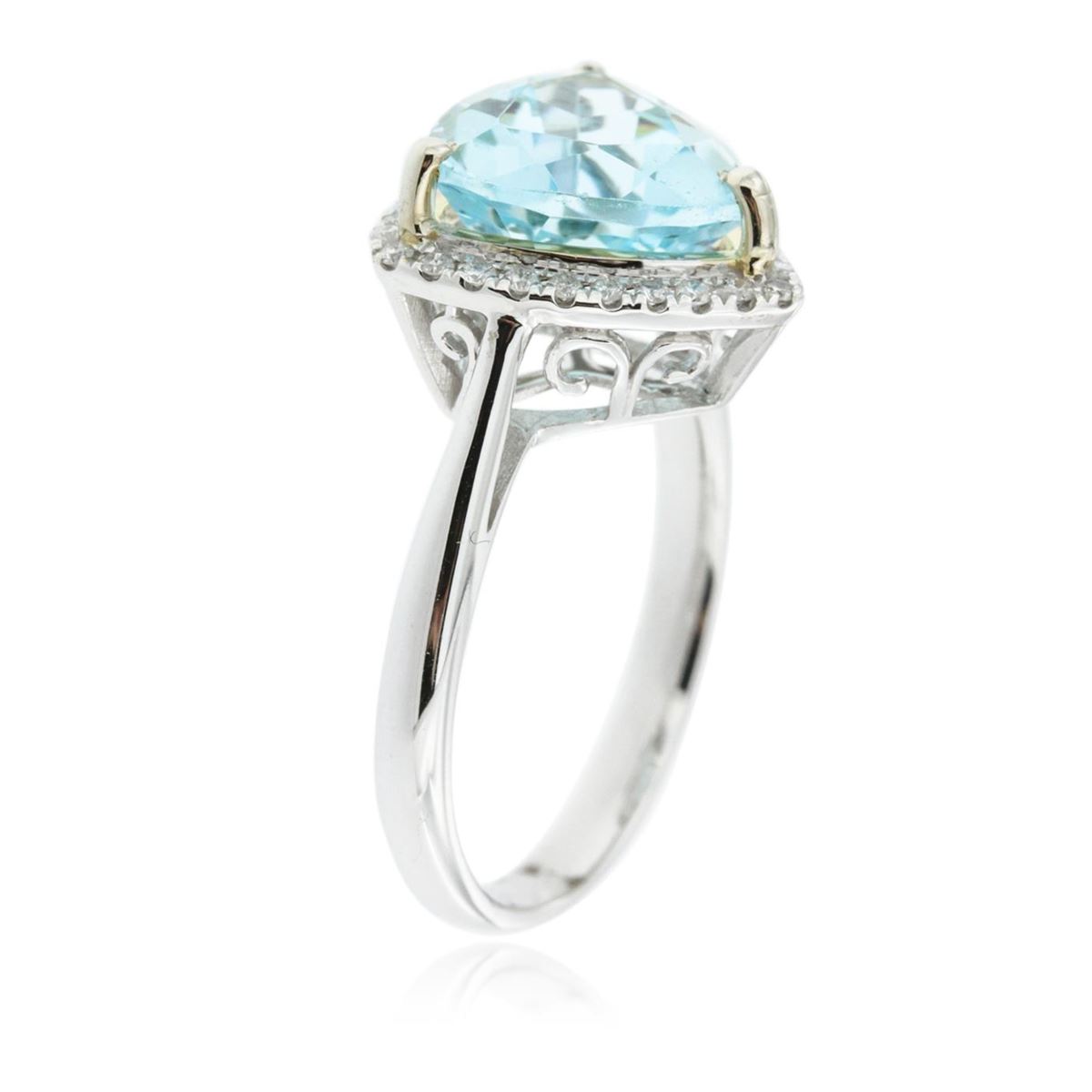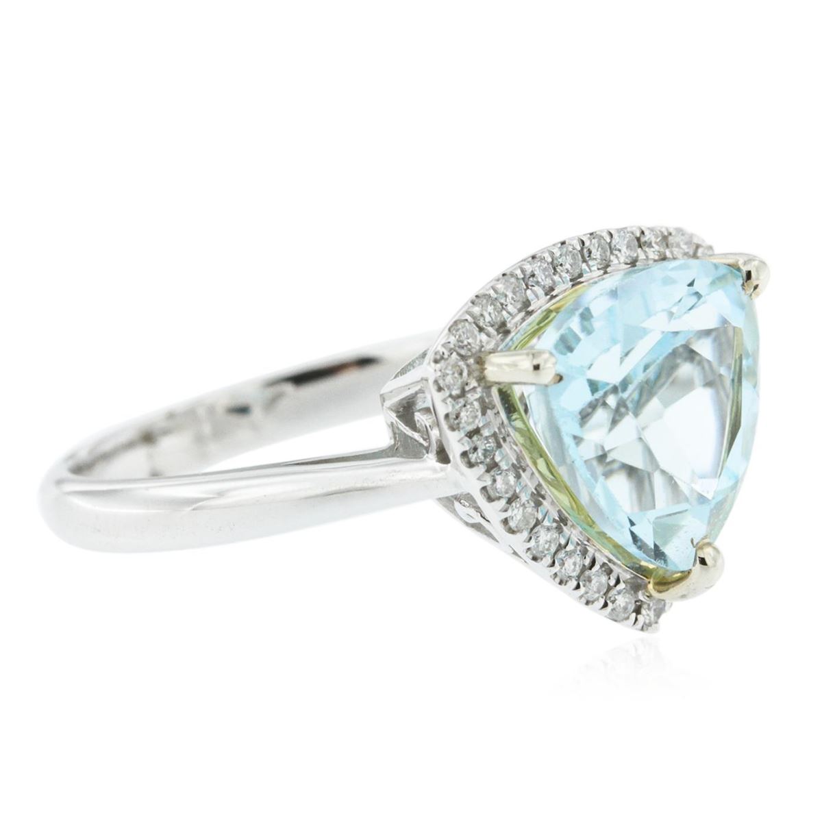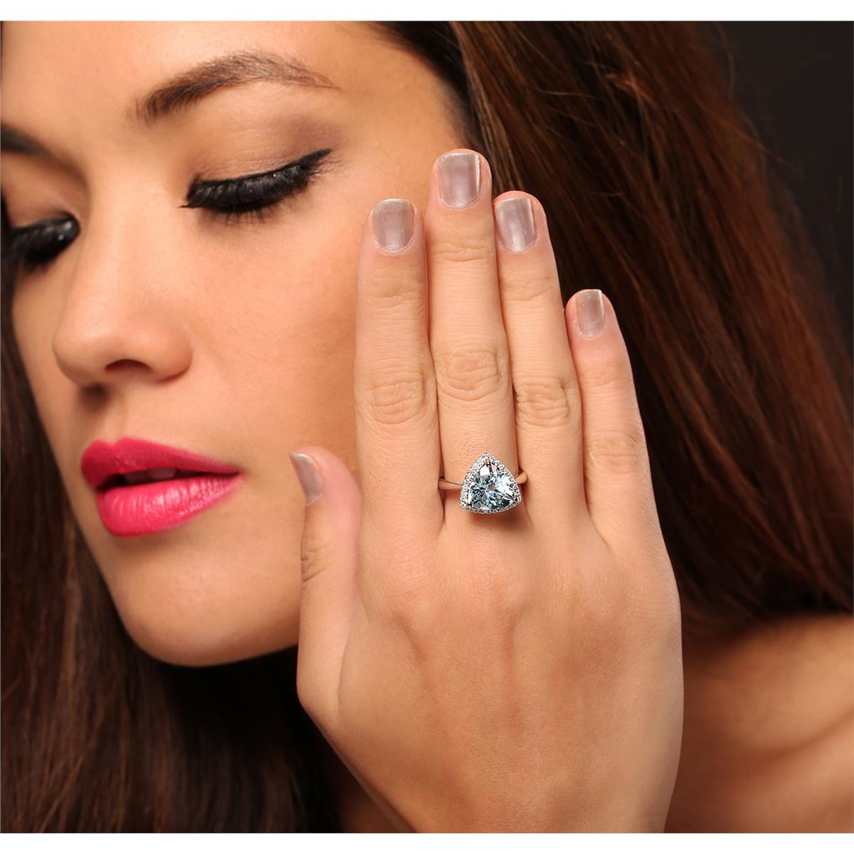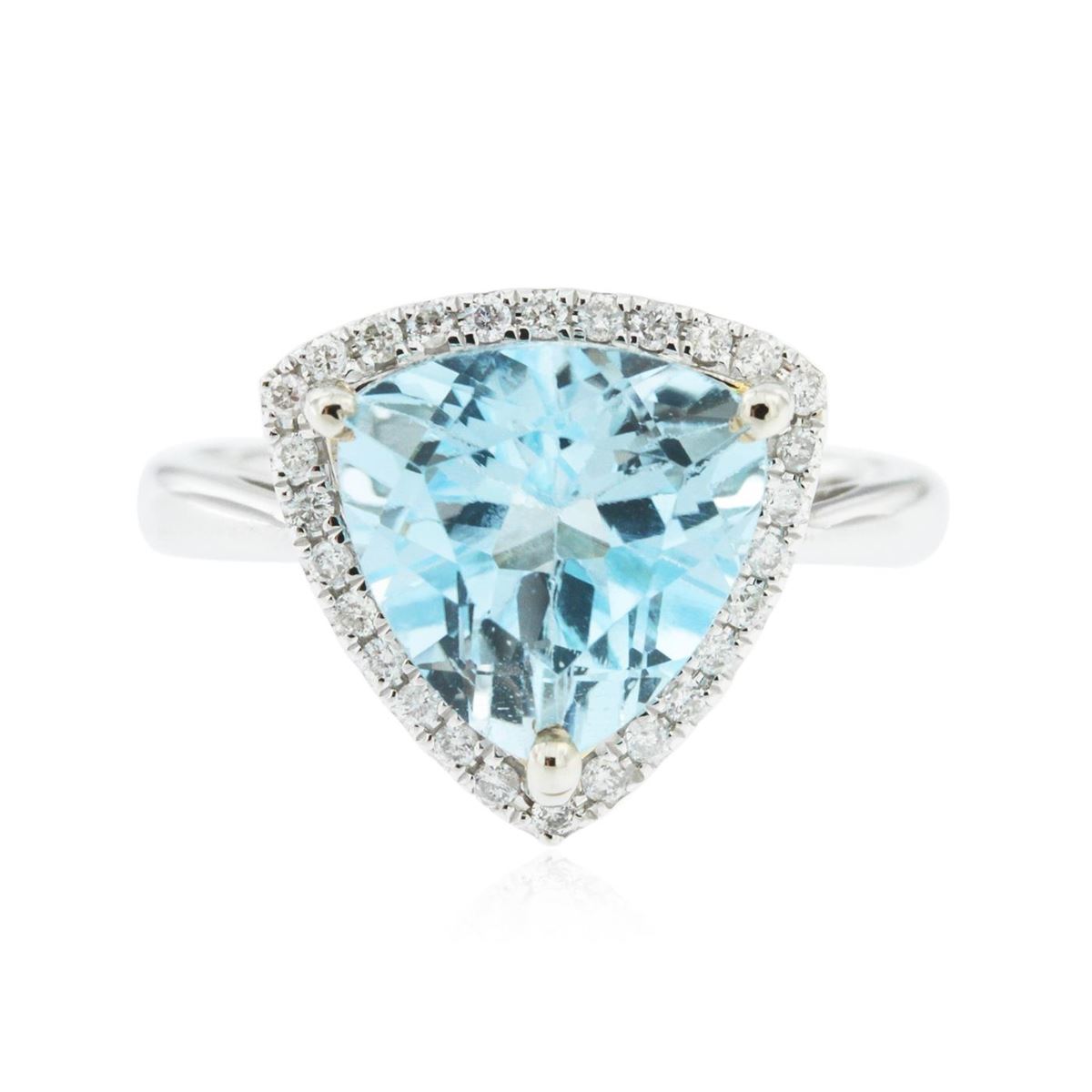 One electronically tested 14KT white gold Ladies combination cast & assembled ring with a bright polish finish. Condition is new. Identified with markings of "14K". Containing: Twenty-Eight bead set round brilliant cut diamonds, measuring 1.00 - 1.00 x 0.60mm (depth est.) approximate. Total Weight of 28 Stones = 0.22ct. Clarity: I-1 to I-2. Color: G - H, Cut is Good. One prong set triangle modified brilliant cut natural blue topaz, measuring 11.60 x 11.60 x 7.54mm, exact weight 4.50ct., clarity is eye clean, type I, medium light, very slightly grayish, blue color, (GIA B 4/3), cut is very good. Colored gemstones are presumed to have been subjected to commonly used color/clarity enhancement processes. Total Weight of Colored Stones 4.50ct. Total Weight of Diamonds 0.22ct. Total Weight of Ring 4.70 grams. GGL Appraised at $3,390.00.