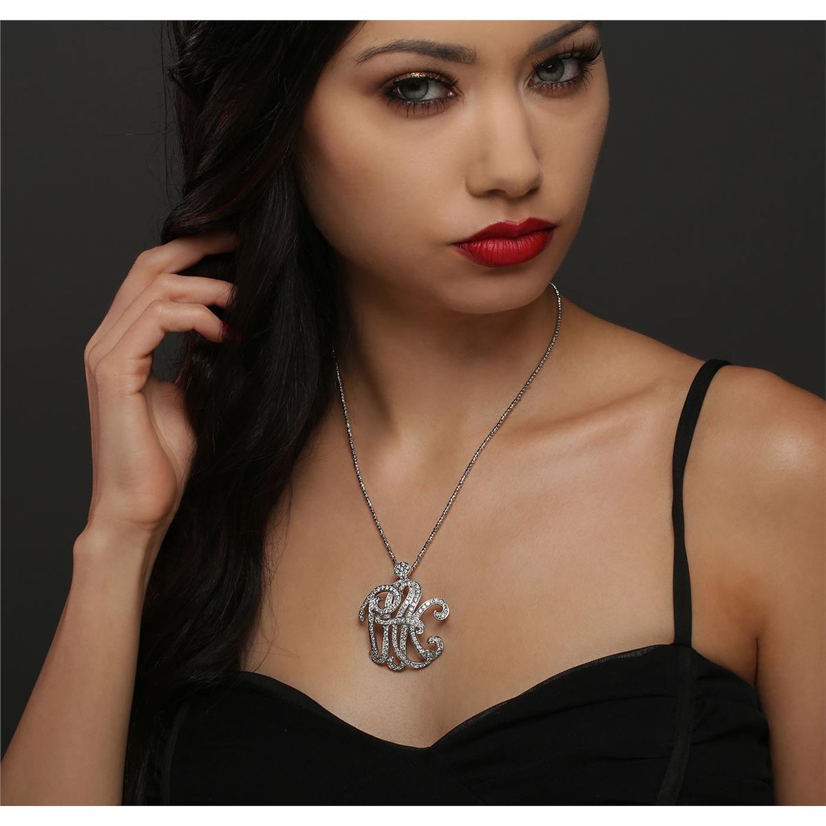 One electronically tested 14KT white gold ladies cast & assembled diamond monogram pendant with chain. The pendant features the work "PINK" in script lettering, completed by a diamond set bail. The pendant is supported by an eighteen inch length 14KT white gold designer style chain, terminating in a lobster claw clasp. Bright polish finish with milgrain detailing. Condition is good. Containing: One Hundred Forty-Three bead set round brilliant cut diamonds, measuring 2.10 - 1.95 x 1.22mm (depth est.) approximate total weight of 143 Stones = 4.50ct. Graded in the setting. Clarity: VS-1 to VS-2. Color: G - I. Total Weight of Diamonds 4.50ct. Total Weight of Monogram Pendant With Chain 18.94 grams. AIG Appraised at $19,430.00.